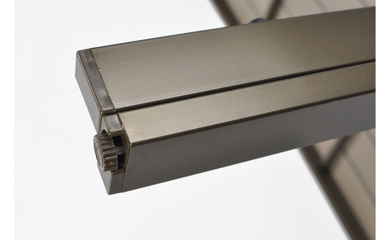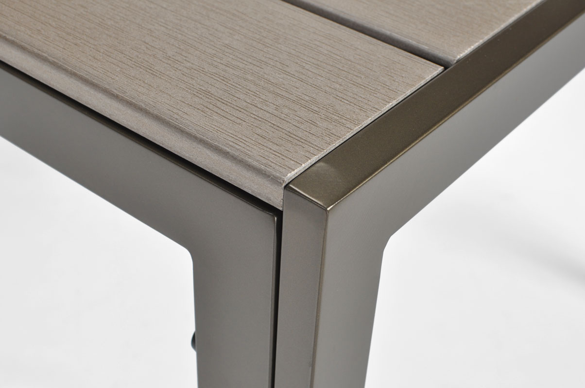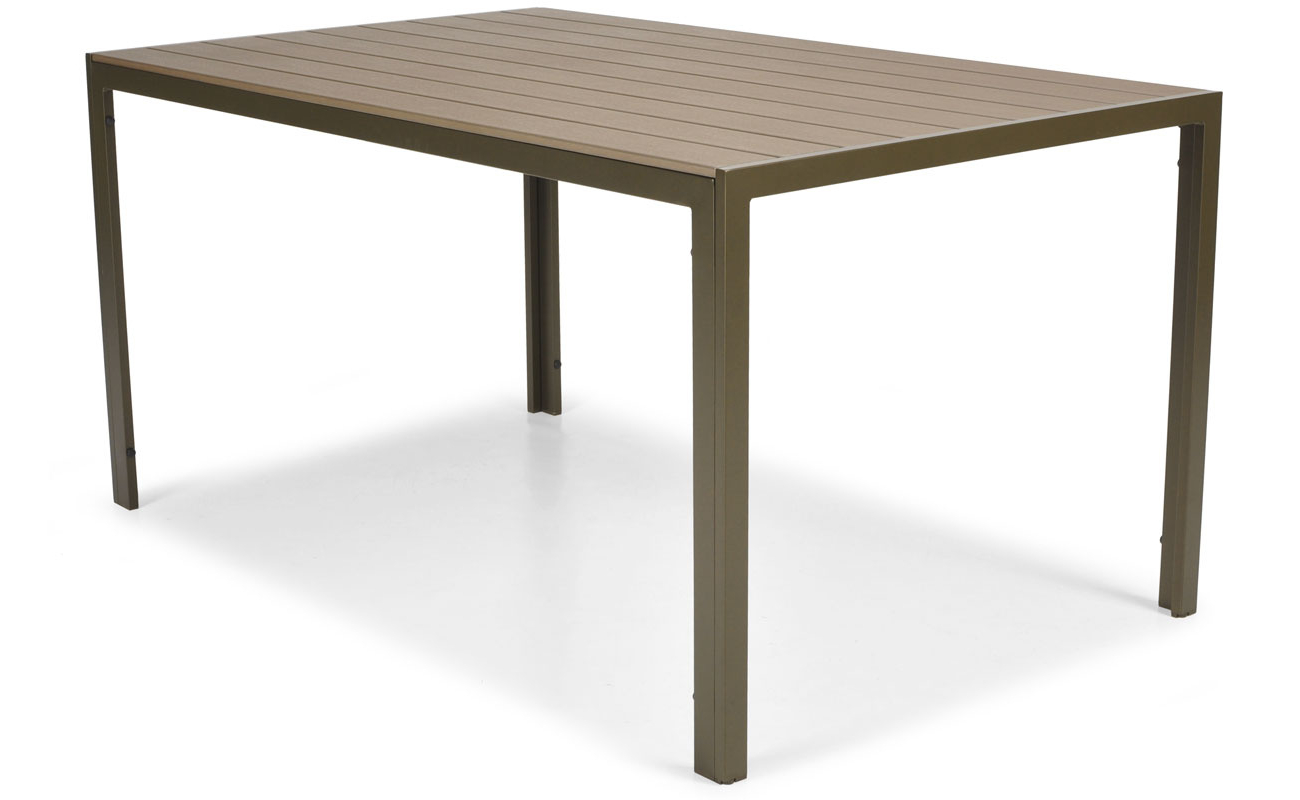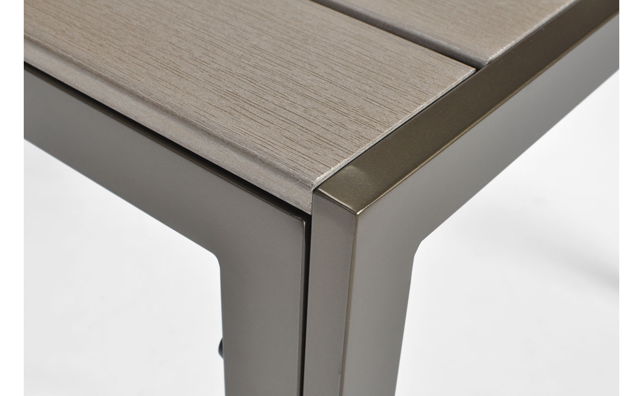 Stół ma prostokątny blat o wymiarach 150 × 90 cm, wykonany z desek kompozytowych WPC. Ten materiał wygląda jak drewno, ale jest bardziej odporny na wilgoć, promienie UV i zmiany temperatur. Dzięki temu stół zachowuje ładny wygląd przez wiele sezonów bez konieczności specjalnej pielęgnacji. Stabilna aluminiowa konstrukcja malowana proszkowo na brązowo chroni przed uszkodzeniami i korozją. Stół idealnie sprawdza się podczas rodzinnych obiadów i spotkań na świeżym powietrzu.