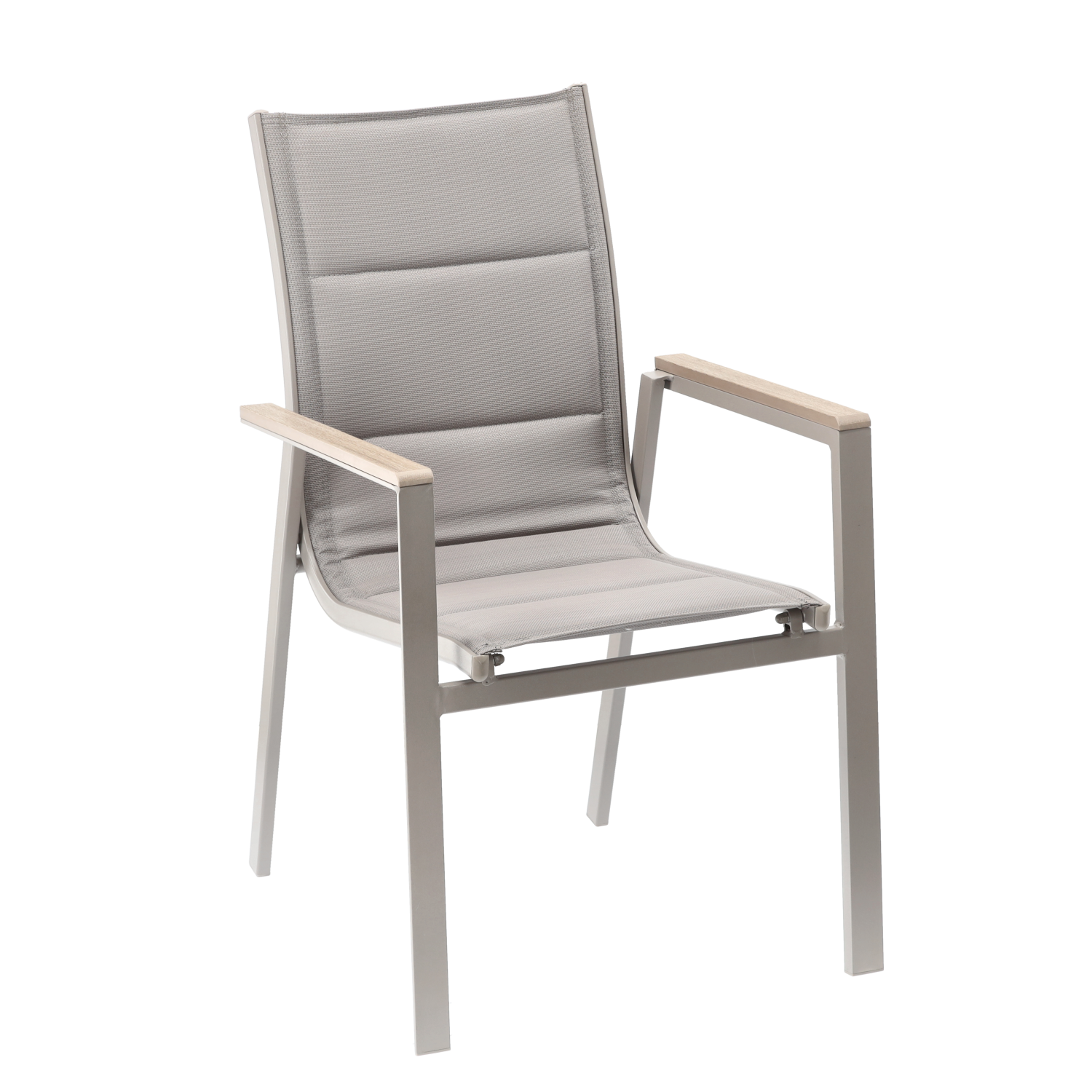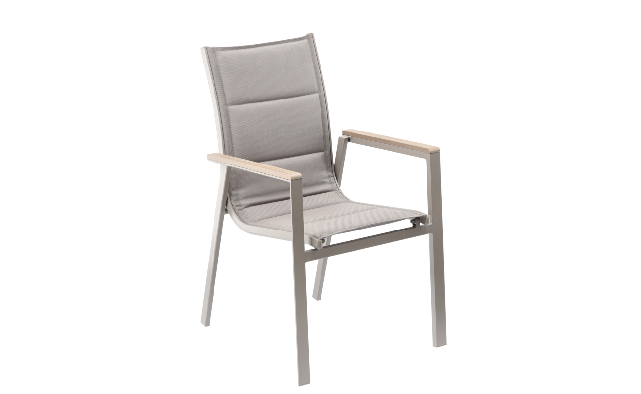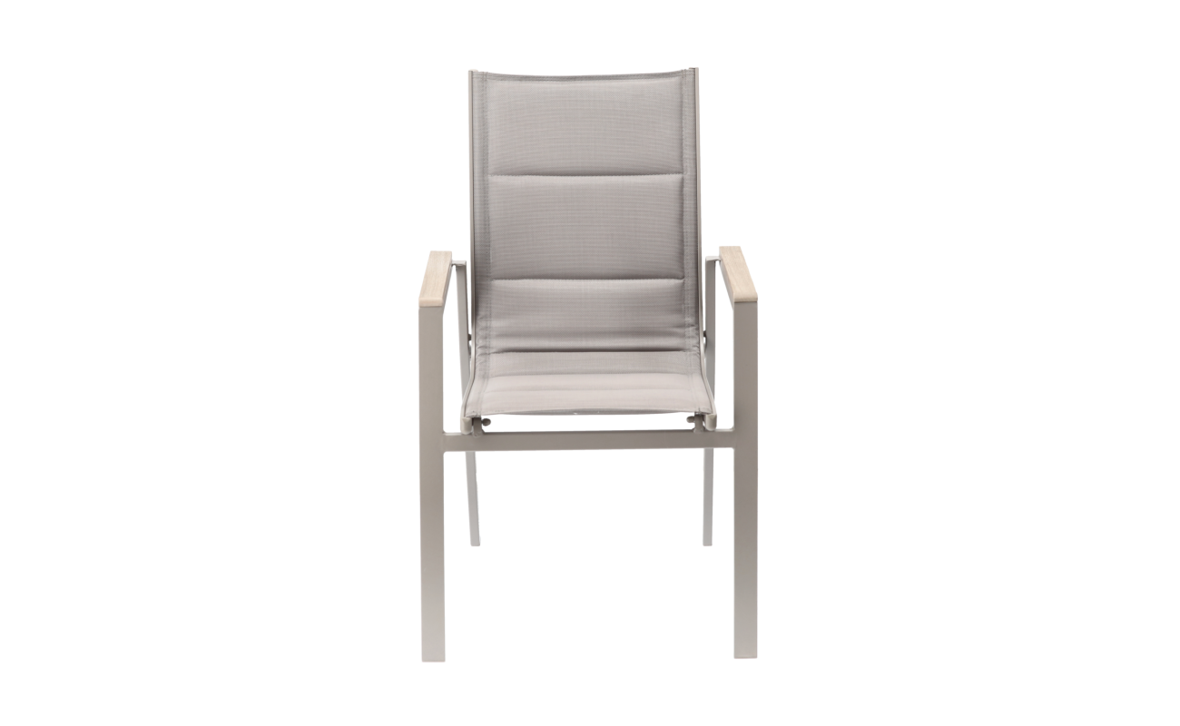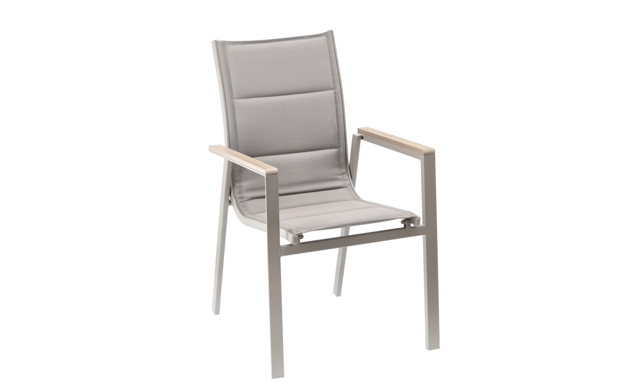 Siedzisko i oparcie wykonano z wysokiej jakości siatki Textilene 2×1 z miękką wyściółką, która dopasowuje się do kształtu ciała. Dzięki temu aluminiowe ogrodowe krzesło  zapewnia wyjątkowy komfort nawet podczas długiego siedzenia.