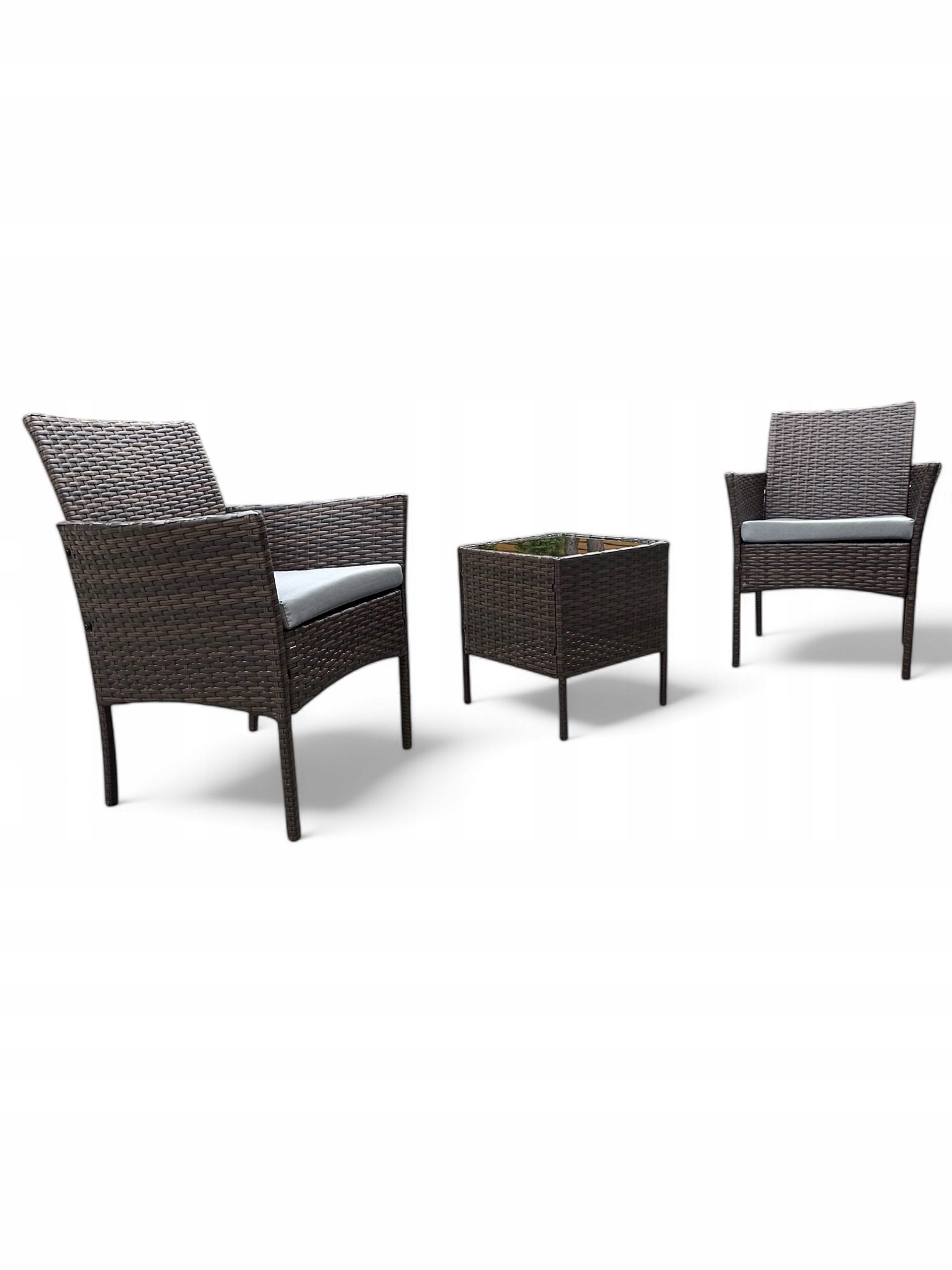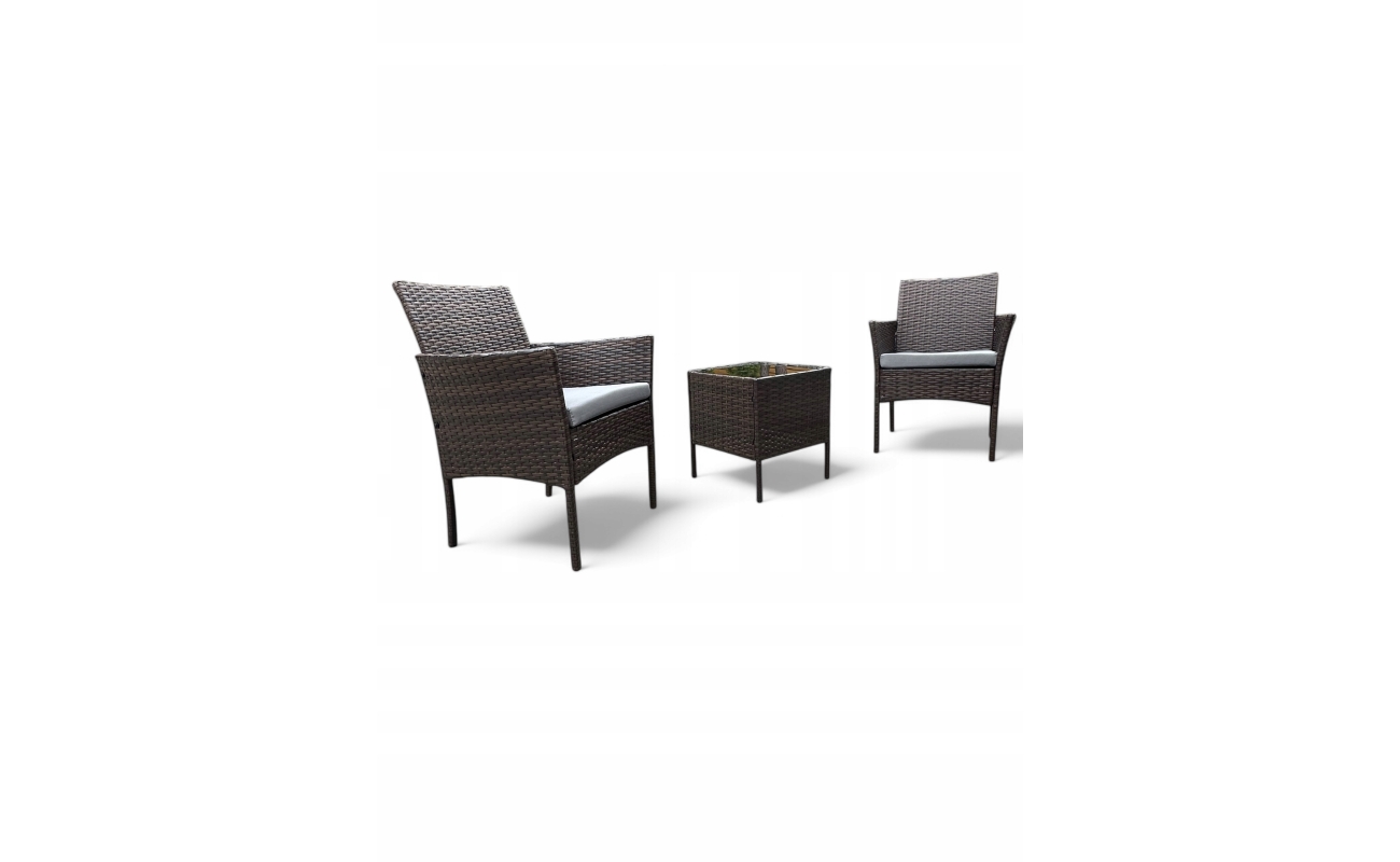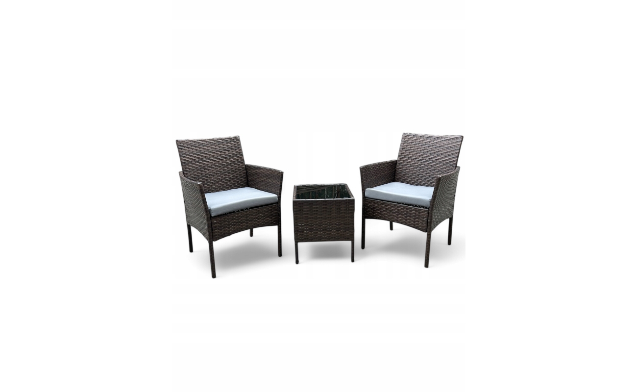 Brązowy technorattanowy zestaw dwuosobowy składa się z dwóch foteli z poduszkami oraz stolika ze szklanym blatem.
