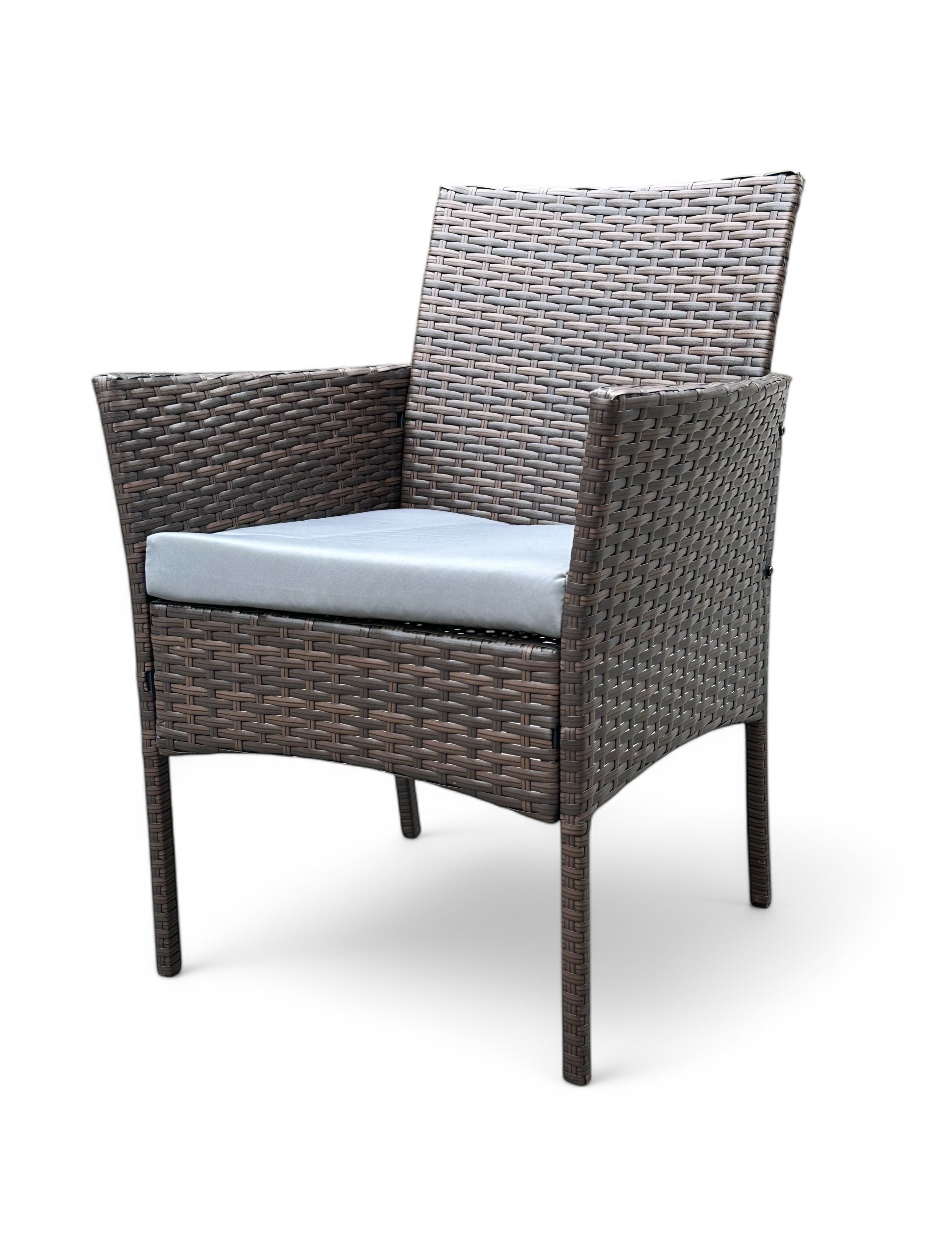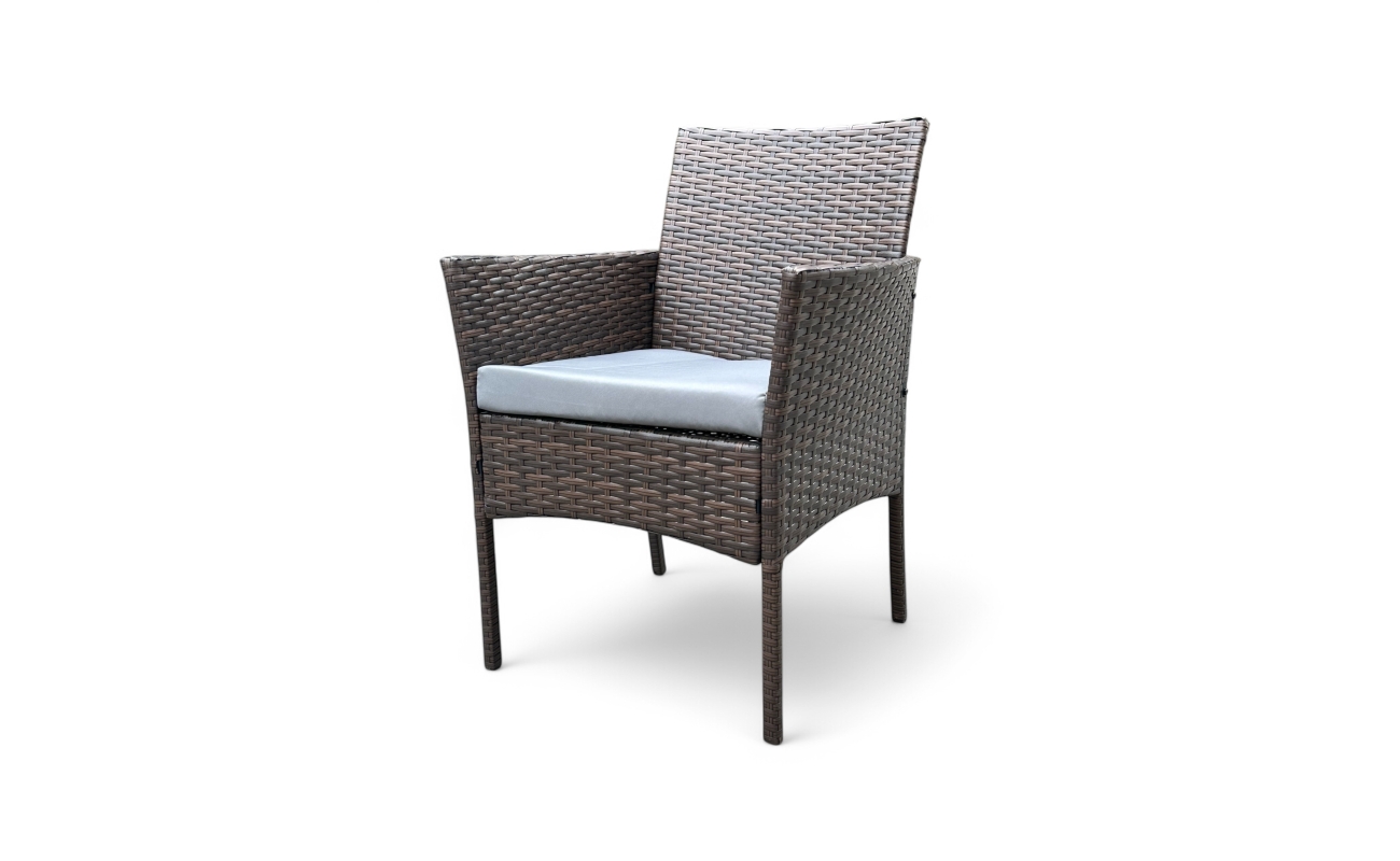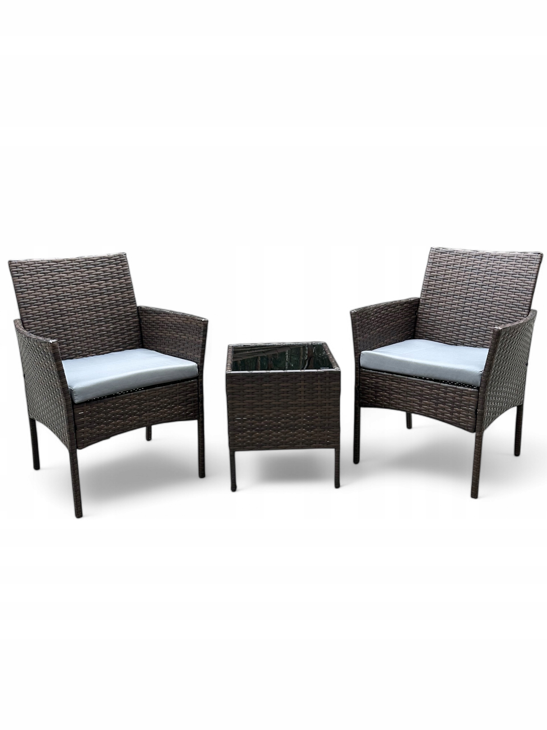 Brązowy technorattanowy zestaw dwuosobowy składa się z dwóch foteli z poduszkami oraz stolika ze szklanym blatem.