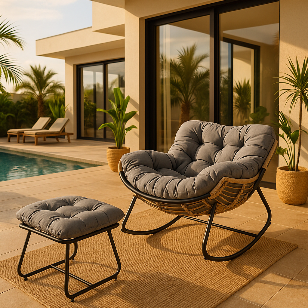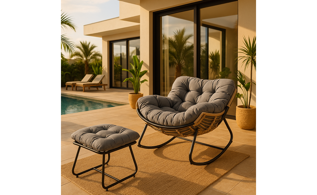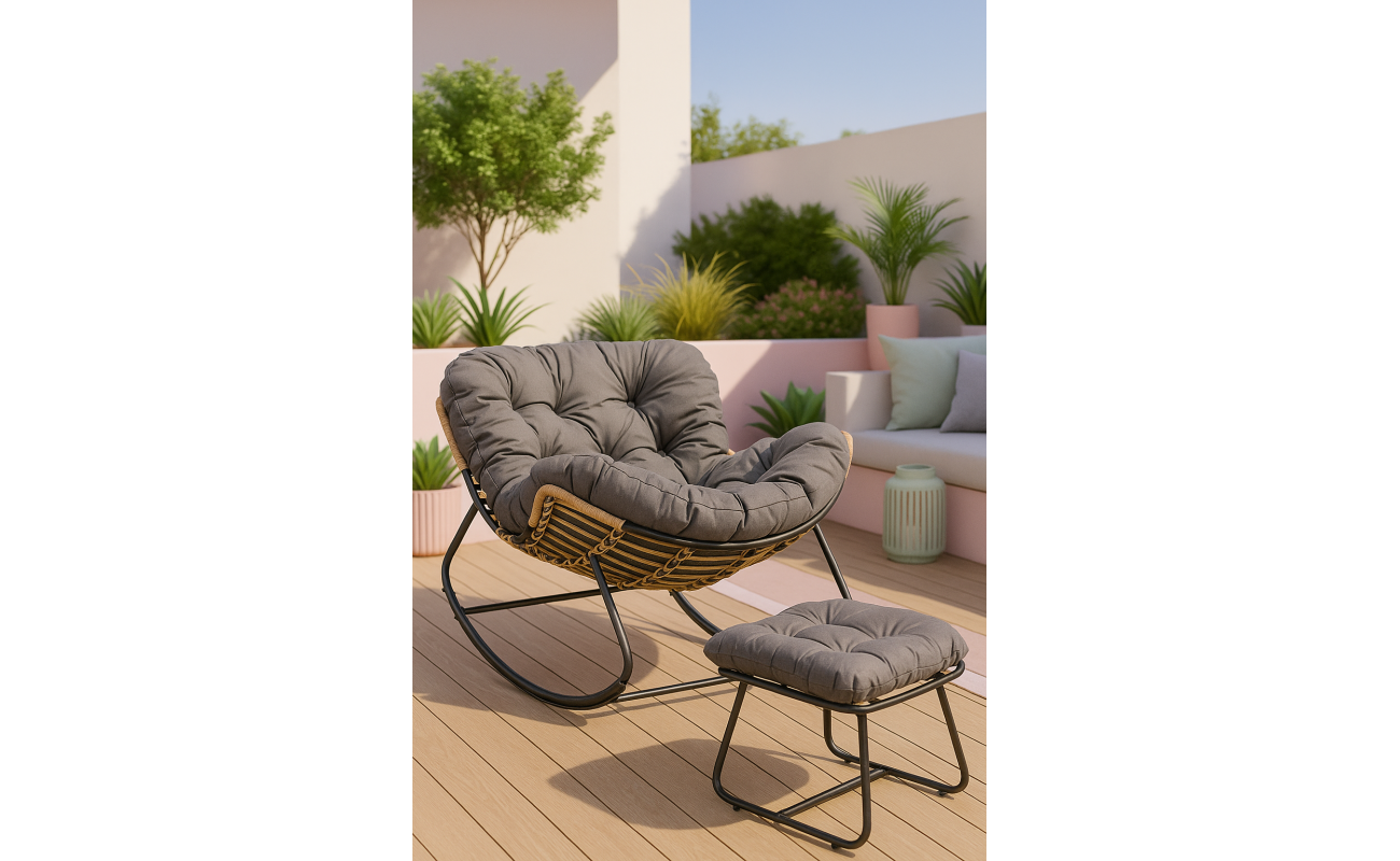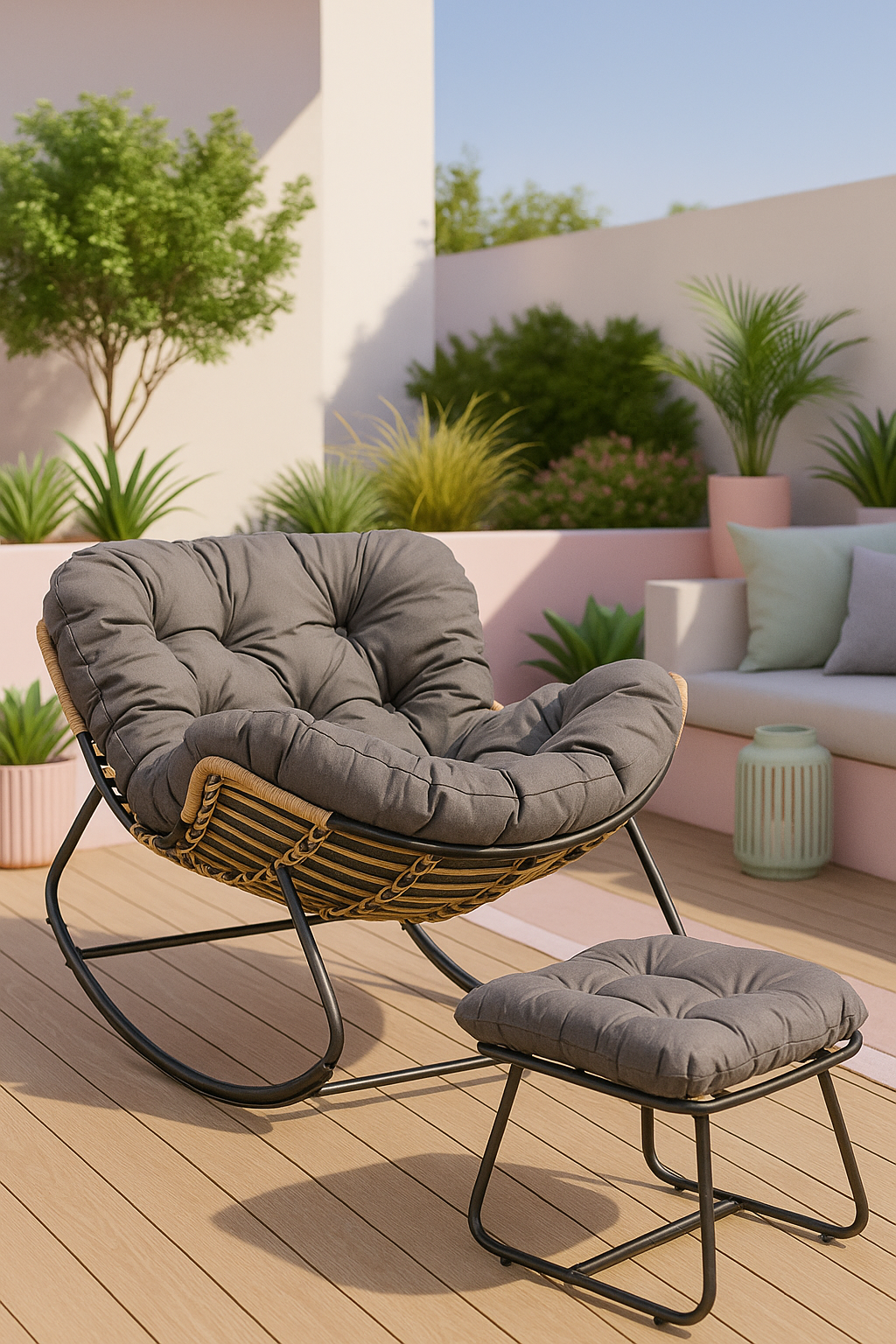 Ten unikalny zestaw stworzony został z myślą o tych, którzy pragną odpoczywać z klasą – zarówno na tarasie, jak i w ogrodzie. Połączenie bujanego fotela z wygodnym podnóżkiem to rozwiązanie, które pokochasz od pierwszego użycia. Dzięki temu możesz rozsiąść się wygodnie, oprzeć nogi i w pełni zanurzyć się w chwili relaksu.