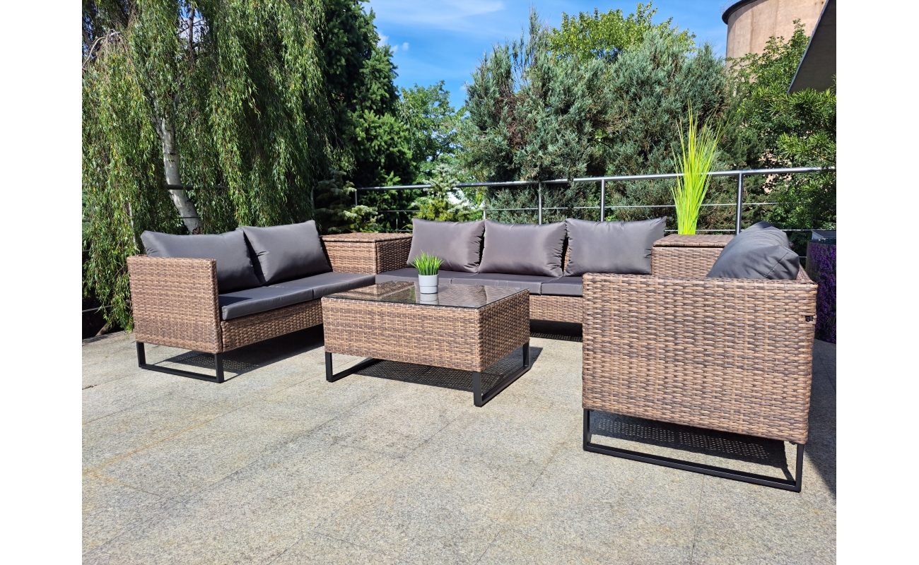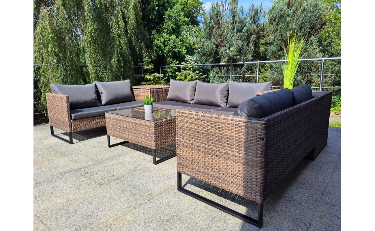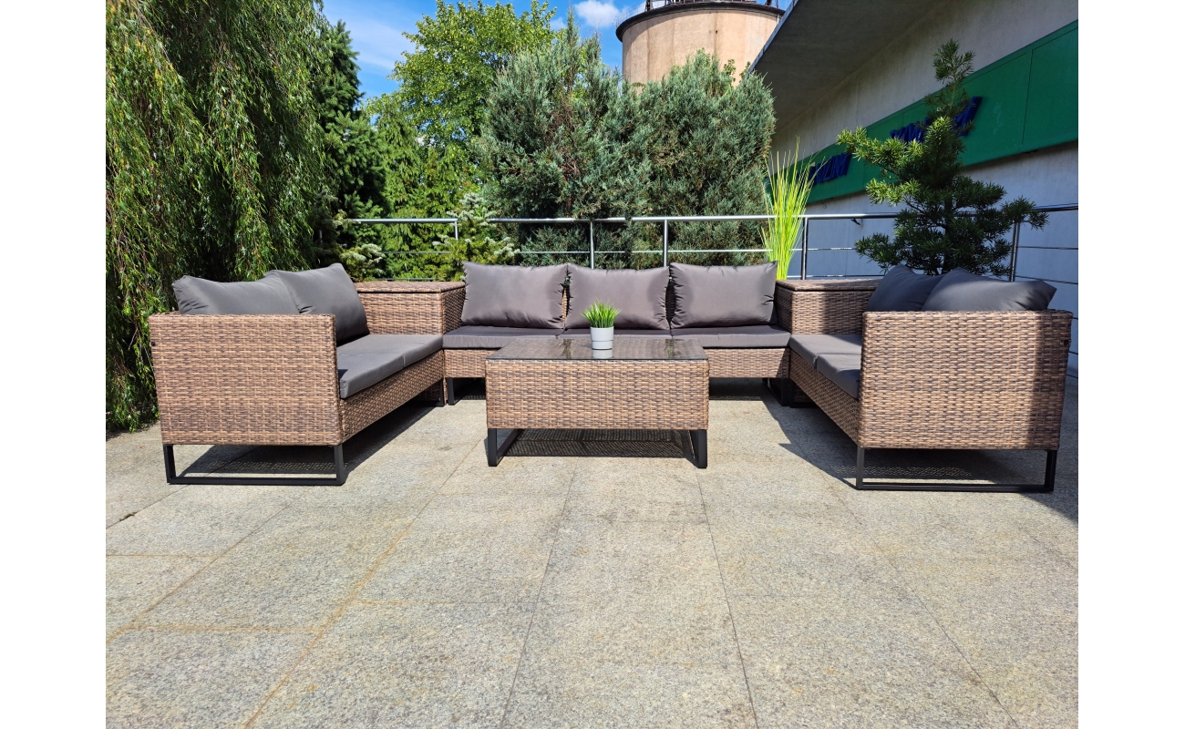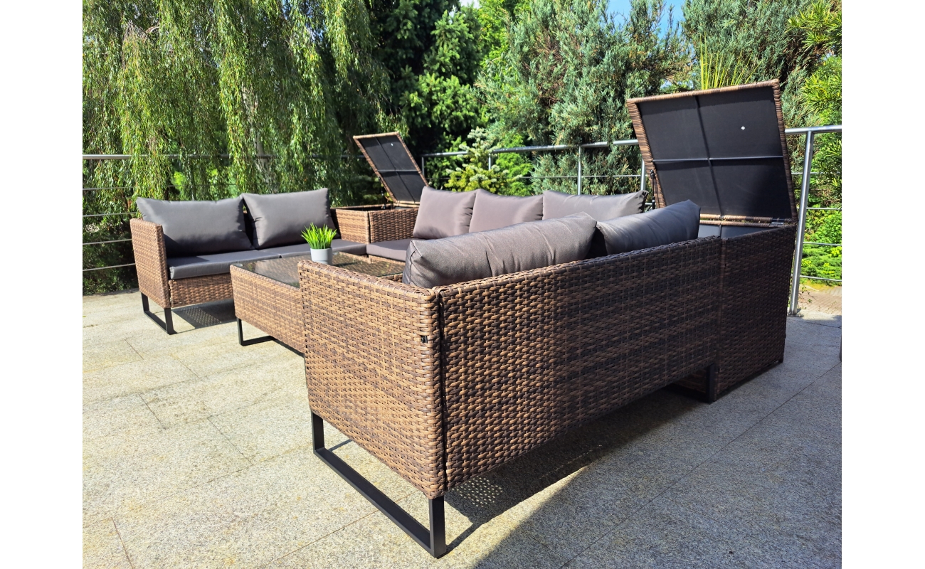 Dzięki obecności skrzyń, zyskujesz miejsce na przechowywanie poduszek lub drobiazgów, które chcesz mieć pod ręką. Jednocześnie, skrzynie pełnią funkcję praktycznych stolików, co zwiększa funkcjonalność całego zestawu.