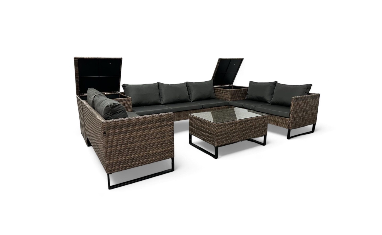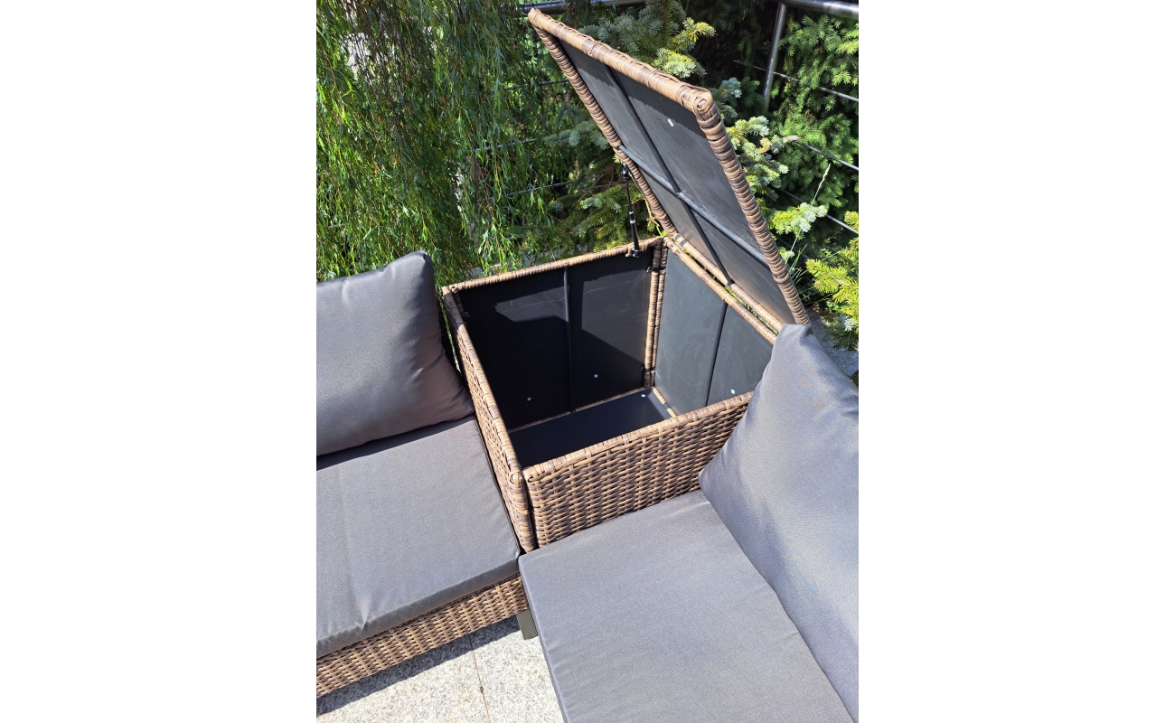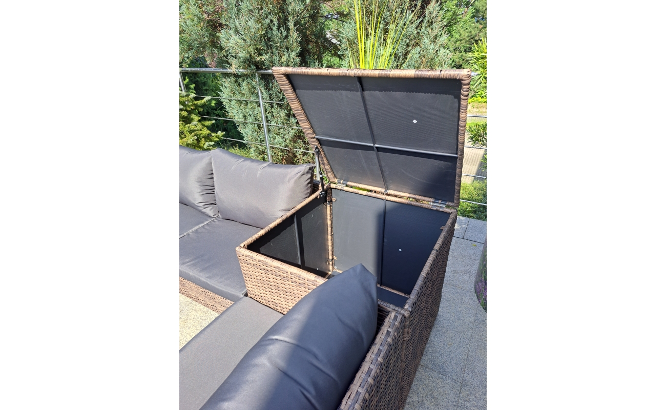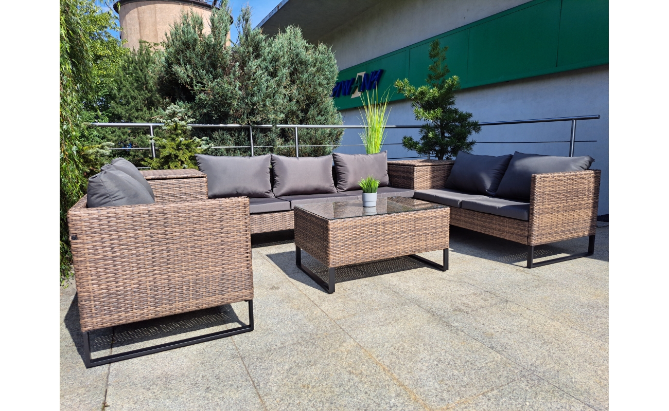 Dzięki obecności skrzyń, zyskujesz miejsce na przechowywanie poduszek lub drobiazgów, które chcesz mieć pod ręką. Jednocześnie, skrzynie pełnią funkcję praktycznych stolików, co zwiększa funkcjonalność całego zestawu.