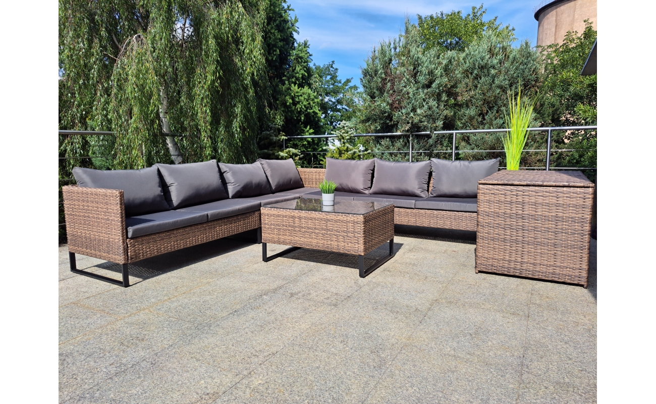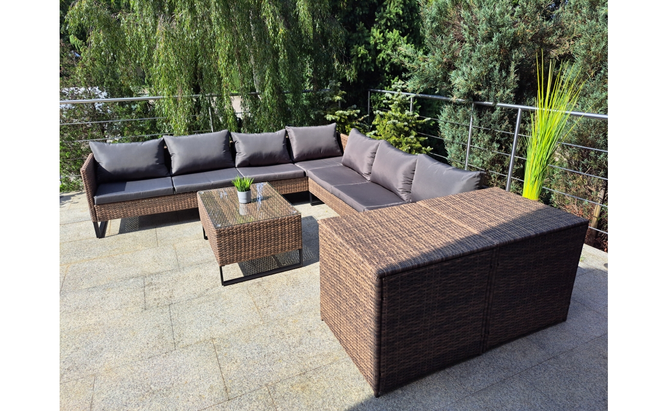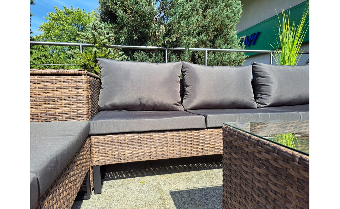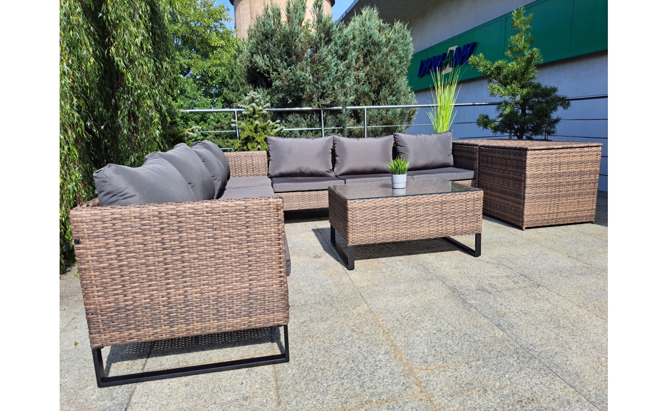 Duży narożnik ogrodowy modułowy w kolorze jasny brąz to połączenie stylu i wygody. Z jednej strony zapewnia on komfort i funkcjonalność, z drugiej wyróżnia się nowoczesnym designem. Dzięki swojej modułowej konstrukcji, mebel sprawdzi się w wielu układach przestrzennych – zarówno do codziennego wypoczynku, jak i do spotkań w większym gronie.