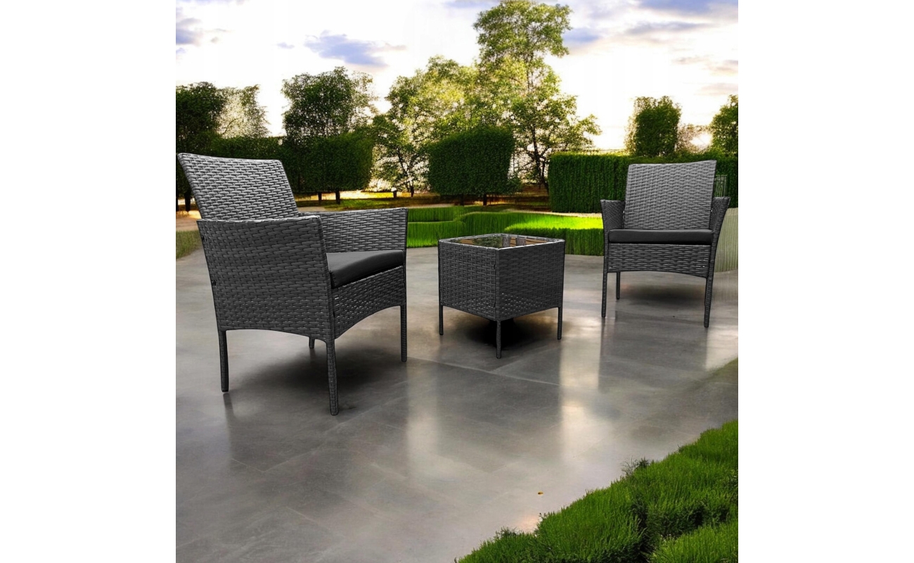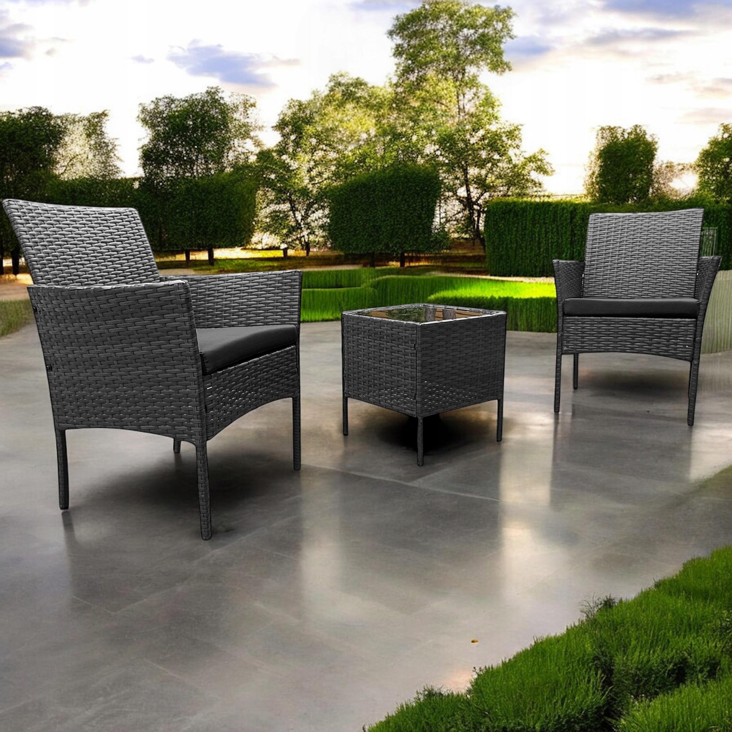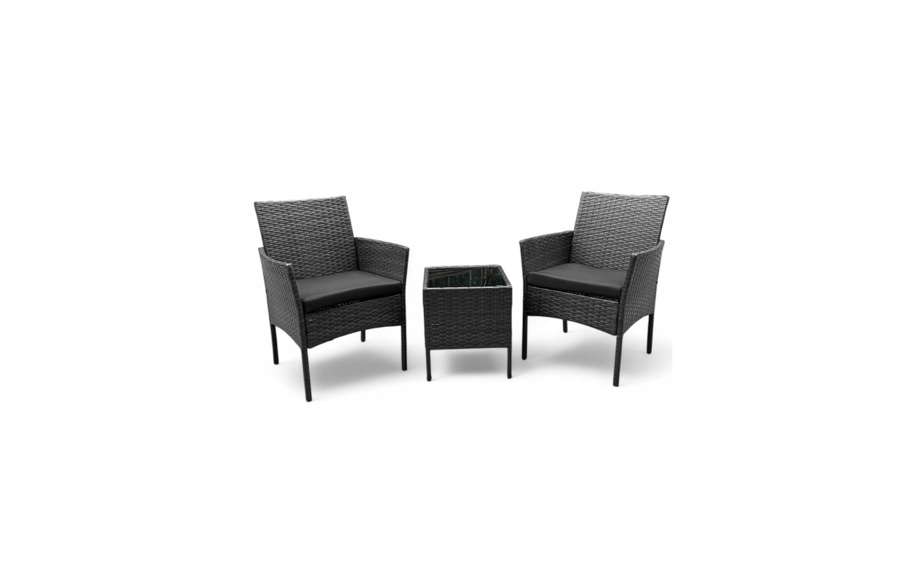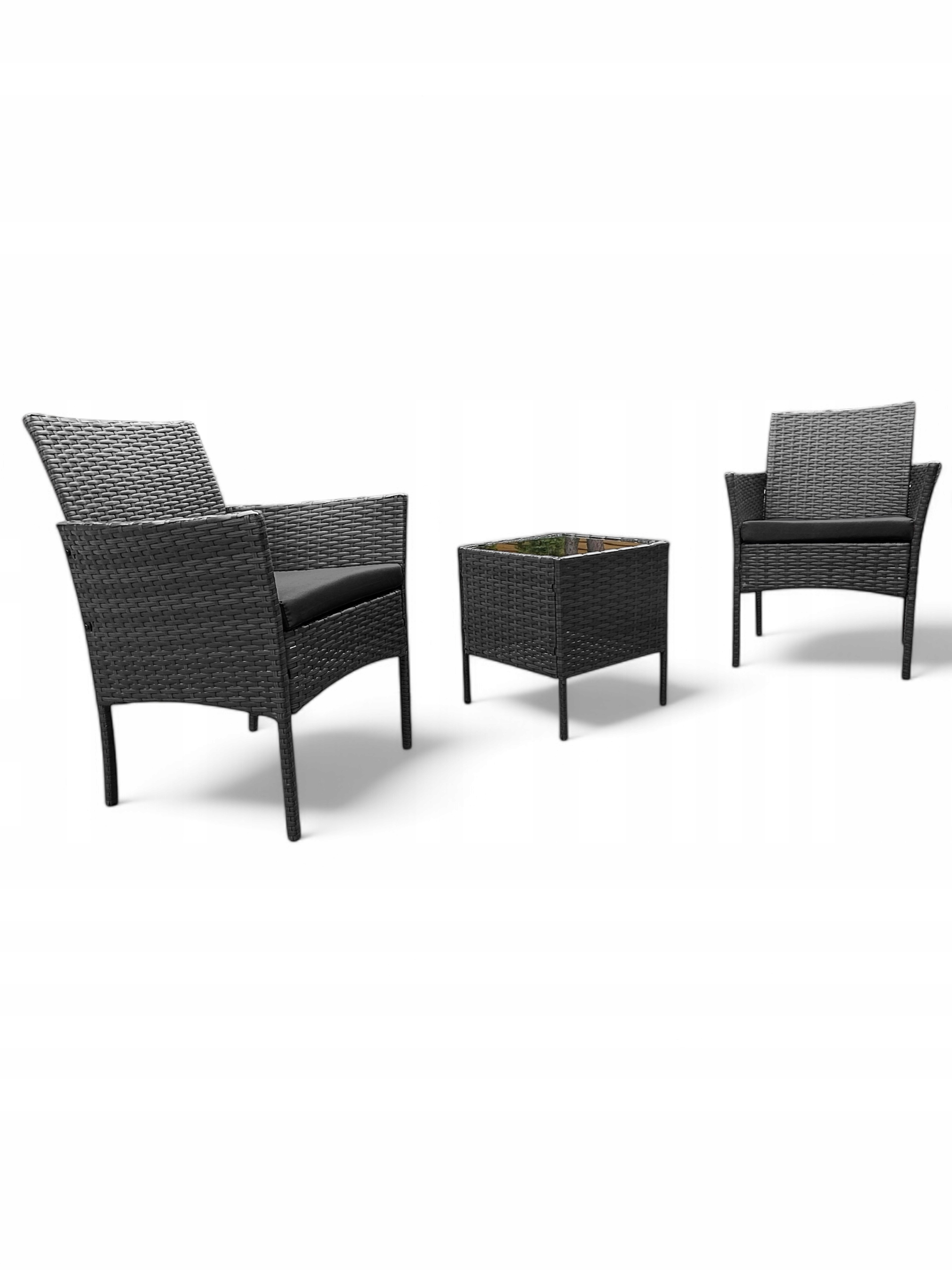 Zestaw zawiera dwa komfortowe fotele oraz stolik z blatem z hartowanego szkła.