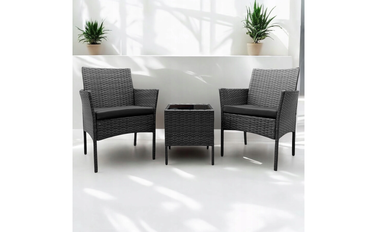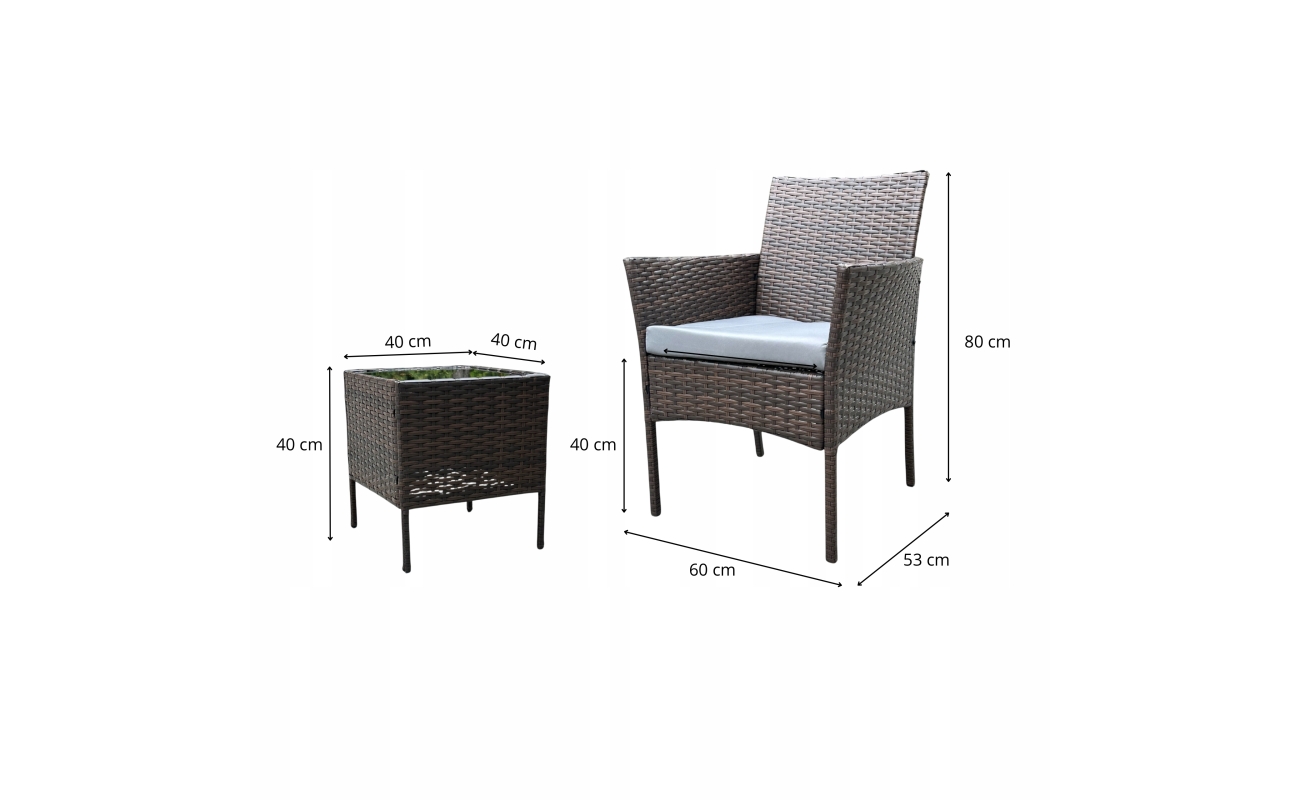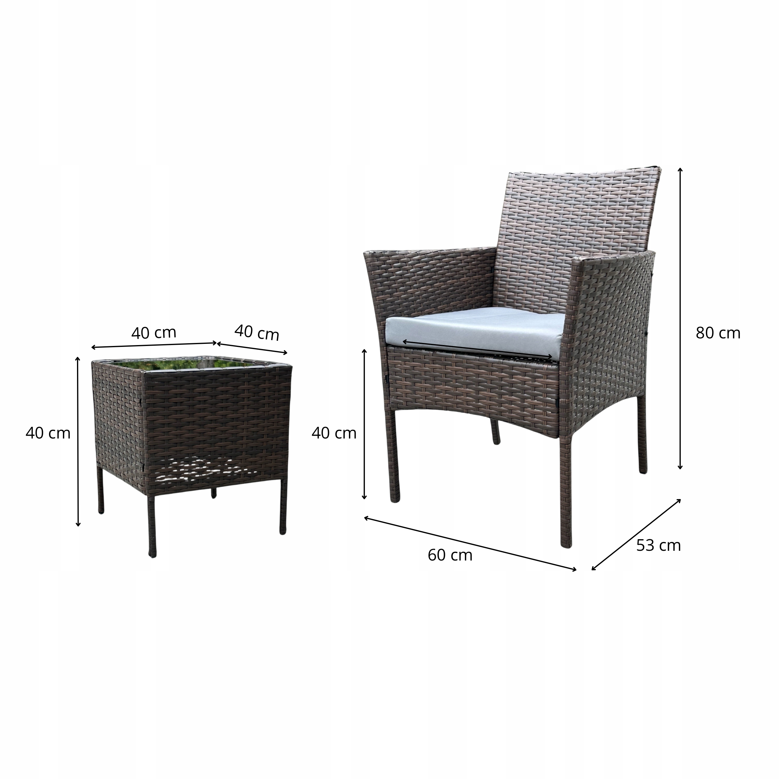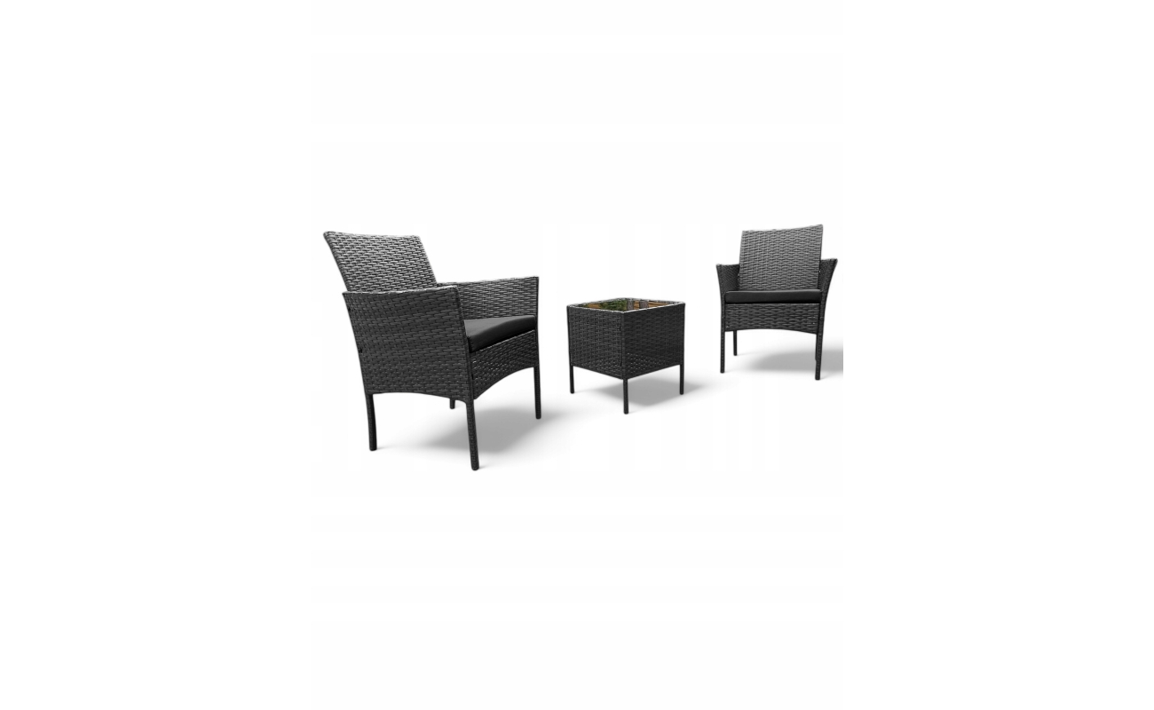 Zestaw zawiera dwa komfortowe fotele oraz stolik z blatem z hartowanego szkła.