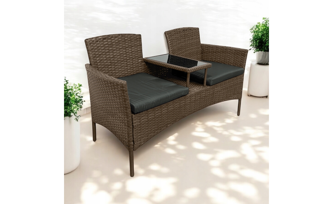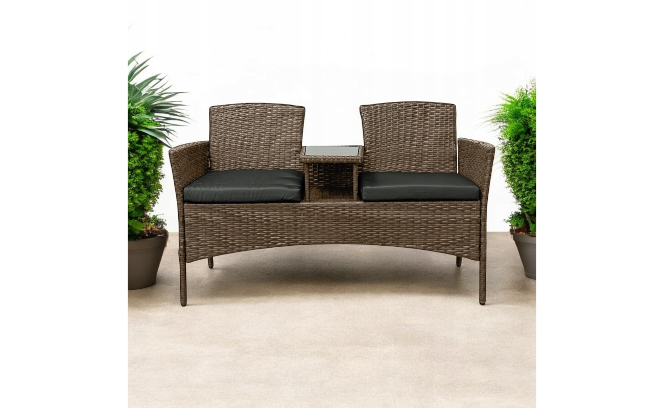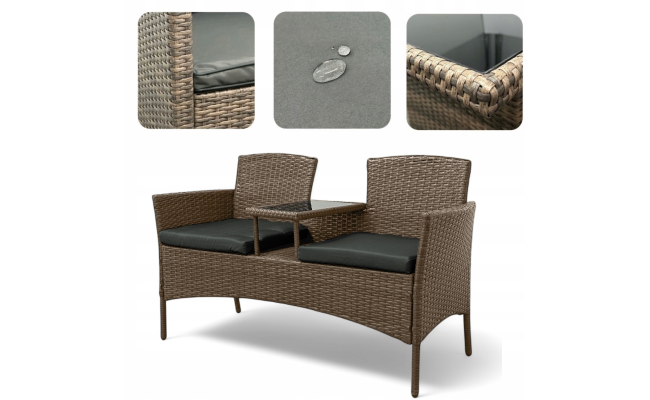 Z jednej strony oferuje komfort, z drugiej – świetnie wygląda. Wbudowany stolik ze szkła hartowanego zapewnia wygodę, ponieważ wszystko masz pod ręką. Dzięki kompaktowym wymiarom zestaw zmieści się nawet na mniejszym balkonie.