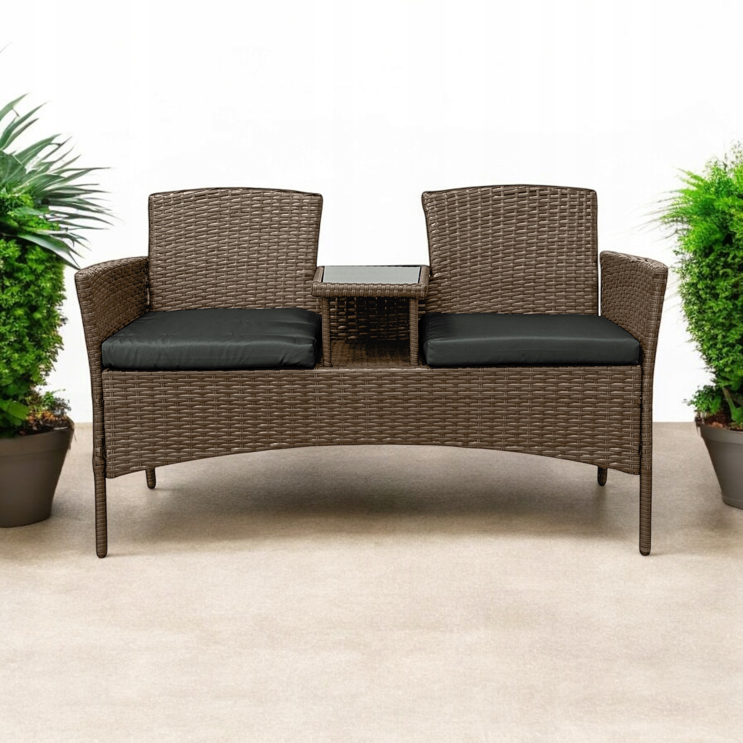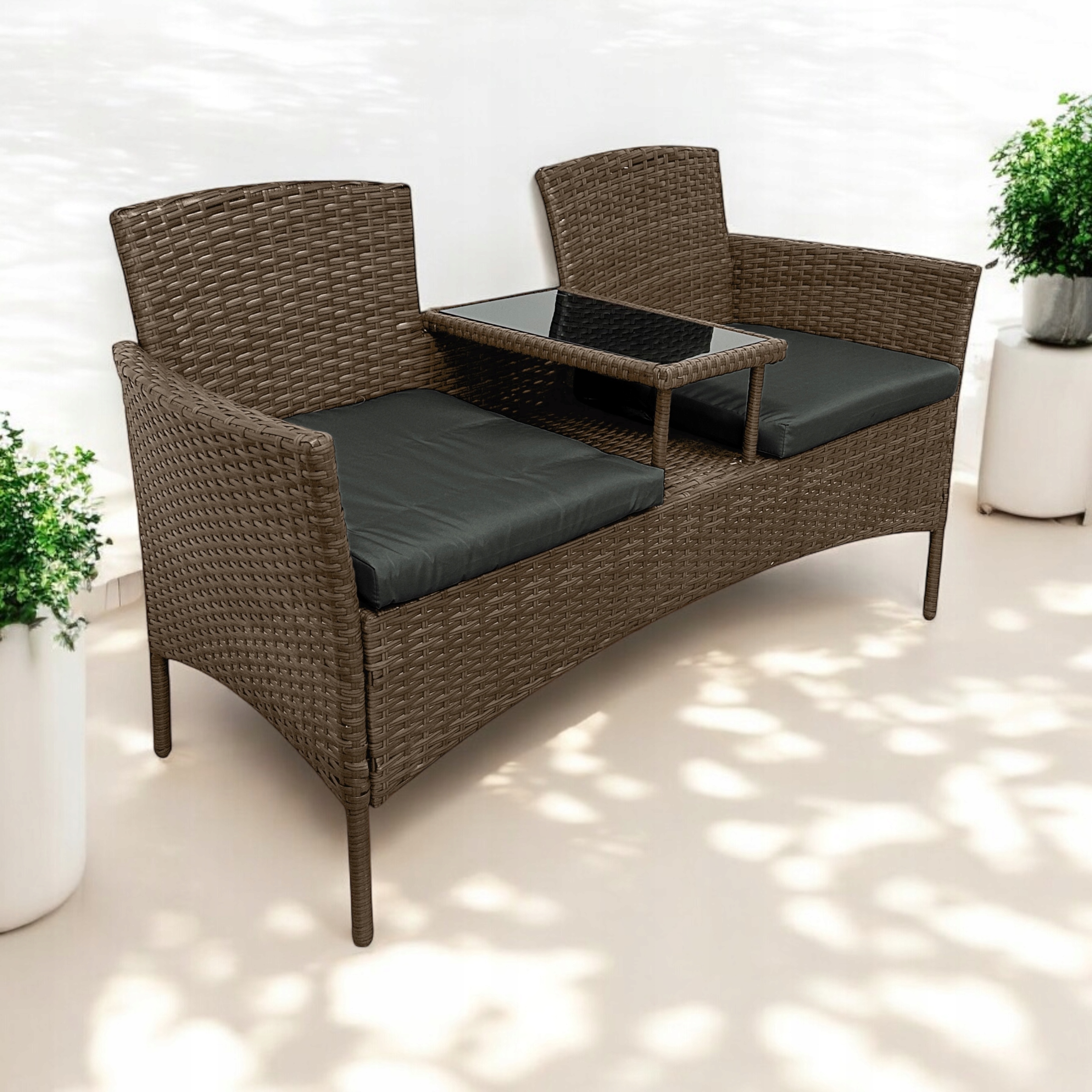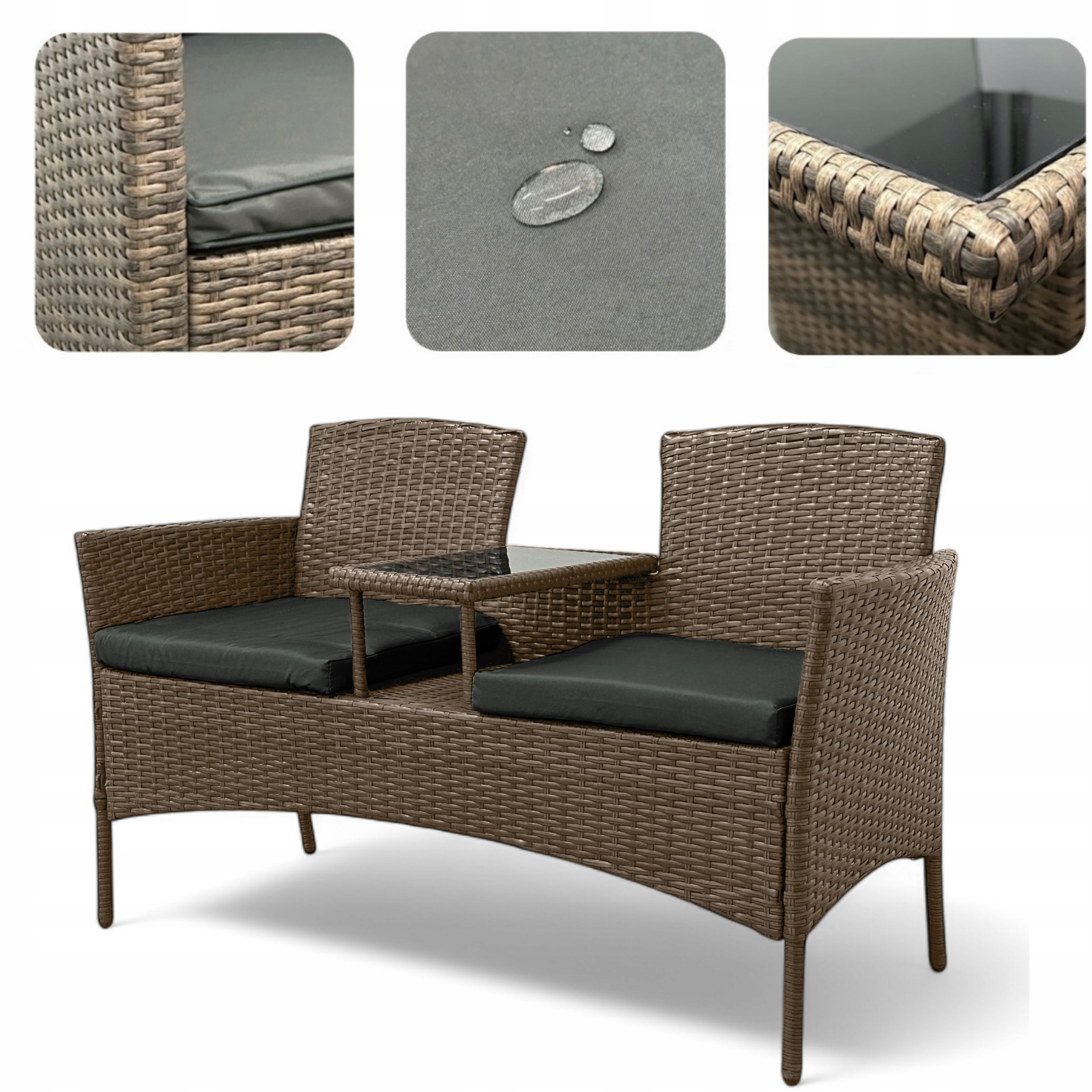 Z jednej strony oferuje komfort, z drugiej – świetnie wygląda. Wbudowany stolik ze szkła hartowanego zapewnia wygodę, ponieważ wszystko masz pod ręką. Dzięki kompaktowym wymiarom zestaw zmieści się nawet na mniejszym balkonie.