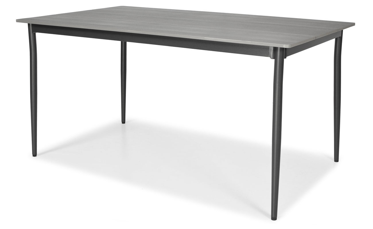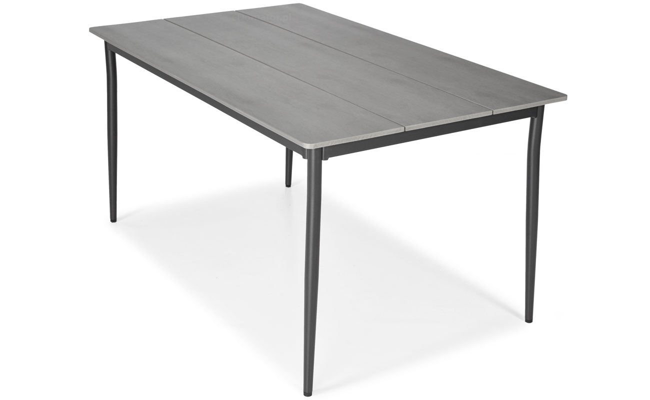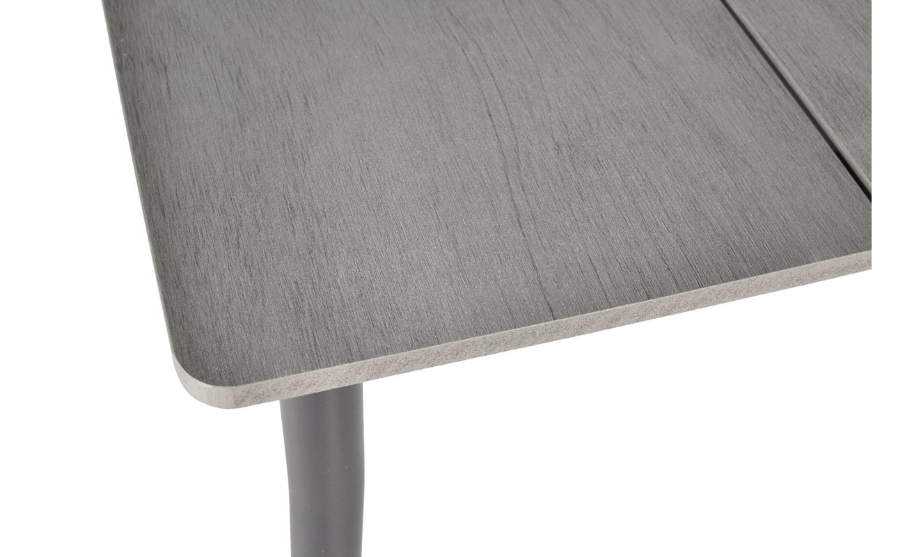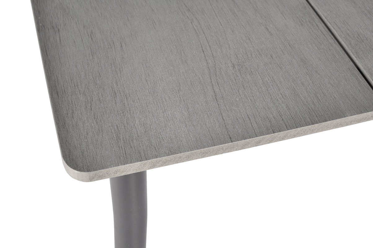 Centralnym punktem zestawu jest elegancki stół ogrodowy jadalniany z prostokątnym blatem o optymalnych wymiarach, który pomieści dania, napoje i wszystkie niezbędne akcesoria. Blat wykonano z wytrzymałego materiału WPC, który łączy wygląd naturalnego drewna z odpornością na wilgoć, promienie UV i zmienne warunki atmosferyczne. Szara kolorystyka blatu doskonale współgra z resztą zestawu, tworząc spójną i estetyczną całość.
