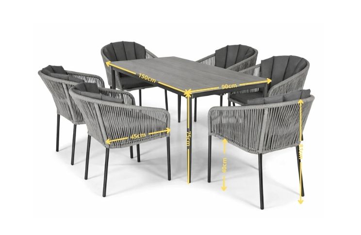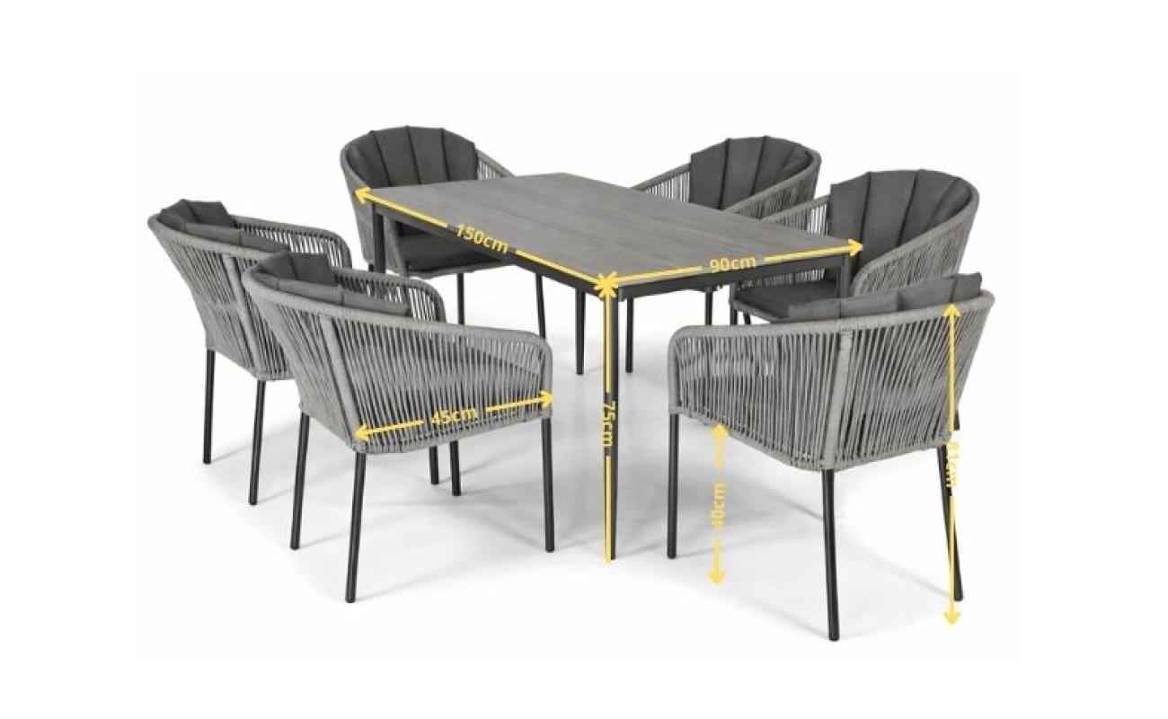 W zestawie znajduje się sześć wygodnych foteli, które łączą stylowy wygląd z wysoką ergonomią. Każdy fotel został wykonany z lekkiego, a zarazem wytrzymałego aluminium, co sprawia, że są łatwe do przenoszenia i odporne na działanie czynników atmosferycznych. Siedziska i oparcia pokryte są oddychającą tkaniną textilene, która gwarantuje komfort nawet podczas długiego użytkowania. Fotele zapewniają odpowiednie podparcie pleców i są idealne zarówno do relaksu, jak i spożywania posiłków na świeżym powietrzu.