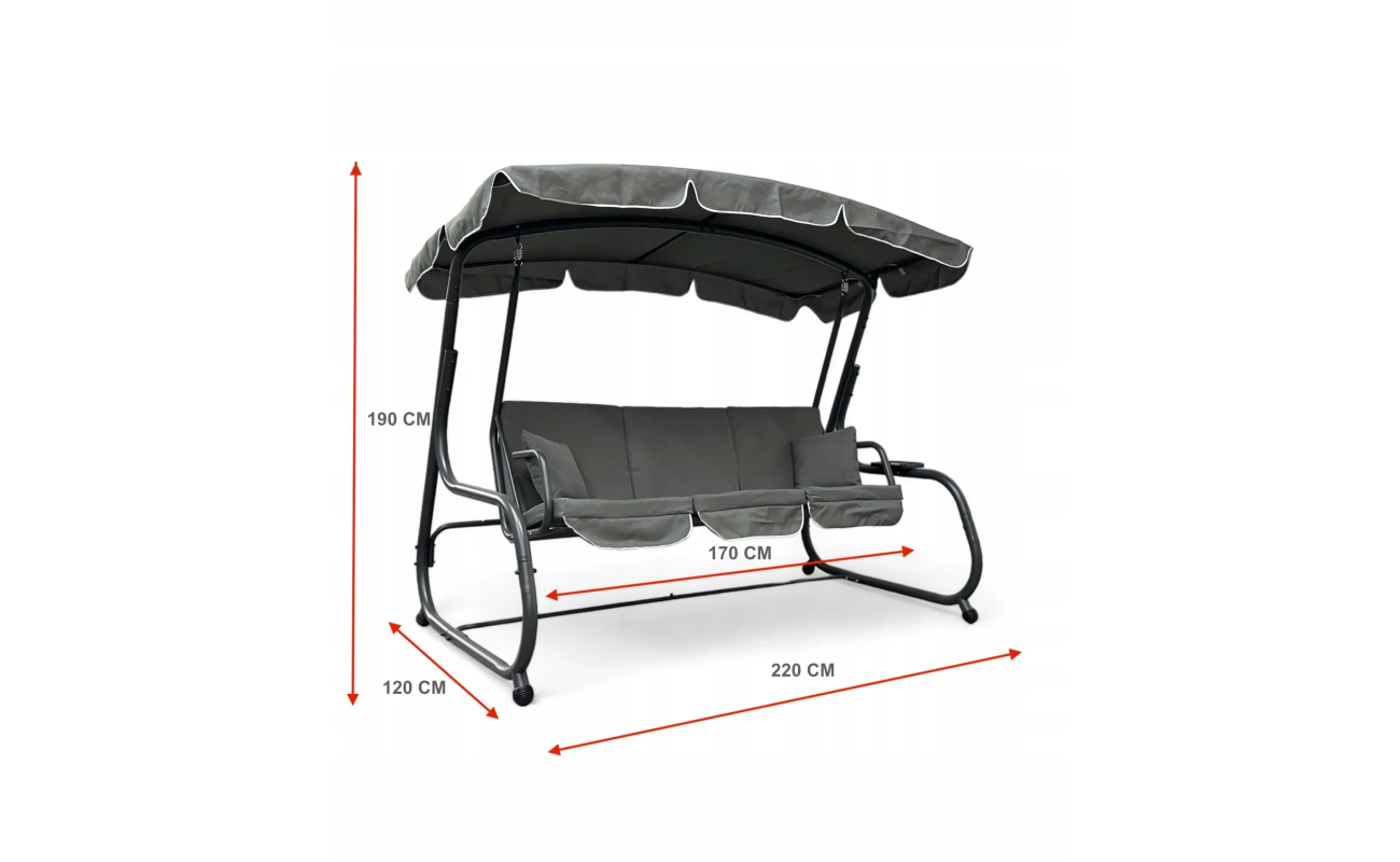 Wymiary huśtawki: wysokość całkowita 190 cm, długość 220 cm, wysokość oparcia 50 cm
