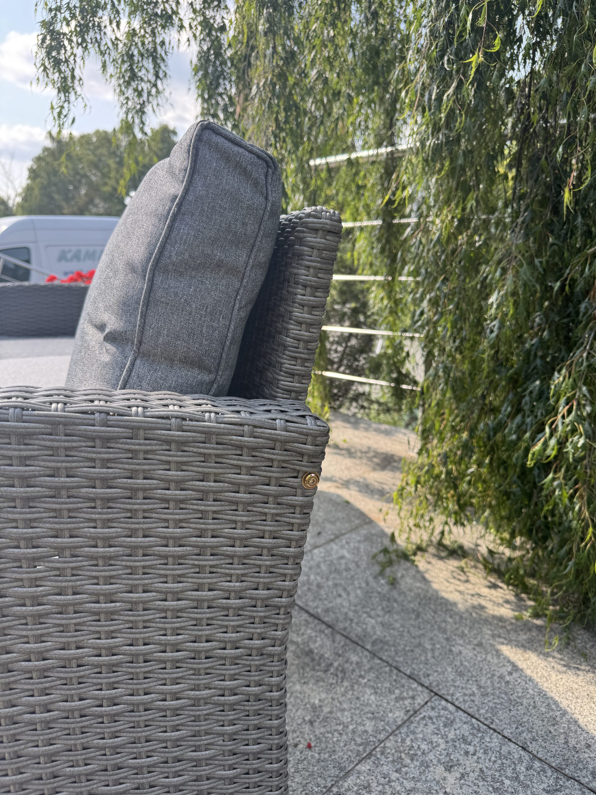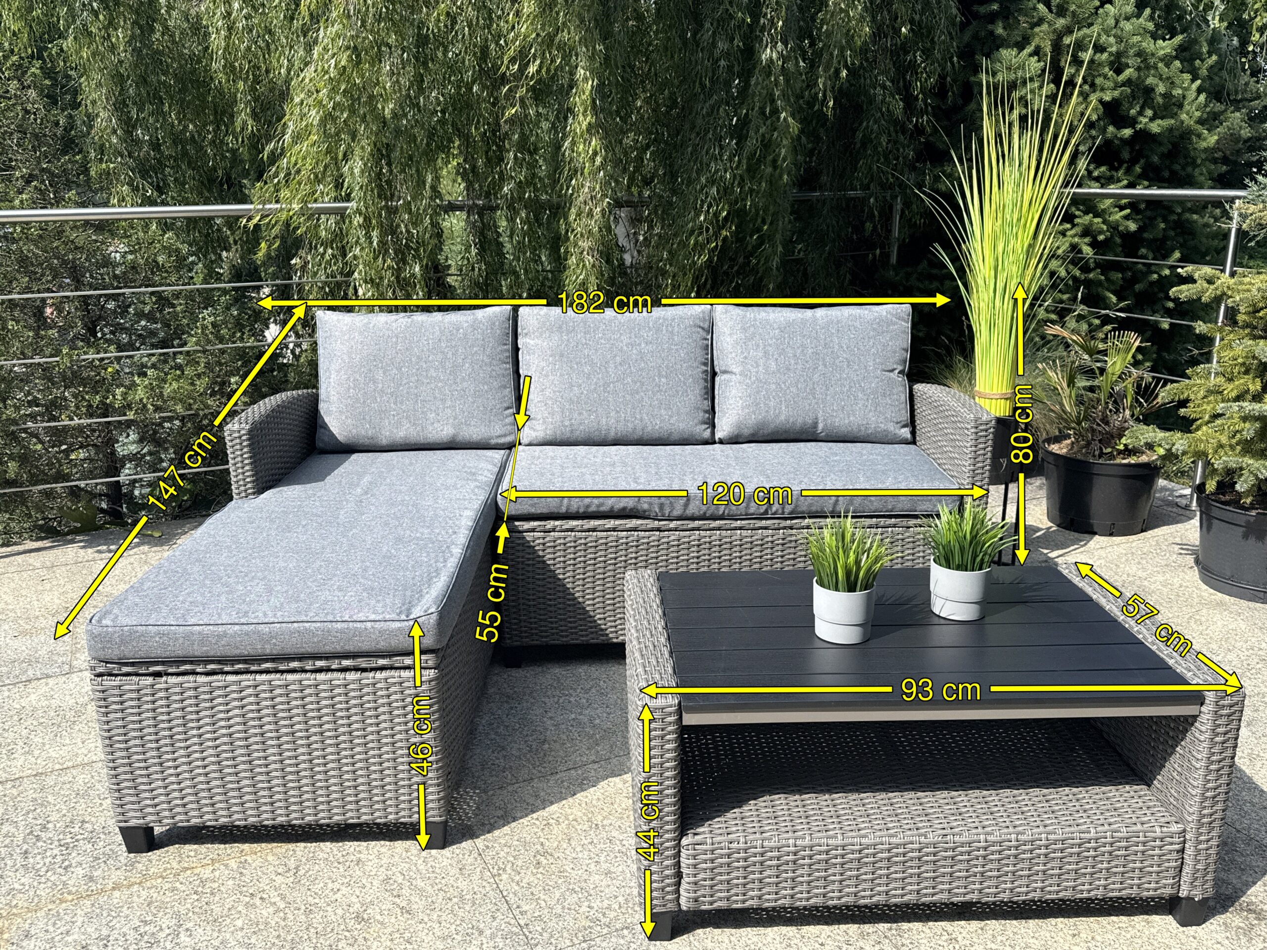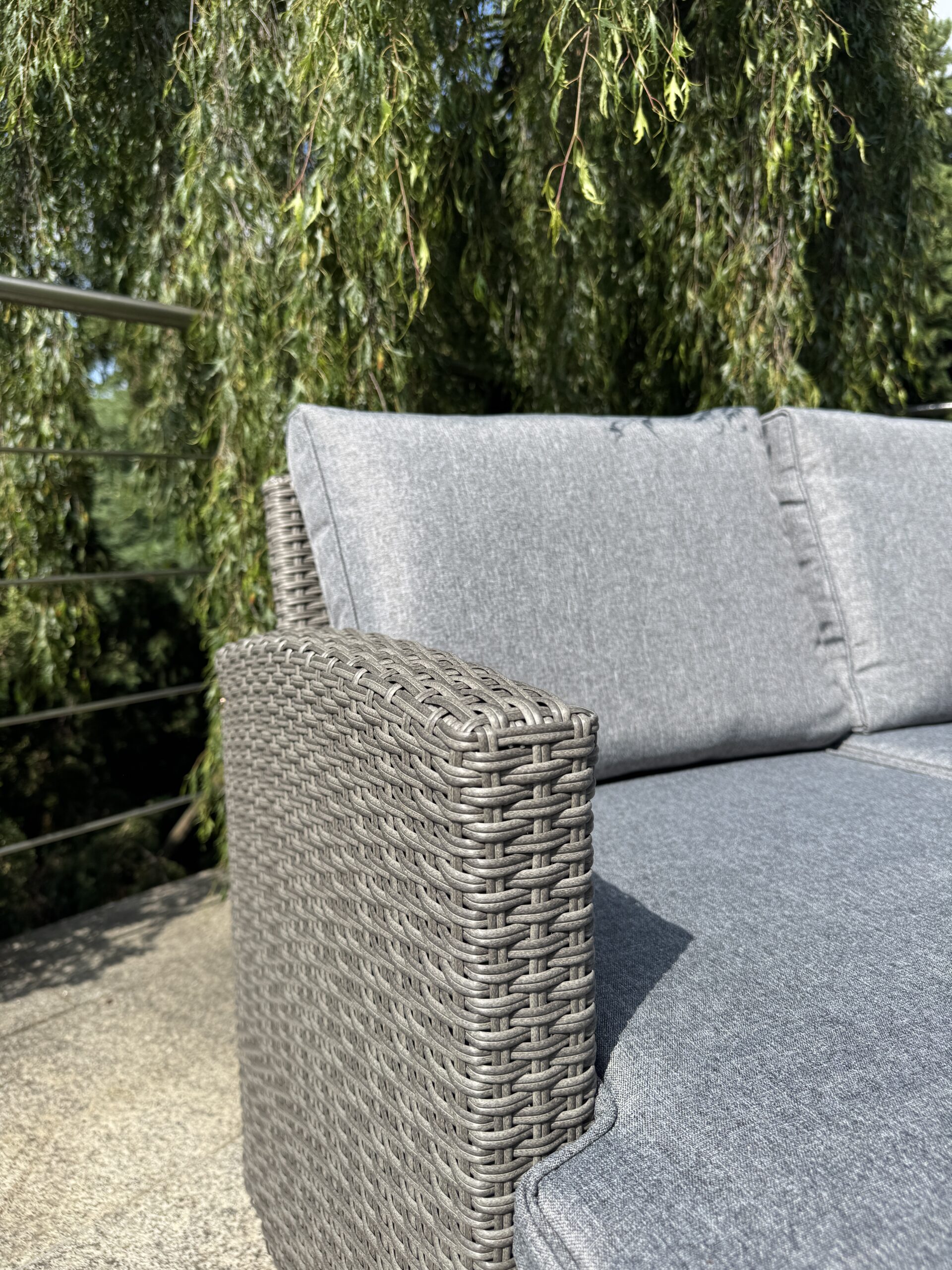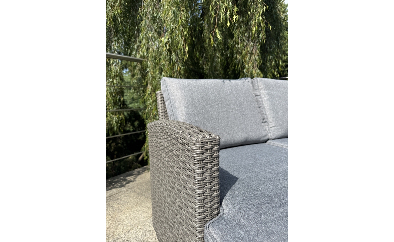 Zestaw utrzymany jest w eleganckim, szarym kolorze – zarówno jeśli chodzi o technorattan, jak i poduszki.