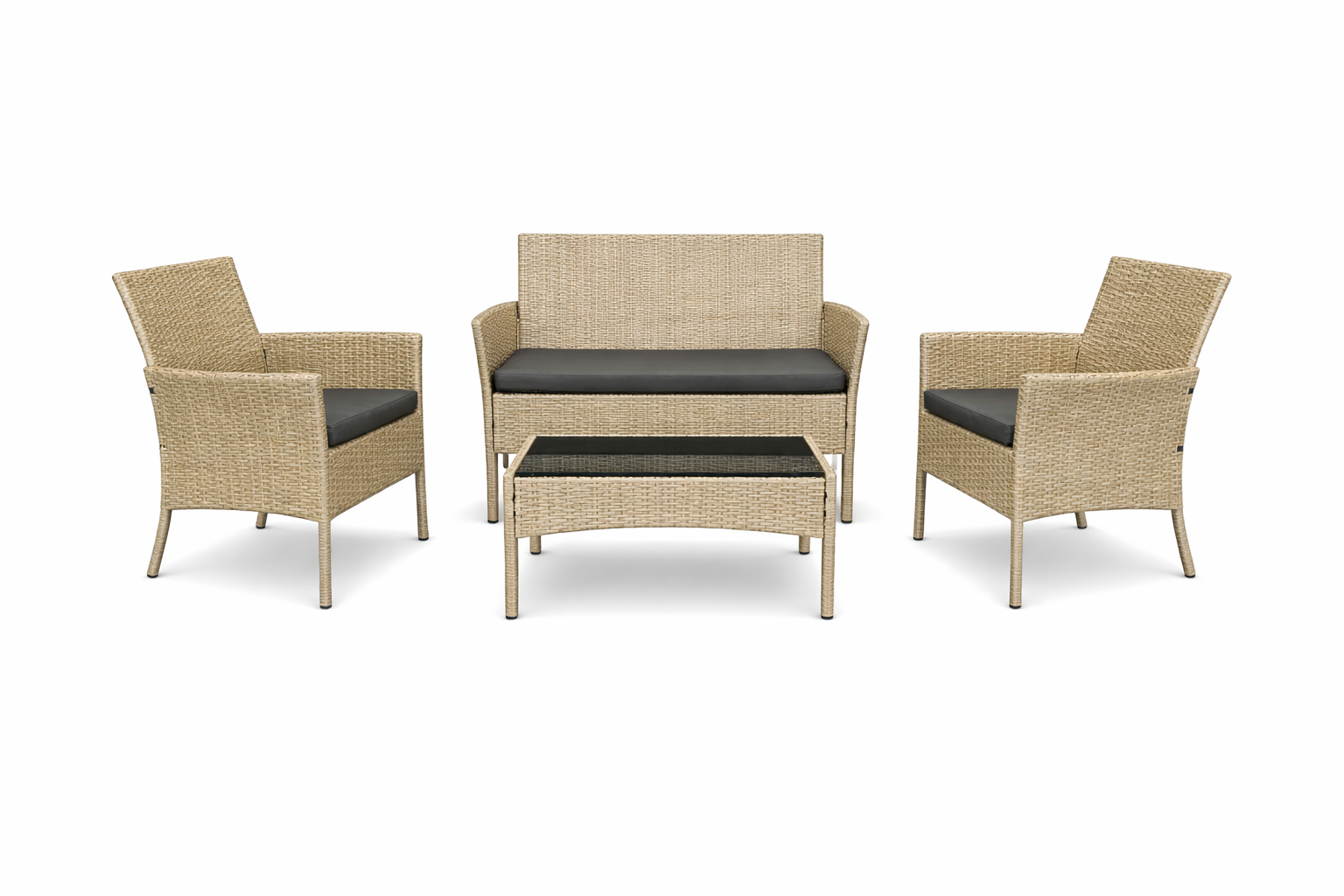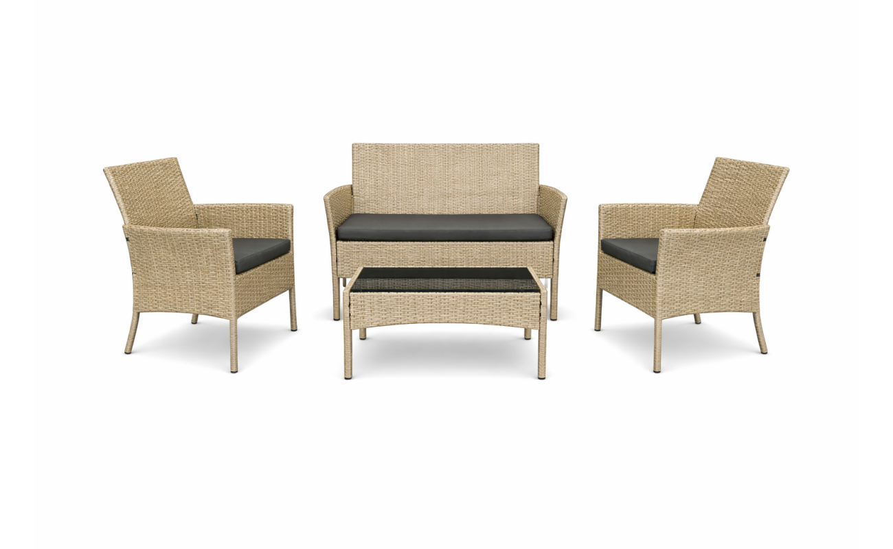 Zestaw został zaprojektowany z myślą o maksymalnym komforcie. Sofa, dwa fotele oraz funkcjonalny stolik kawowy tworzyą spójną całość. Dlatego możesz zaprosić gości lub po prostu odpocząć w samotności z filiżanką kawy. Zarówno forma, jak i kolor naturalnego technorattanu dodają uroku i przytulności.