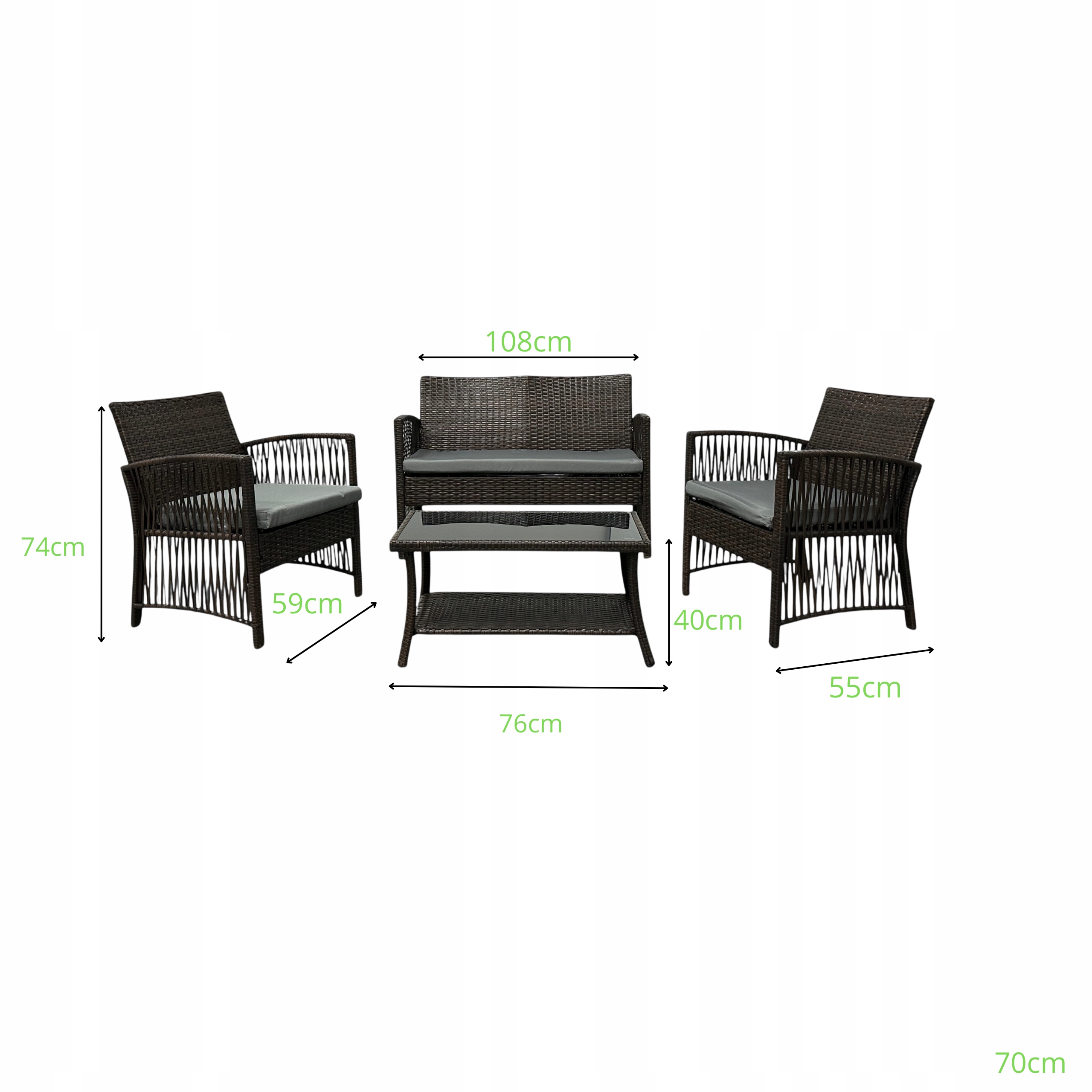 W skład kompletu wchodzą: 2 fotele, kompaktowy stolik oraz grube poduszki.