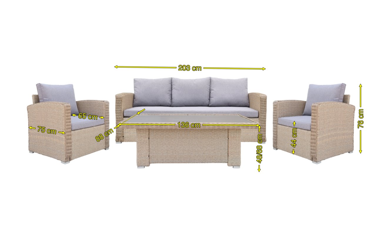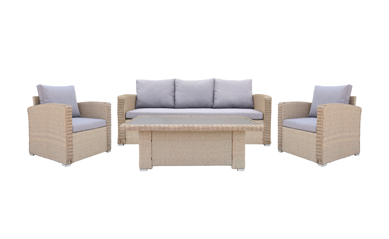 W zestawie znajdziesz wygodną, trzyosobową sofę, dwa przestronne fotele oraz nowoczesny stół z regulowaną wysokością. Miękkie poduszki w odcieniu uniwersalnej szarości tworzą przytulną i stylową przestrzeń. Co więcej, neutralna kolorystyka znakomicie komponuje się z otoczeniem, dlatego łatwo dopasujesz te meble do każdej aranżacji. Dzięki stabilnej konstrukcji i przemyślanemu projektowi zestaw zapewnia wygodę, którą poczujesz od pierwszej chwili.
