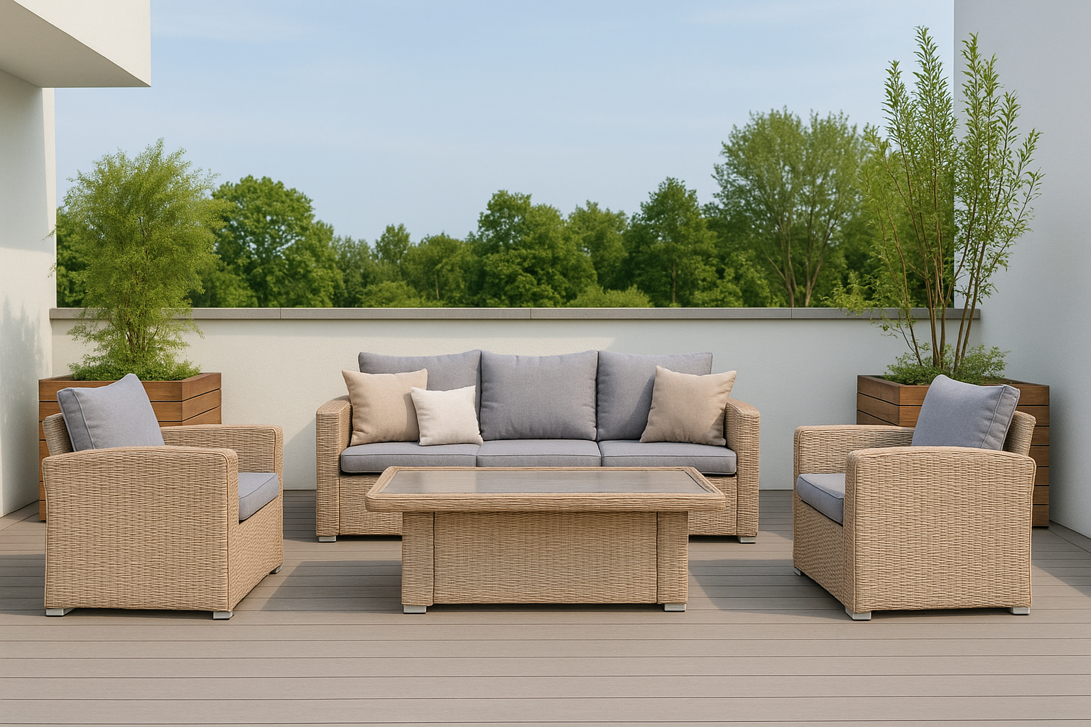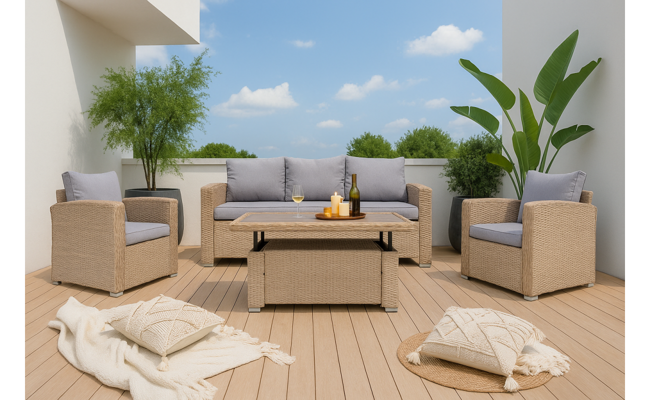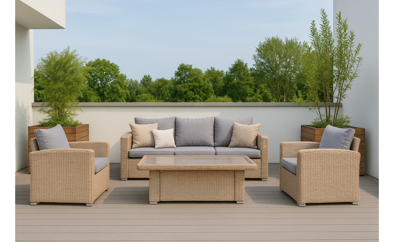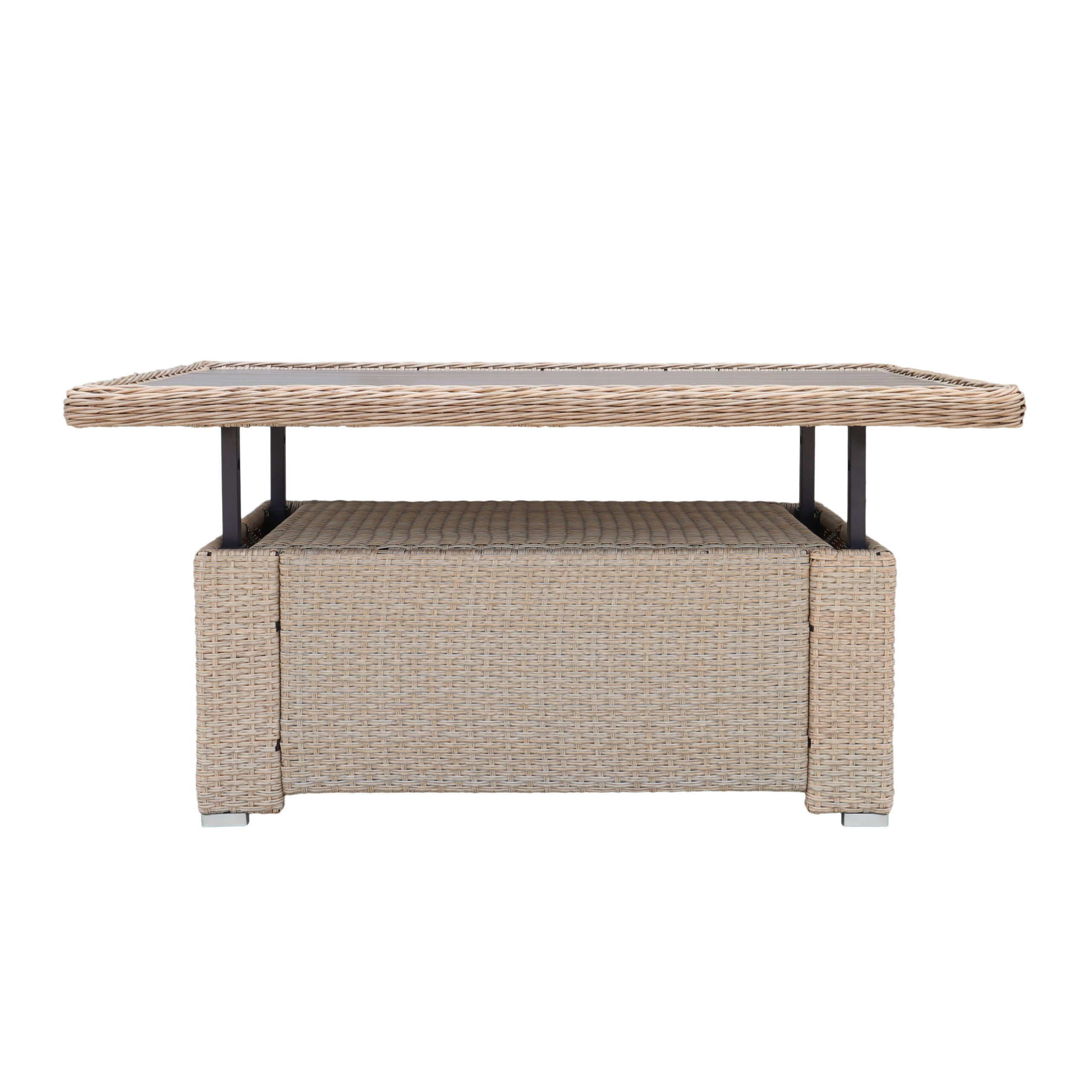 Uniwersalny design zestawu doskonale komponuje się zarówno w nowoczesnych, jak i bardziej klasycznych aranżacjach. Dzięki temu bez trudu stworzysz harmonijną przestrzeń, która zachwyci każdego gościa. Subtelne kolory w połączeniu z naturalną strukturą technorattanu budują przyjemny, ciepły klimat. Jednocześnie nie rezygnujesz z nowoczesnych rozwiązań, które zwiększają funkcjonalność całego kompletu.