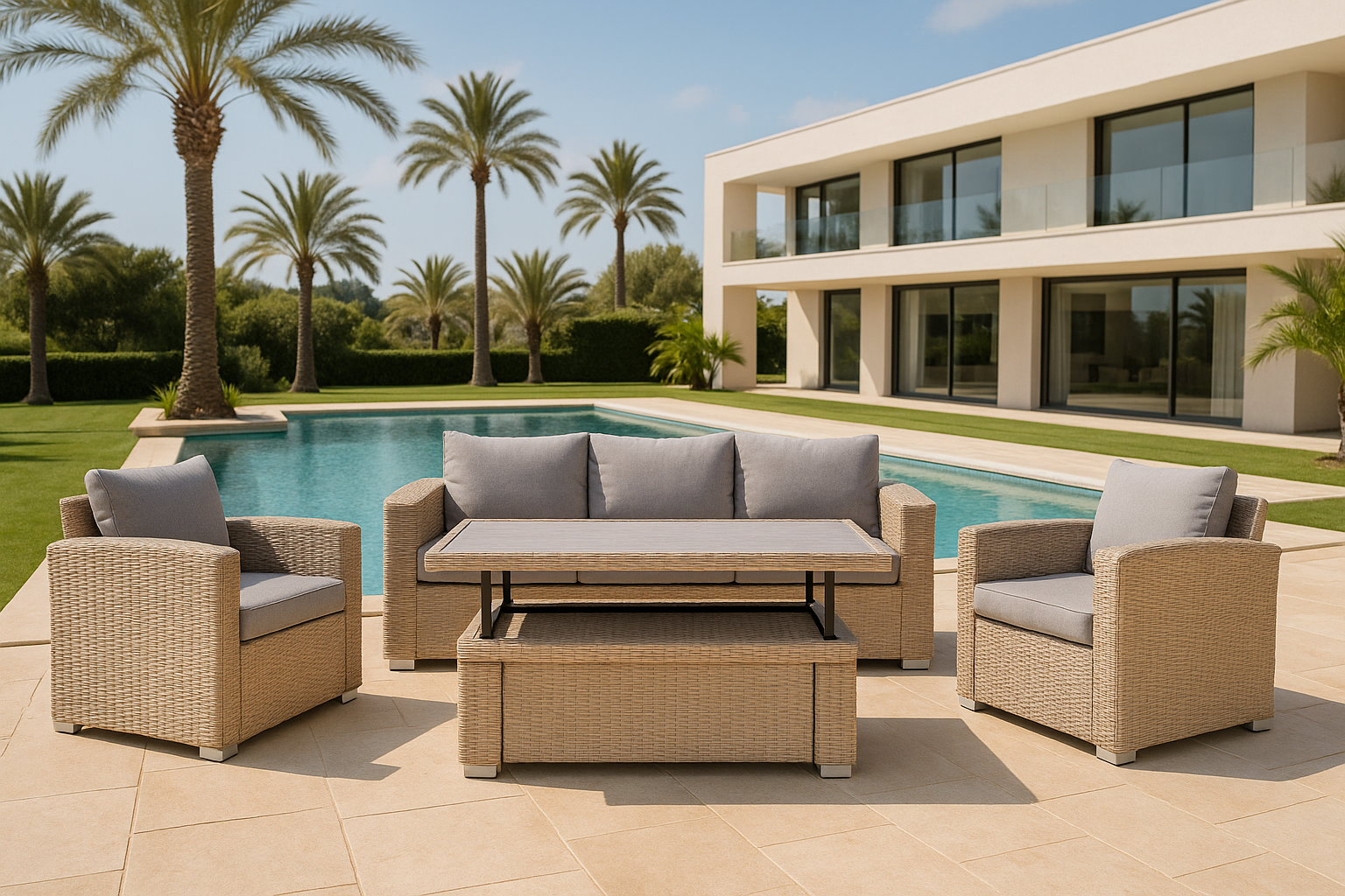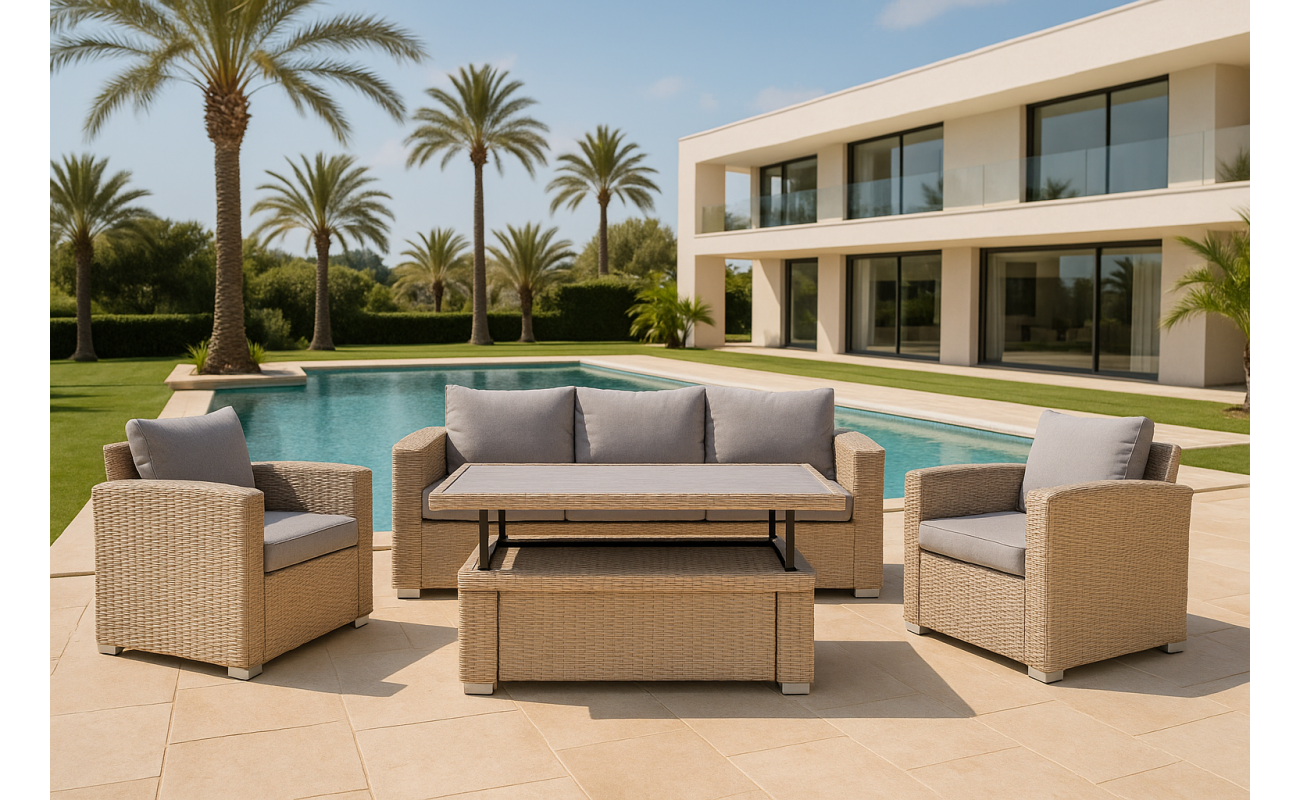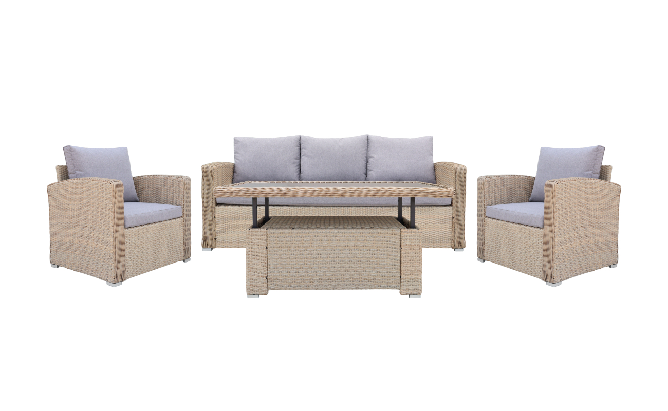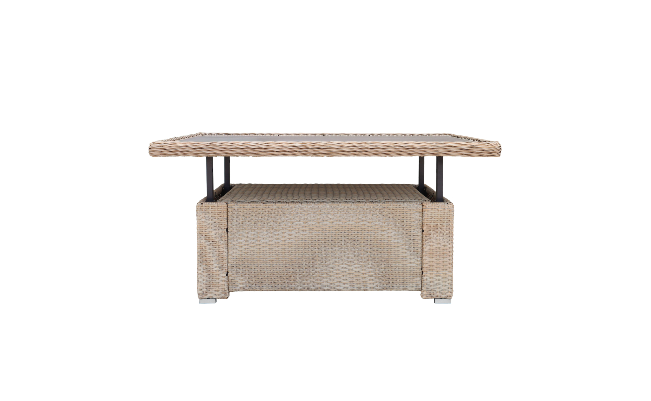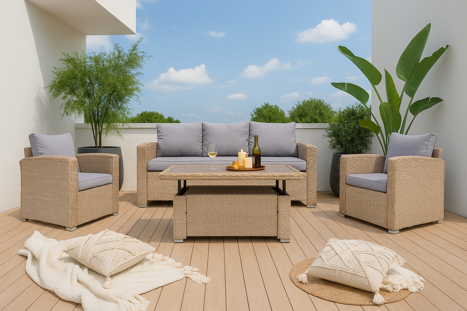 Uniwersalny design zestawu doskonale komponuje się zarówno w nowoczesnych, jak i bardziej klasycznych aranżacjach. Dzięki temu bez trudu stworzysz harmonijną przestrzeń, która zachwyci każdego gościa. Subtelne kolory w połączeniu z naturalną strukturą technorattanu budują przyjemny, ciepły klimat. Jednocześnie nie rezygnujesz z nowoczesnych rozwiązań, które zwiększają funkcjonalność całego kompletu.