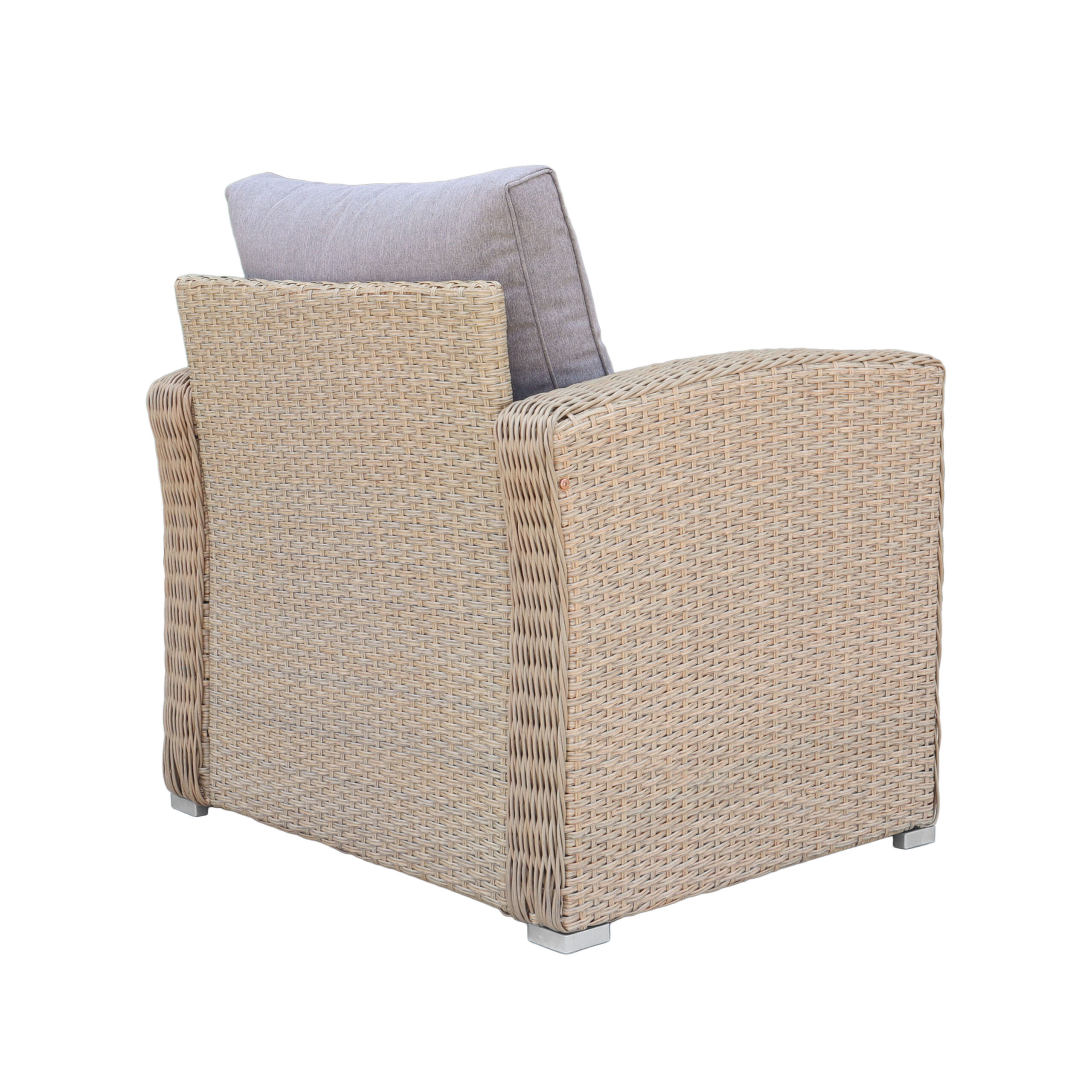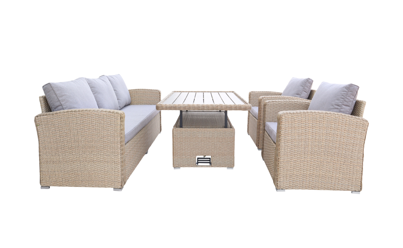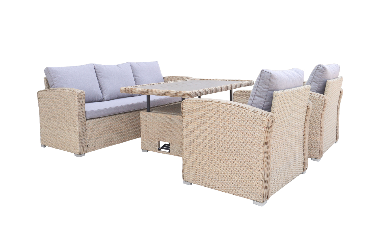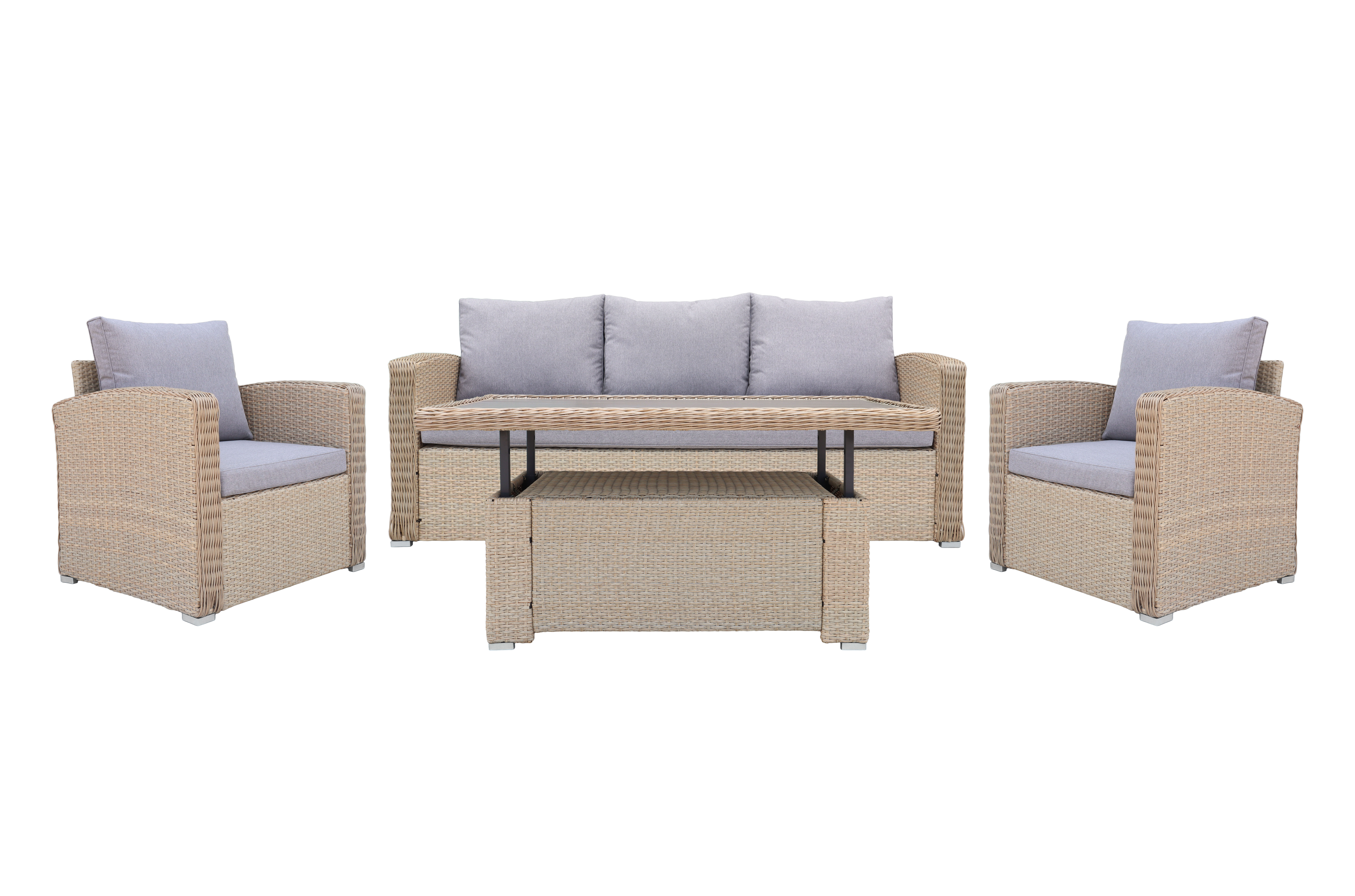 Uniwersalny design zestawu doskonale komponuje się zarówno w nowoczesnych, jak i bardziej klasycznych aranżacjach. Dzięki temu bez trudu stworzysz harmonijną przestrzeń, która zachwyci każdego gościa. Subtelne kolory w połączeniu z naturalną strukturą technorattanu budują przyjemny, ciepły klimat. Jednocześnie nie rezygnujesz z nowoczesnych rozwiązań, które zwiększają funkcjonalność całego kompletu.