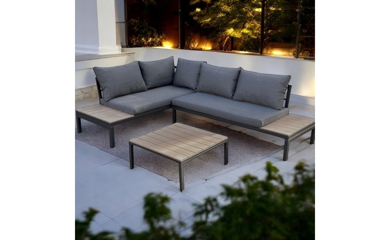 Zestaw składa się z narożnika oraz stolika kawowego, dlatego doskonale nadaje się na codzienny odpoczynek oraz spotkania na świeżym powietrzu. Co ważne, narożnik oferuje wygodne miejsce dla 4–5 osób, dzięki czemu idealnie sprawdzi się wśród rodzin i małych grup przyjaciół.