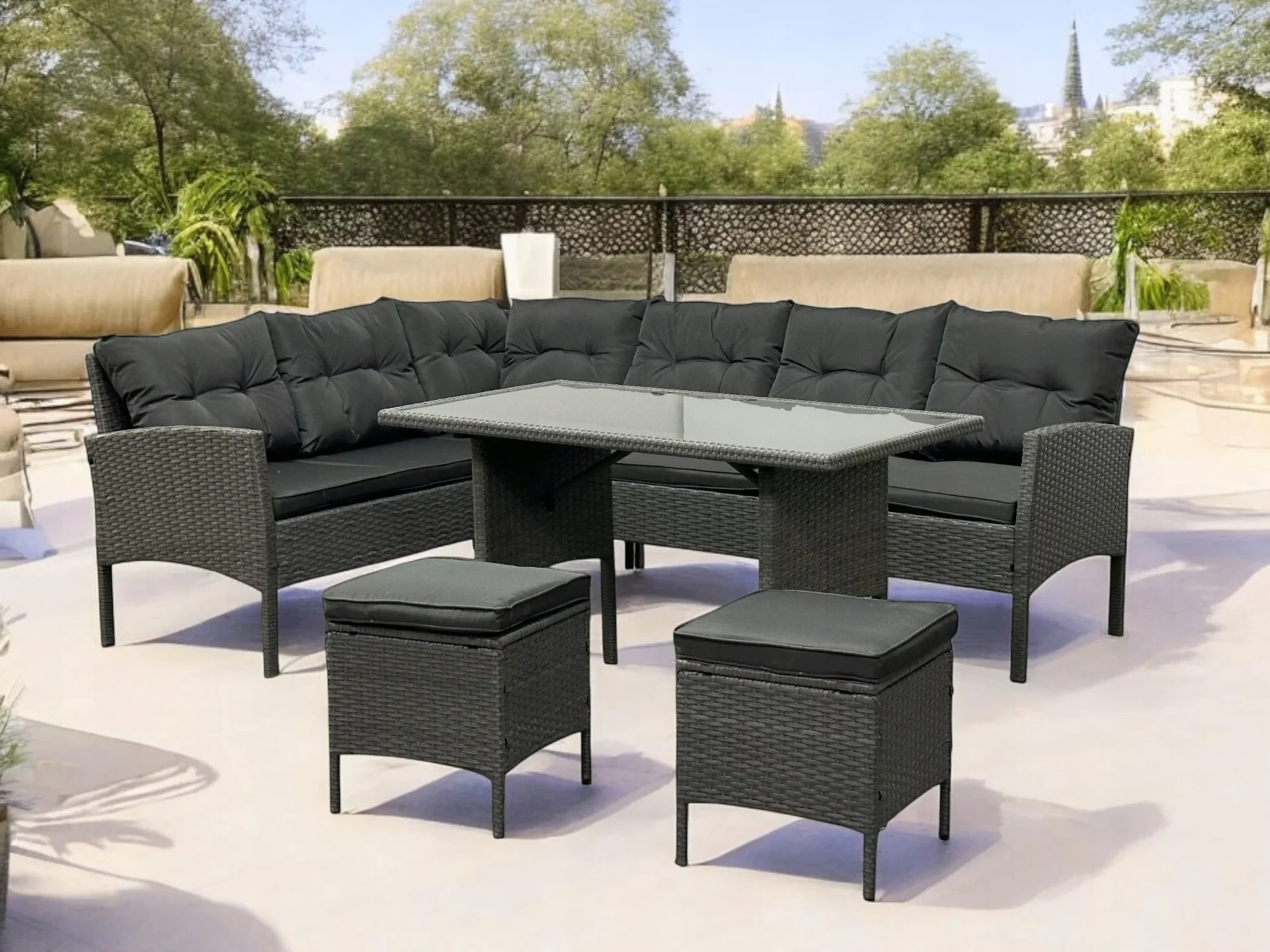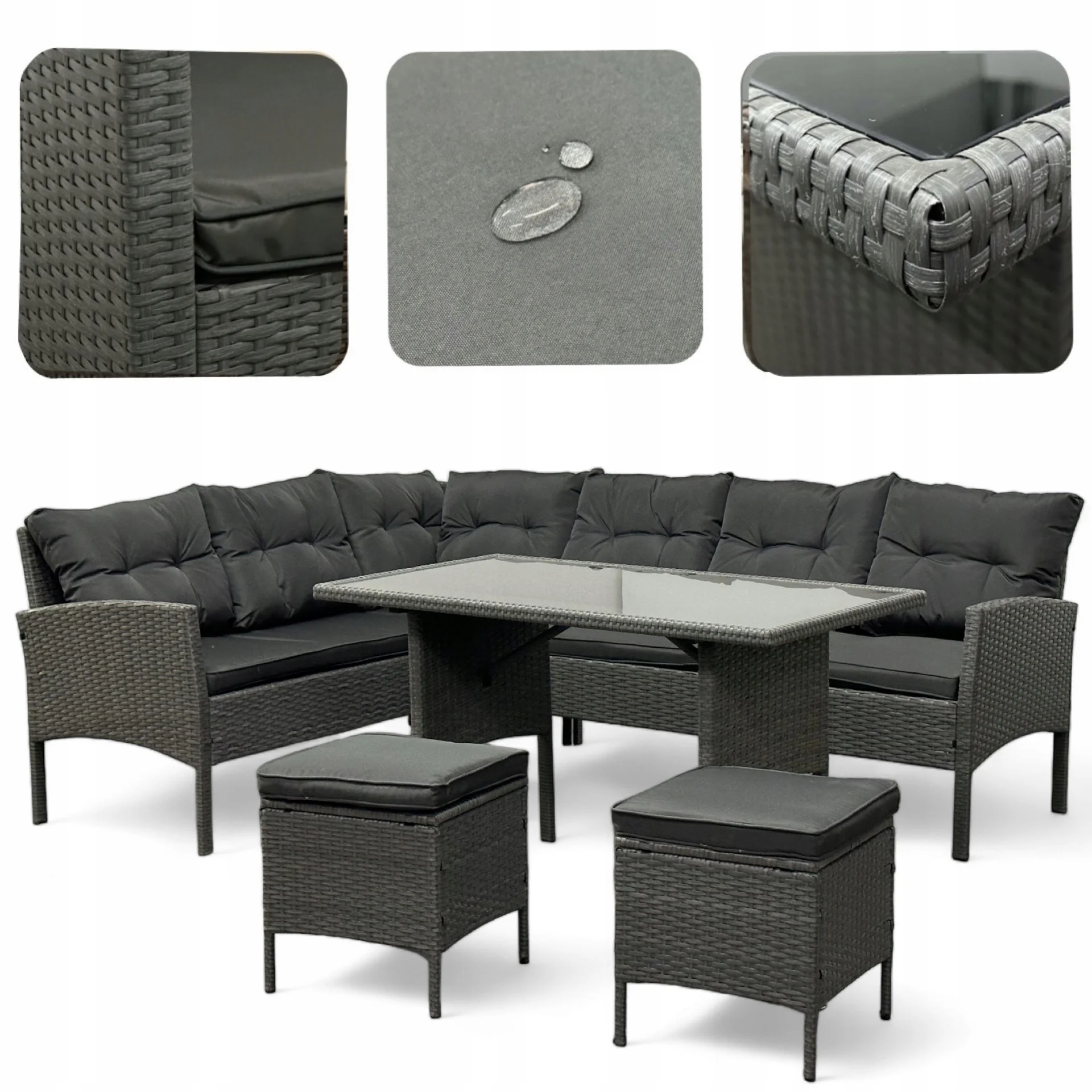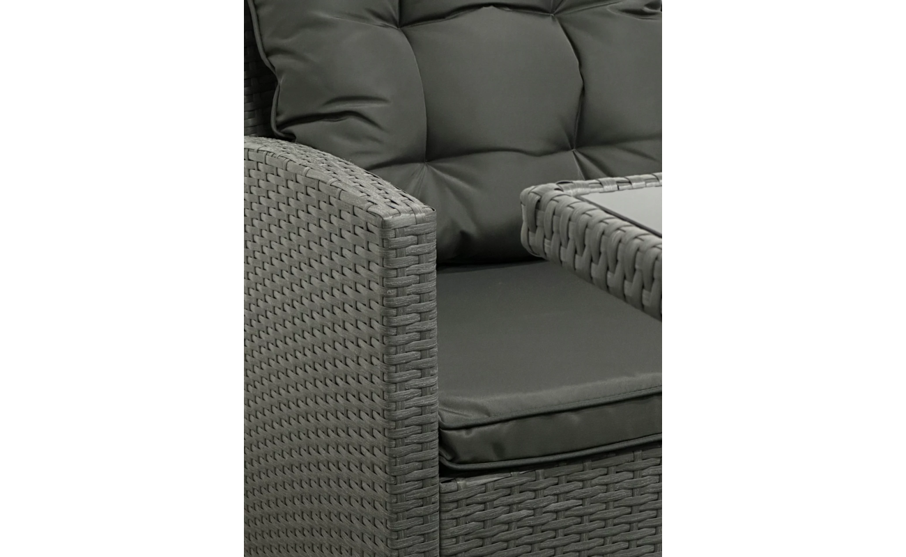 Technorattan to materiał wyjątkowo odporny na działanie promieni UV, wilgoci czy zmiennych temperatur, dlatego meble zachowują estetyczny wygląd przez wiele sezonów. Co więcej, siedziska i oparcia wyposażone są w grube, miękkie poduszki, które zapewniają wysoki komfort użytkowania nawet podczas długich godzin spędzanych na świeżym powietrzu.