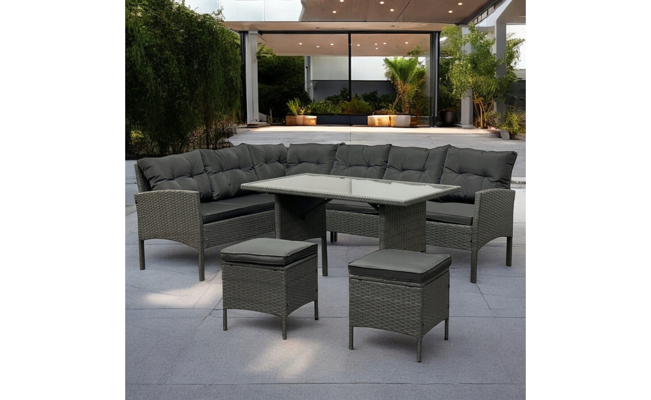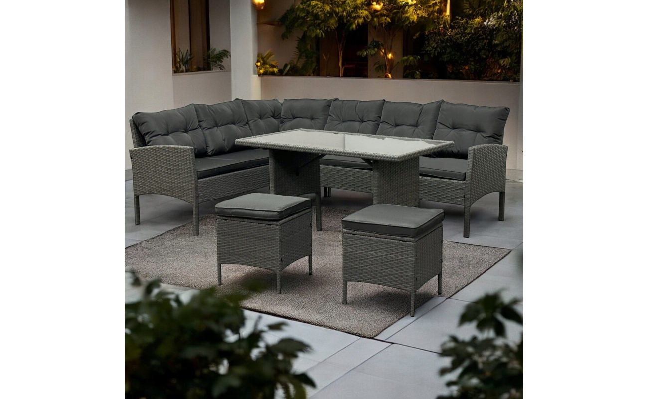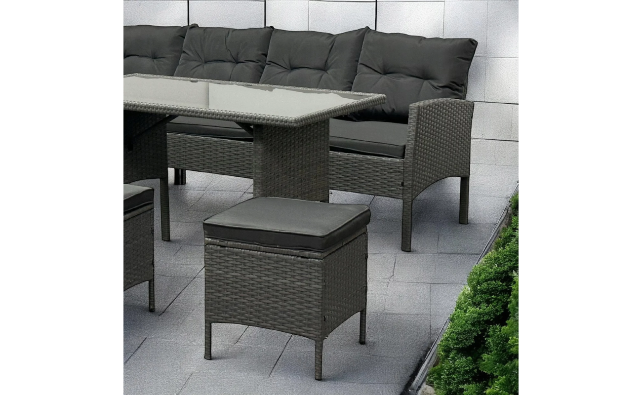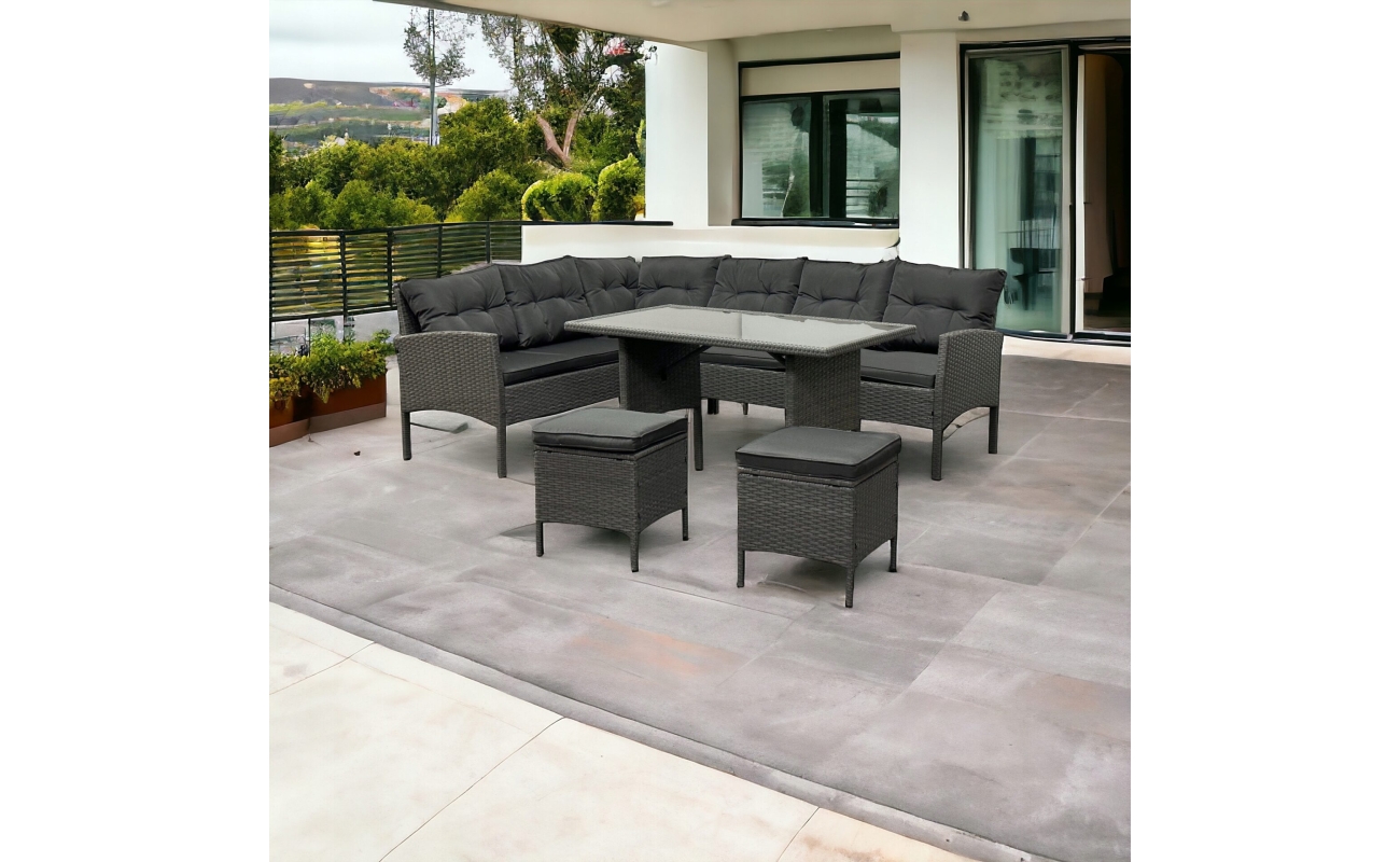 Narożnik tarasowy technorattanowy szary to propozycja dla tych, którzy szukają komfortowego, stylowego i funkcjonalnego rozwiązania do ogrodu lub na taras. Dzięki przemyślanej konstrukcji zestaw pomieści aż 8 osób, co czyni go idealnym wyborem do rodzinnych spotkań lub przyjęć z przyjaciółmi. Zestaw zawiera narożnik oraz dwie pufy, które mogą służyć jako dodatkowe siedziska lub wygodne podnóżki.