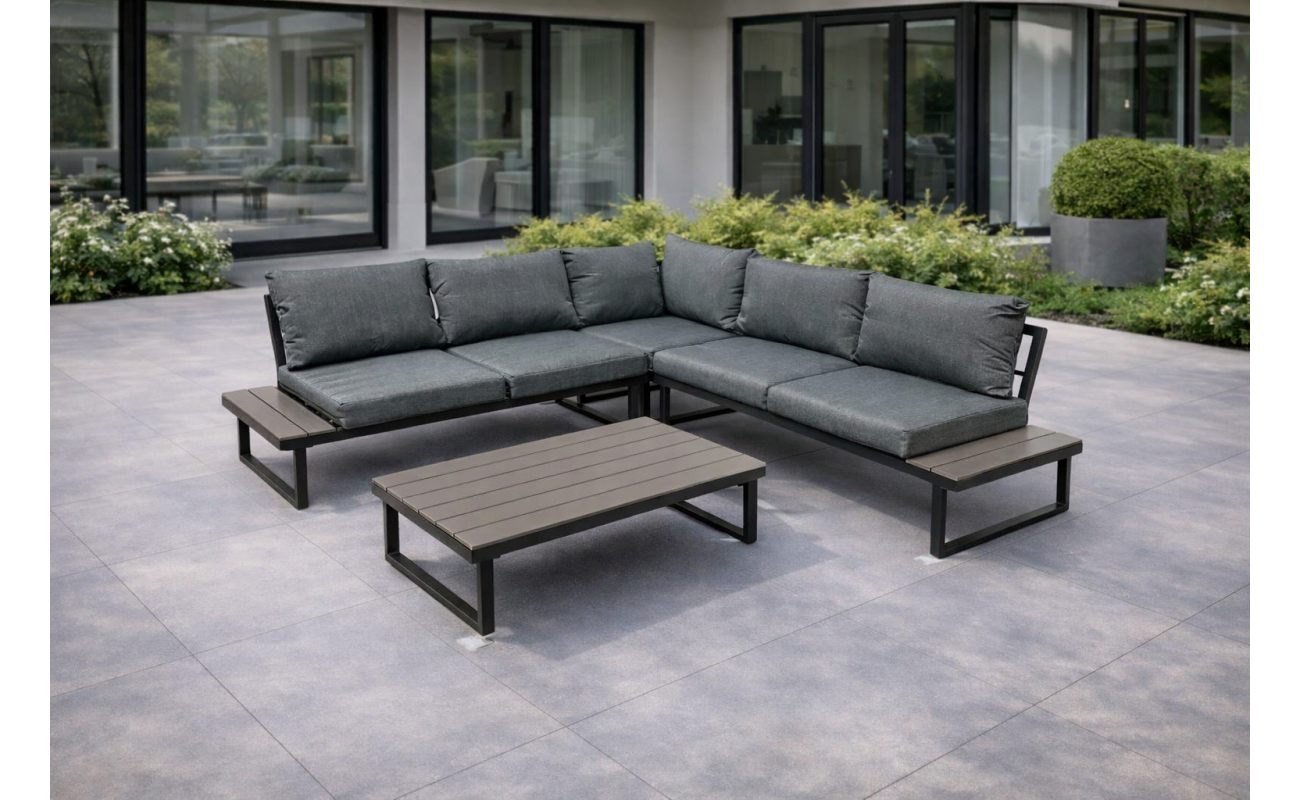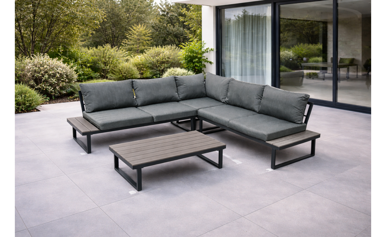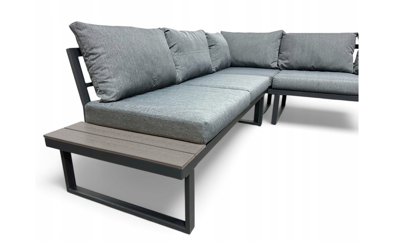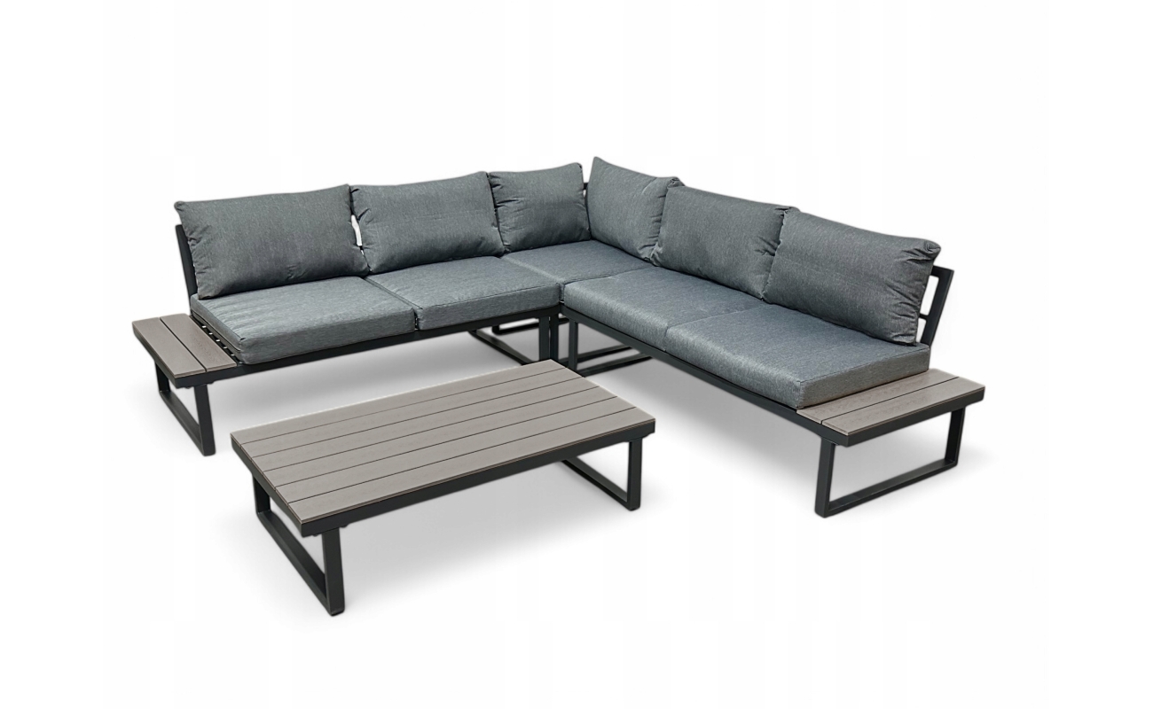Stelaż wykonano z mocnej stali galwanizowanej, malowanej proszkowo. Dzięki temu meble są odporne na korozję oraz uszkodzenia mechaniczne. Gwarantuje to stabilność przez wiele sezonów. Blaty stolika i boczne półki narożnika wykonano z desek polywood, które imitują drewno, ale są jednocześnie trwalsze i łatwiejsze w pielęgnacji. Szary kolor desek idealnie pasuje do całości, przez co nadaje zestawowi elegancki wygląd.