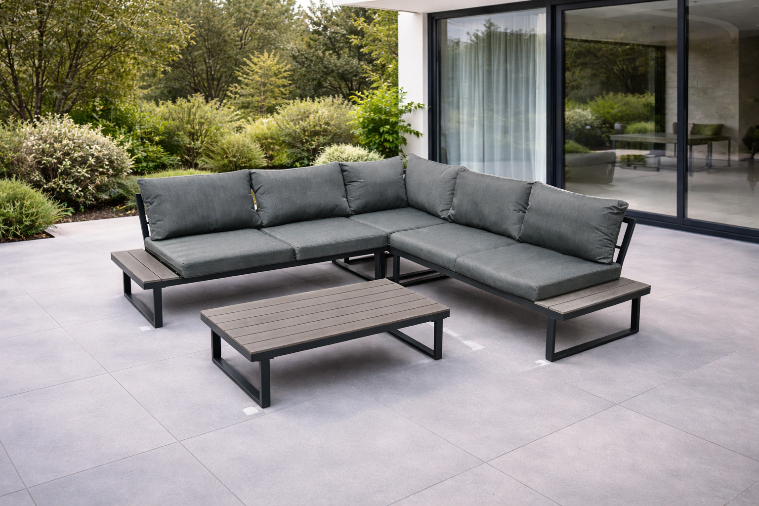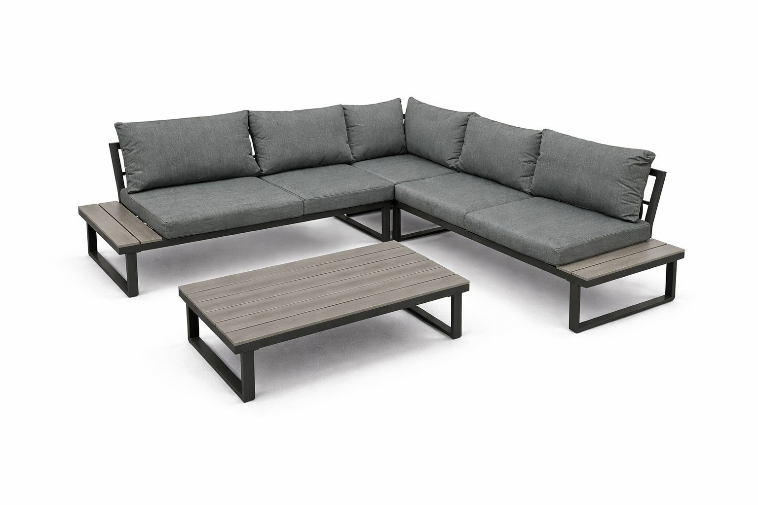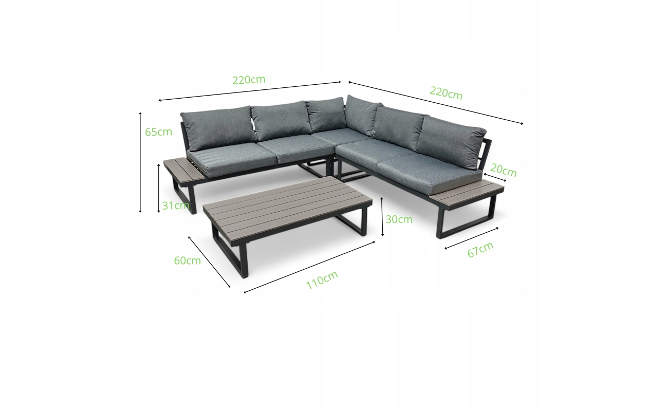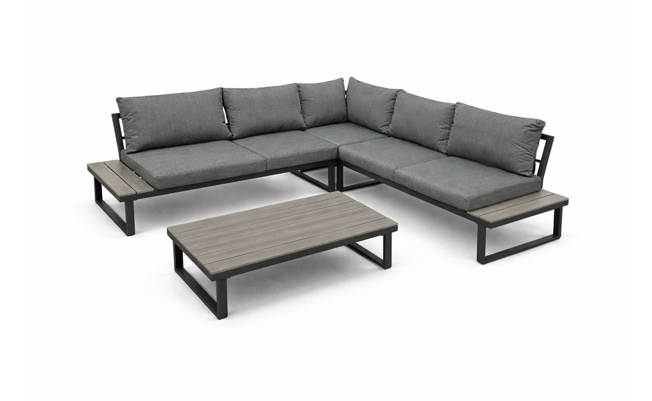 Stelaż wykonano z mocnej stali galwanizowanej, malowanej proszkowo. Dzięki temu meble są odporne na korozję oraz uszkodzenia mechaniczne. Gwarantuje to stabilność przez wiele sezonów. Blaty stolika i boczne półki narożnika wykonano z desek polywood, które imitują drewno, ale są jednocześnie trwalsze i łatwiejsze w pielęgnacji. Szary kolor desek idealnie pasuje do całości, przez co nadaje zestawowi elegancki wygląd.