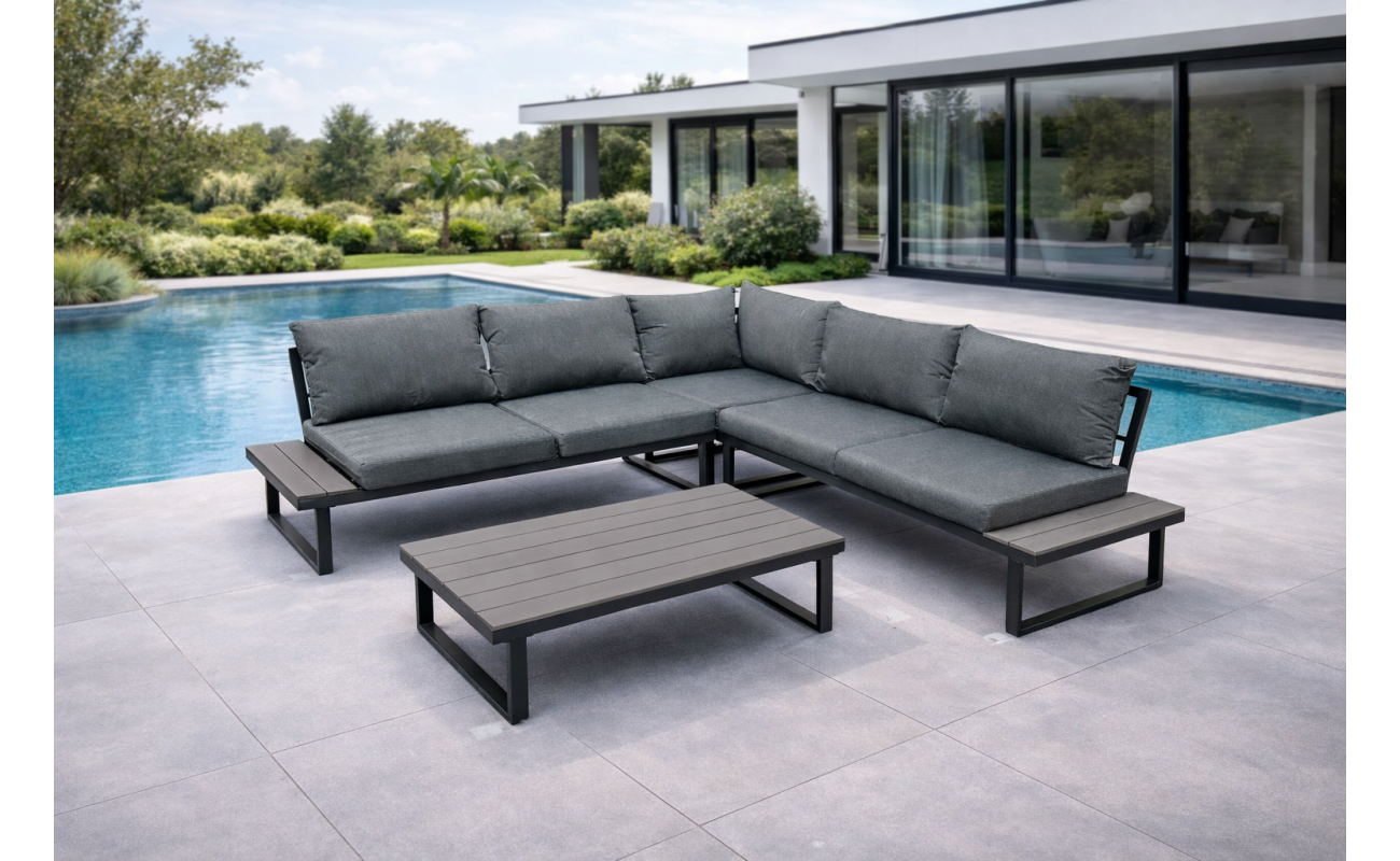 Narożnik tarasowy wypoczynkowy szary MILANO ma modułową budowę, dzięki czemu pomieści wygodnie od 5 do 6 osób. Ponadto, zintegrowane półki pozwalają na odłożenie napoju, telefonu lub książki. W zestawie znajduje się także niski stolik kawowy z blatem z desek polywood, co stanowi praktyczne uzupełnienie mebli i podkreśla spójny styl całego zestawu.