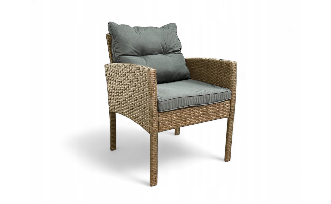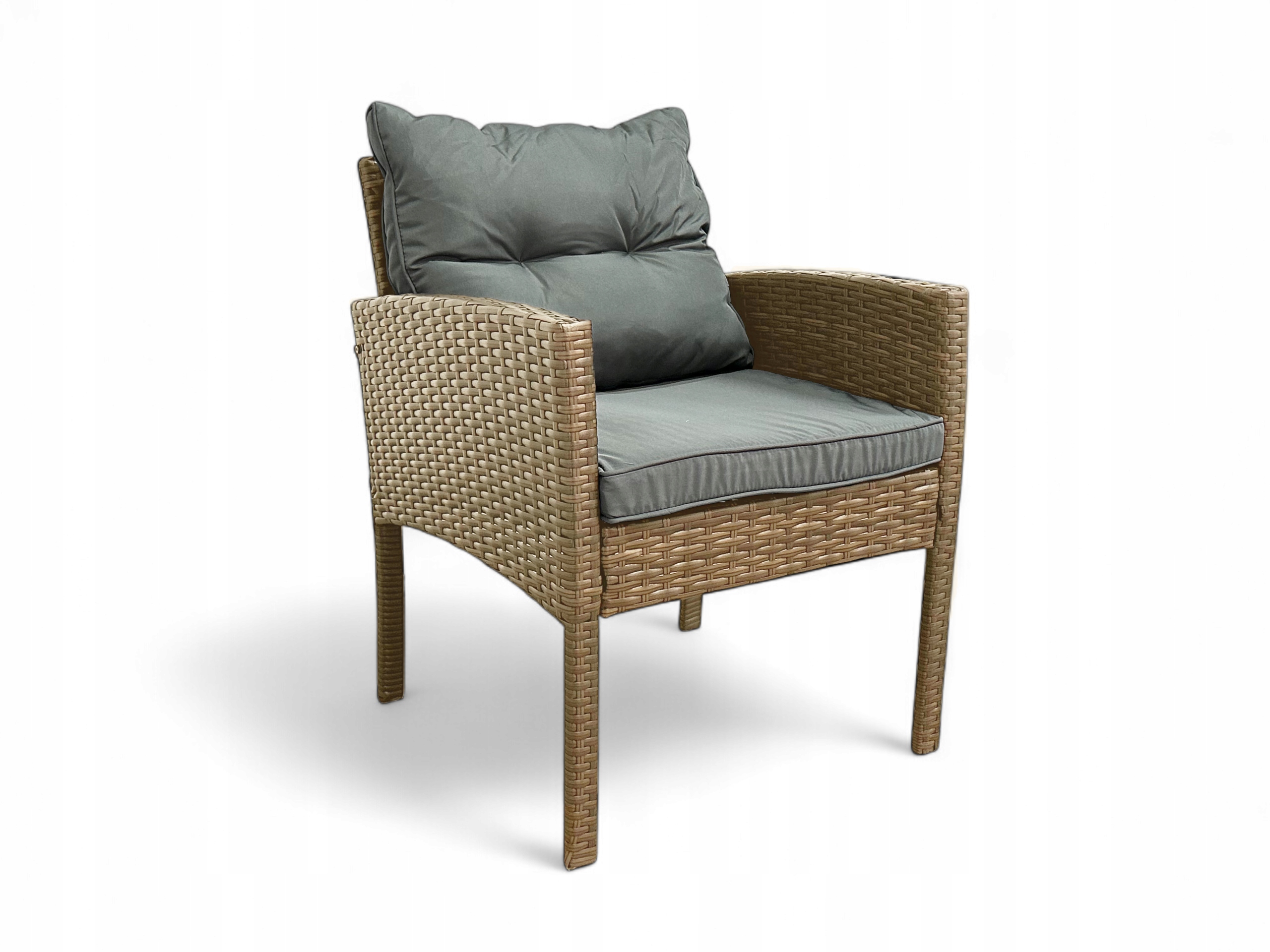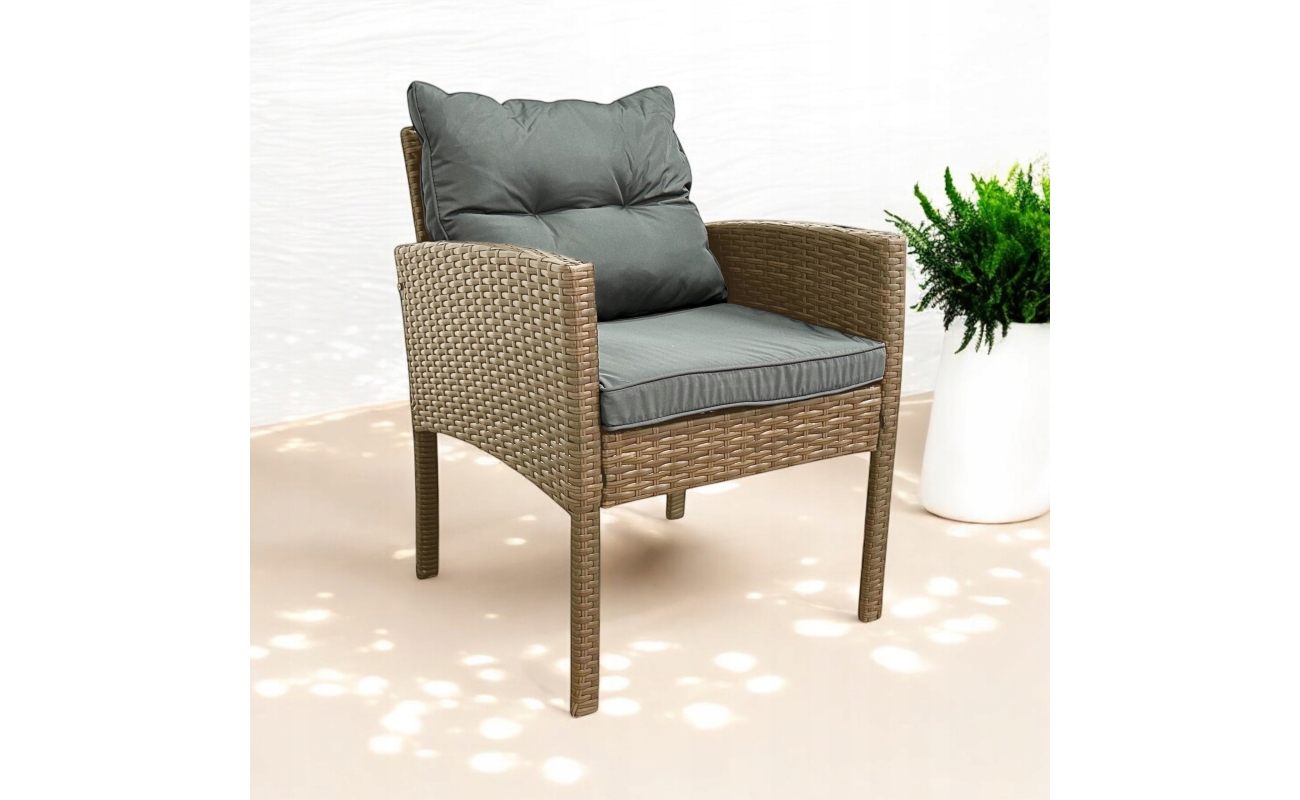 Naturalny fotel ogrodowy technorattanowy z szarymi poduszkami – styl i komfort w Twoim ogrodzie