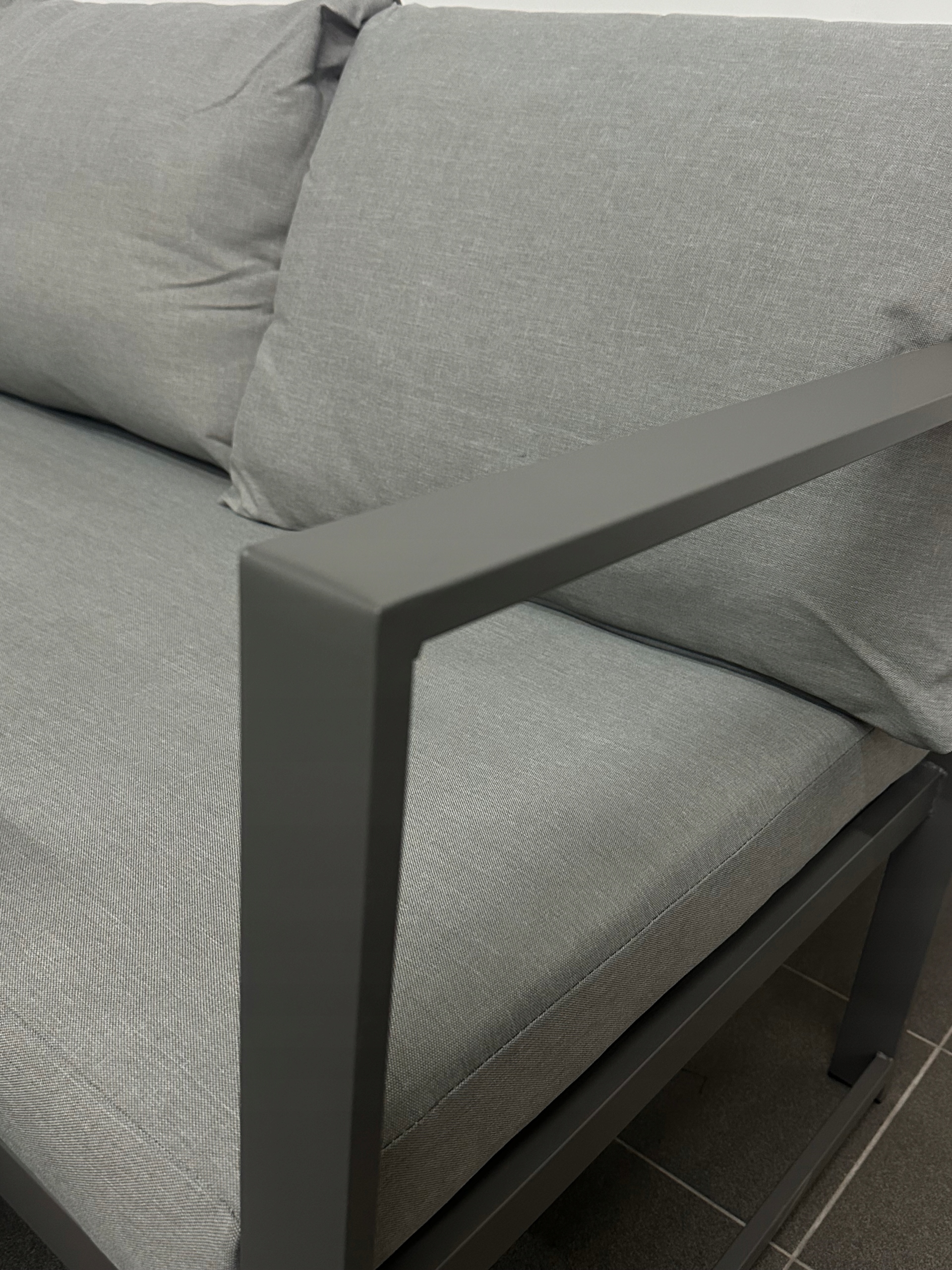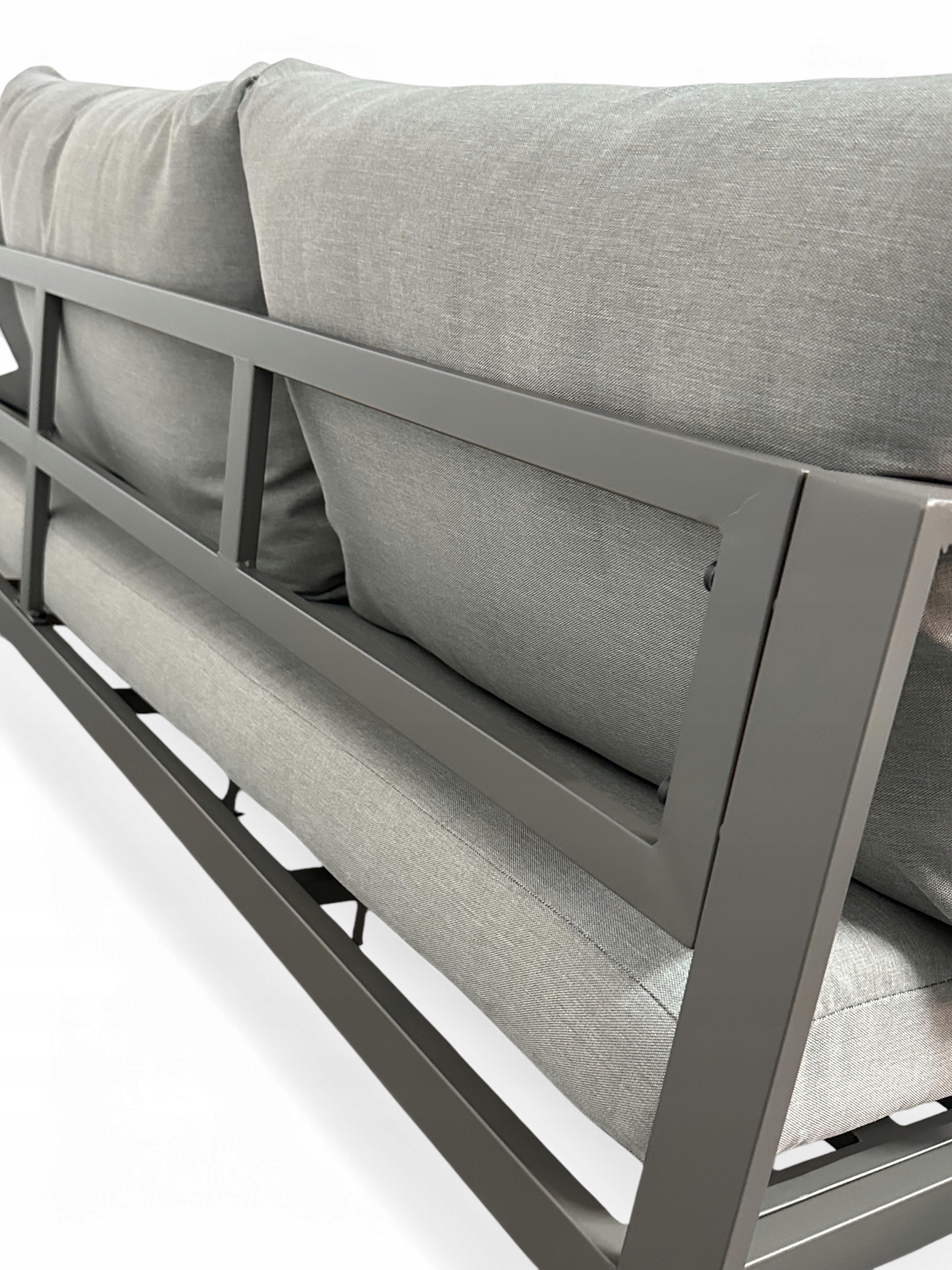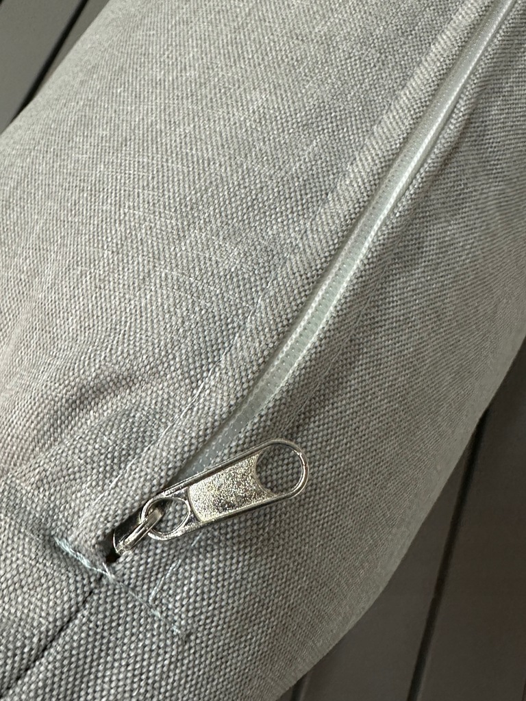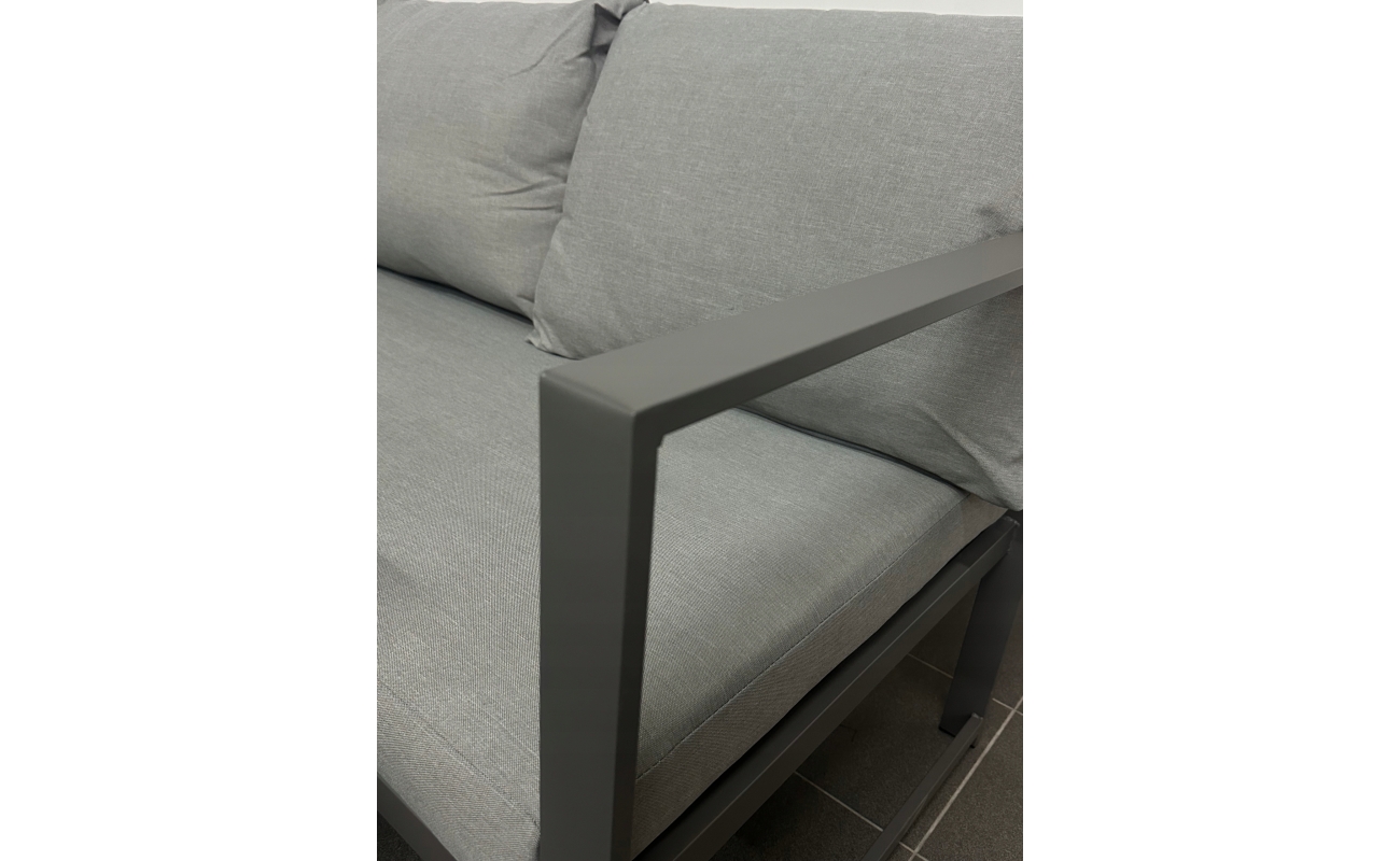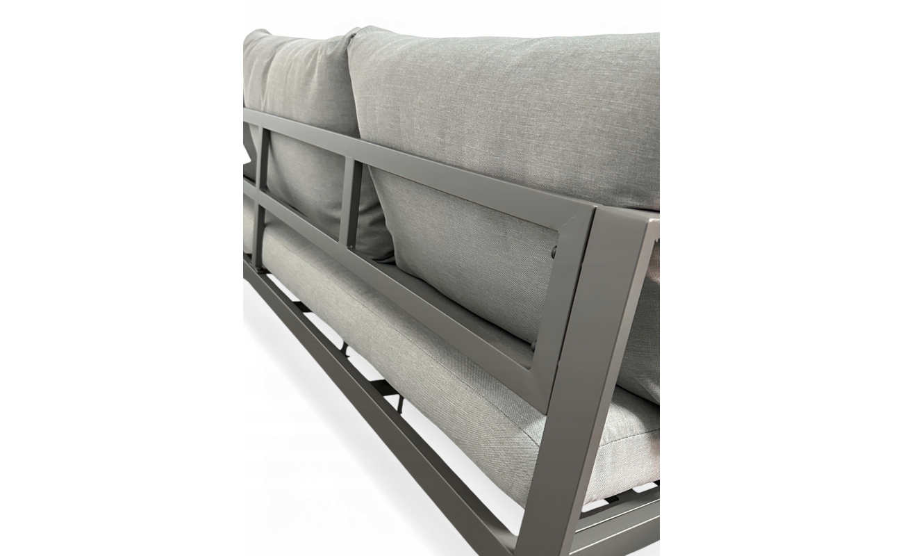 W zestawie znajdziesz grube, miękkie poduszki na siedziskach i oparciach – wykonane z wodoodpornego materiału. Jasnoszary kolor poduszek doskonale komponuje się z ciemniejszą ramą mebli, tworząc spójną, elegancką całość. Zdejmowane poszewki umożliwiają szybkie i łatwe pranie – nawet po intensywnym sezonie letnim.