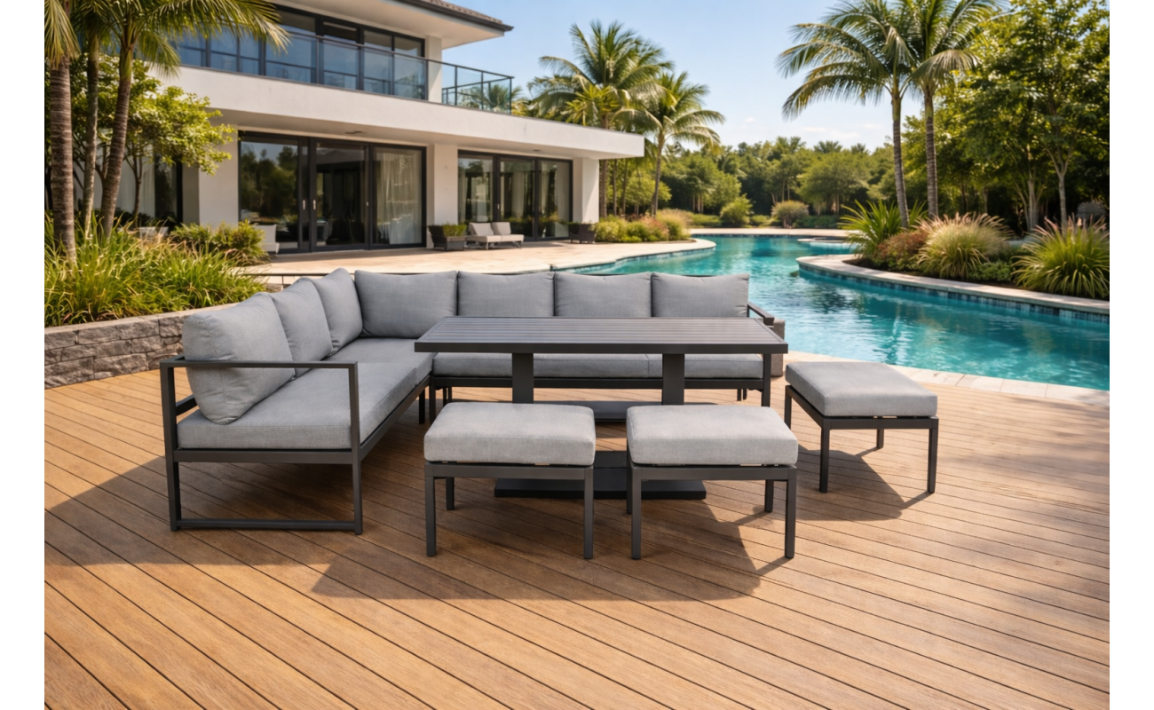 Ten nowoczesny narożnik tarasowy szary to nie tylko mebel, ale kompletna strefa wypoczynku, którą stworzysz bez wysiłku. Wysoka estetyka i ergonomia sprawiają, że zestaw MARIEL idealnie nadaje się zarówno do codziennego relaksu, jak i przyjmowania gości.