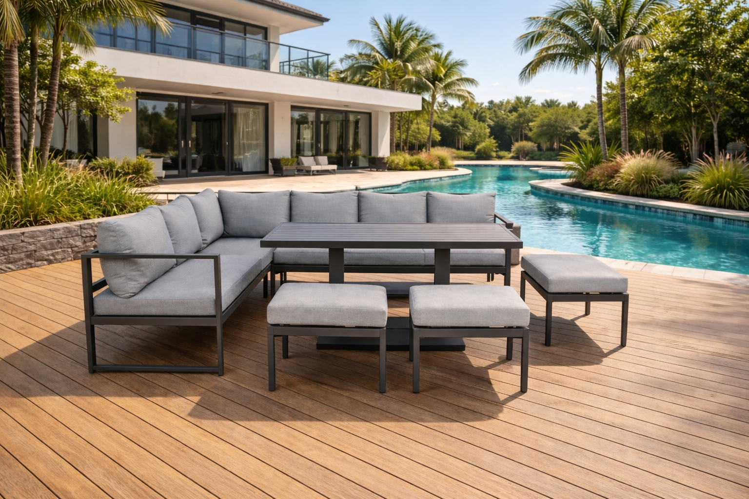 Nowoczesny narożnik tarasowy szary Mariel z pufami