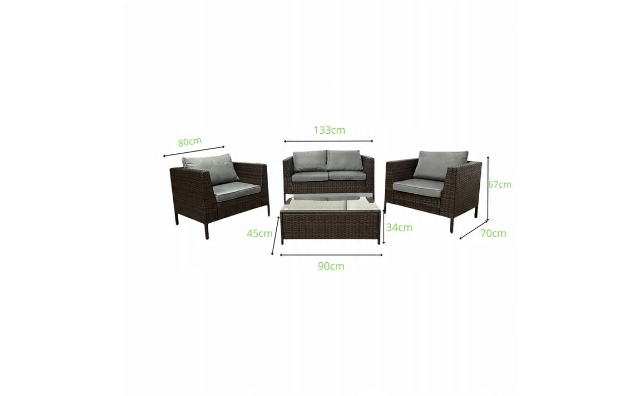 Stelaż wykonano z solidnego metalu pokrytego technorattanem, który jest odporny na deszcz, słońce i zmiany temperatur. Dzięki temu meble nie odkształcają się i nie tracą swojego wyglądu nawet po intensywnym użytkowaniu. Ogrodowy zestaw COSTA to inwestycja, która się opłaca – nie tylko wizualnie, ale i praktycznie.