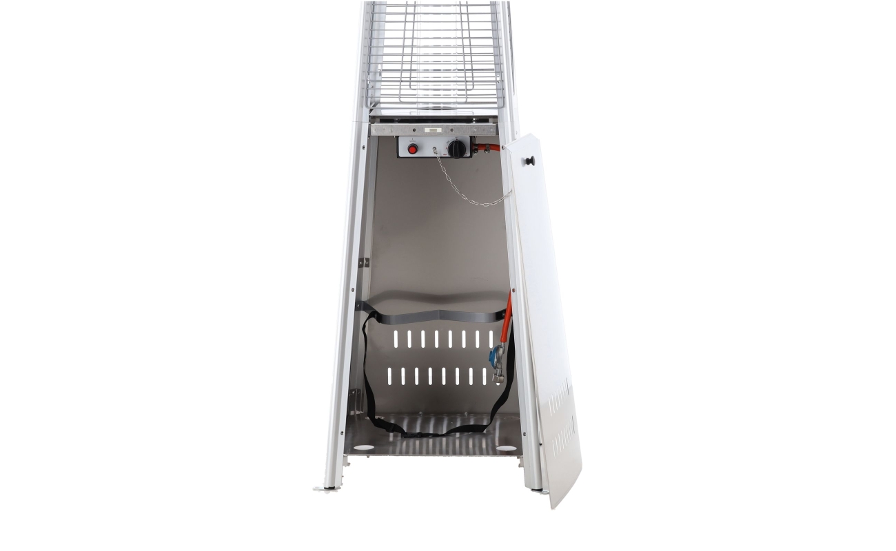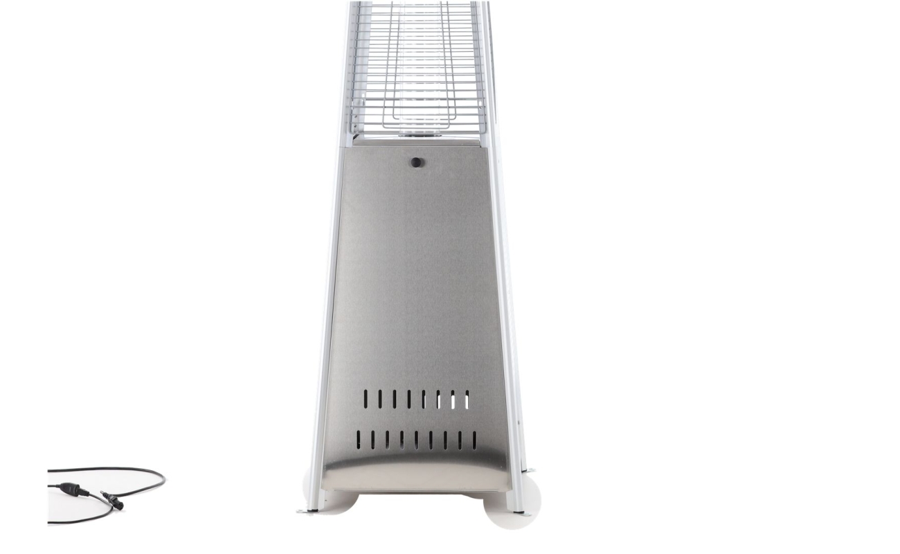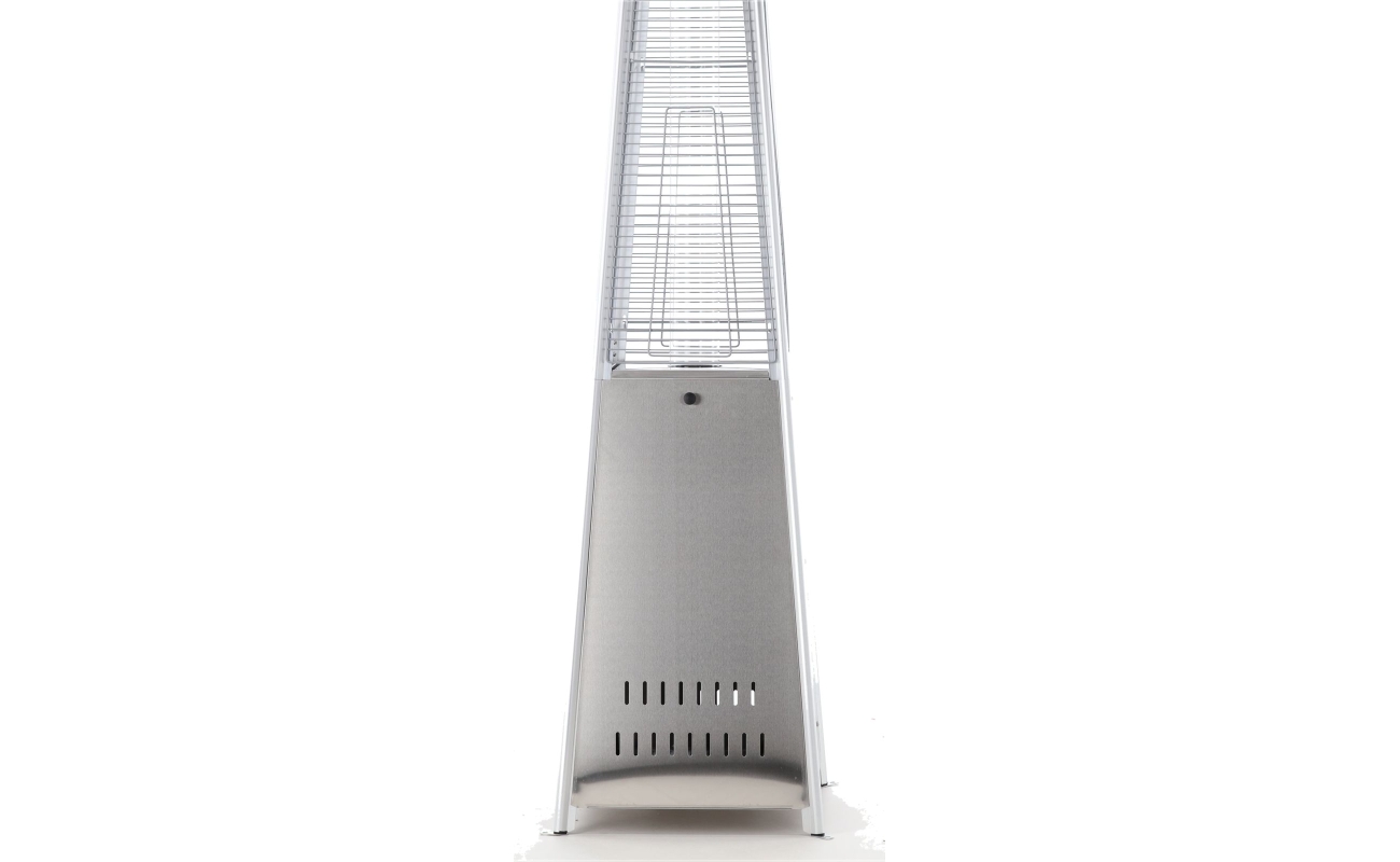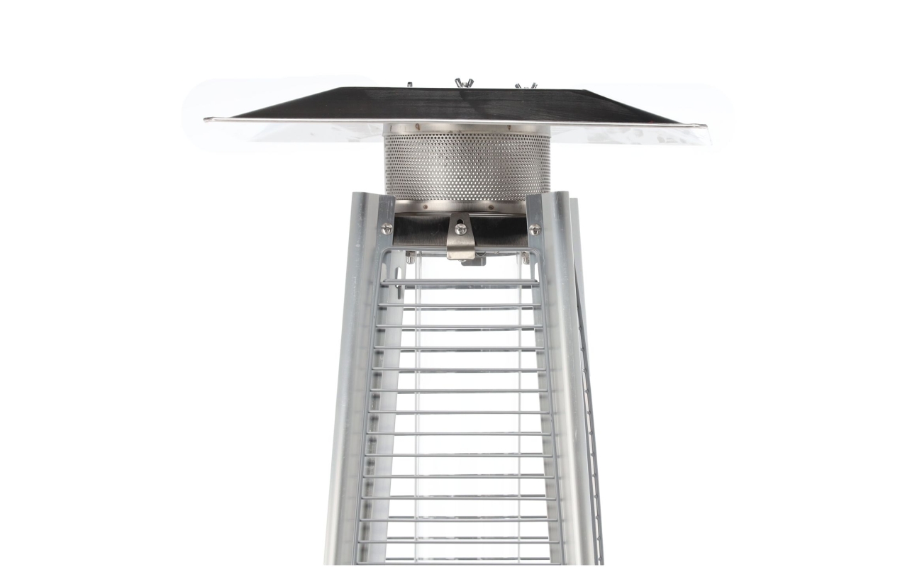 Konstrukcja o wysokości 227 cm jest stabilna i solidna. Ciężka podstawa dodatkowo chroni urządzenie przed przewróceniem. Siatka ochronna zabezpiecza płomień i sprawia, że ogrzewacz jest bezpieczny także w miejscach publicznych.