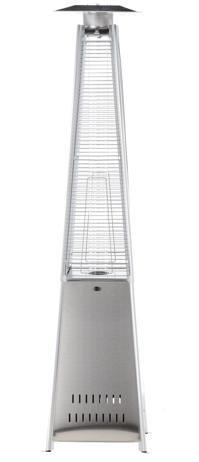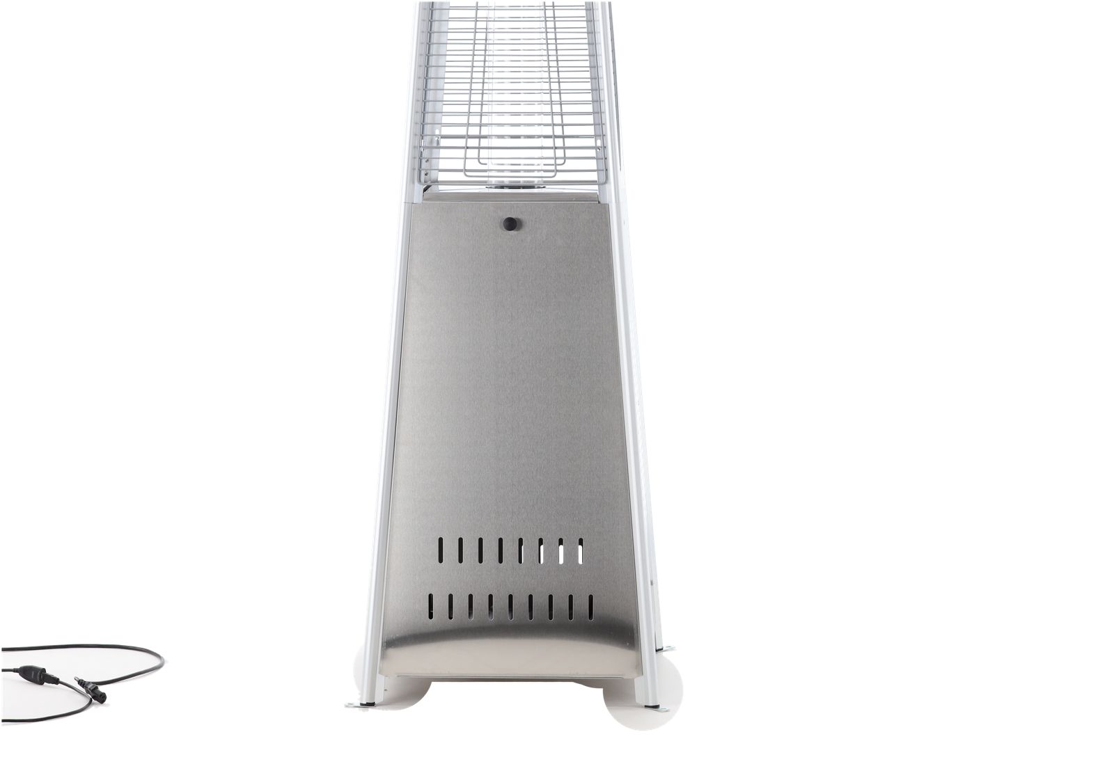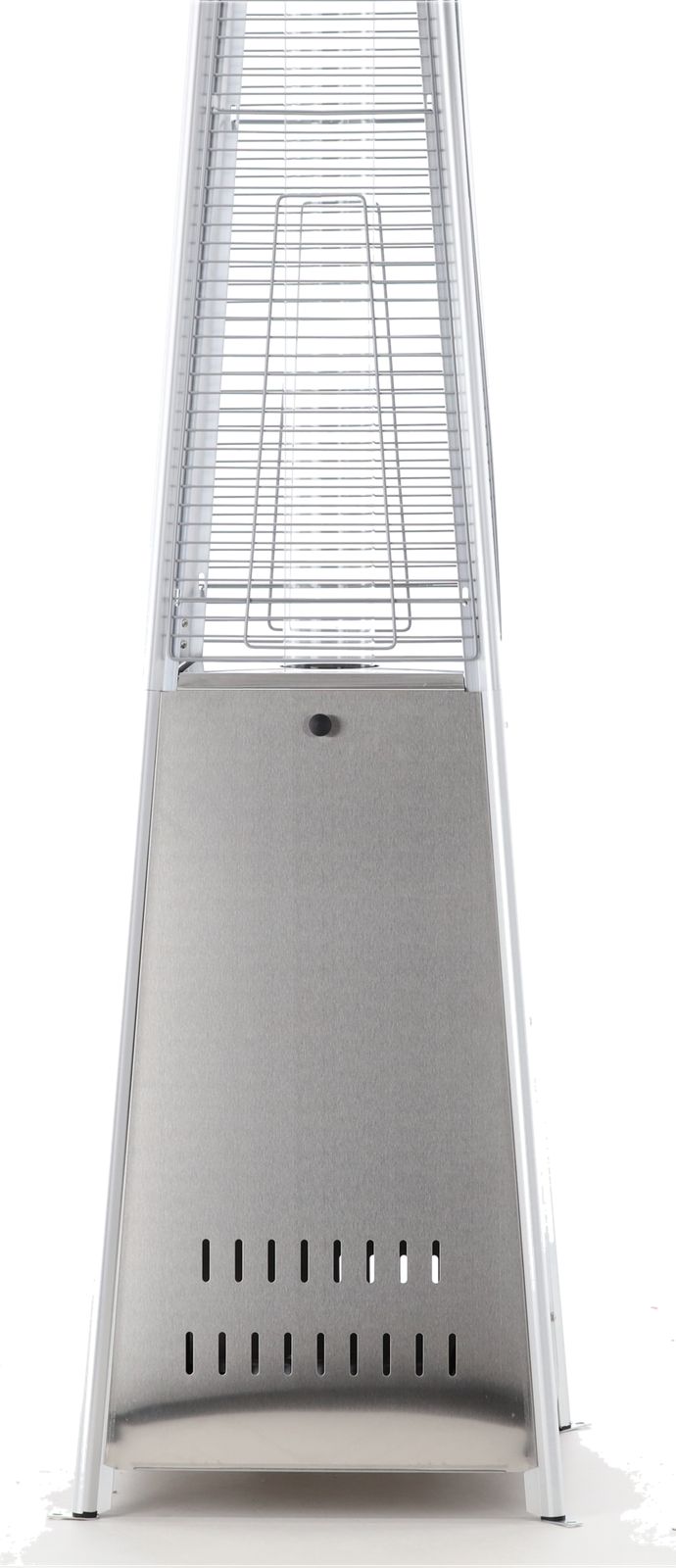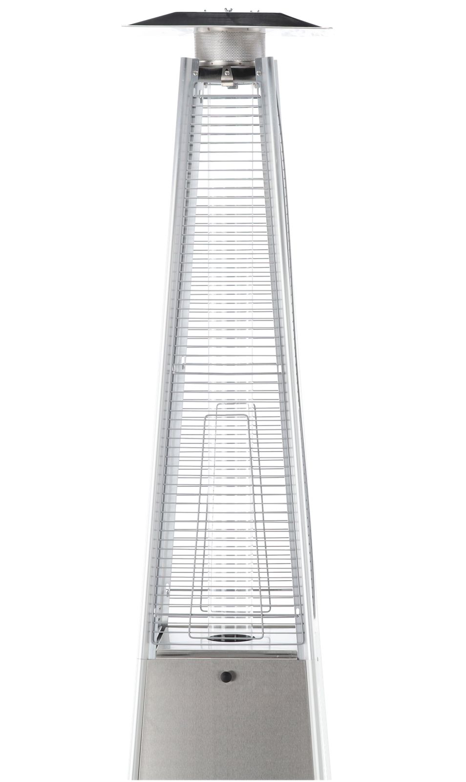 Konstrukcja o wysokości 227 cm jest stabilna i solidna. Ciężka podstawa dodatkowo chroni urządzenie przed przewróceniem. Siatka ochronna zabezpiecza płomień i sprawia, że ogrzewacz jest bezpieczny także w miejscach publicznych.