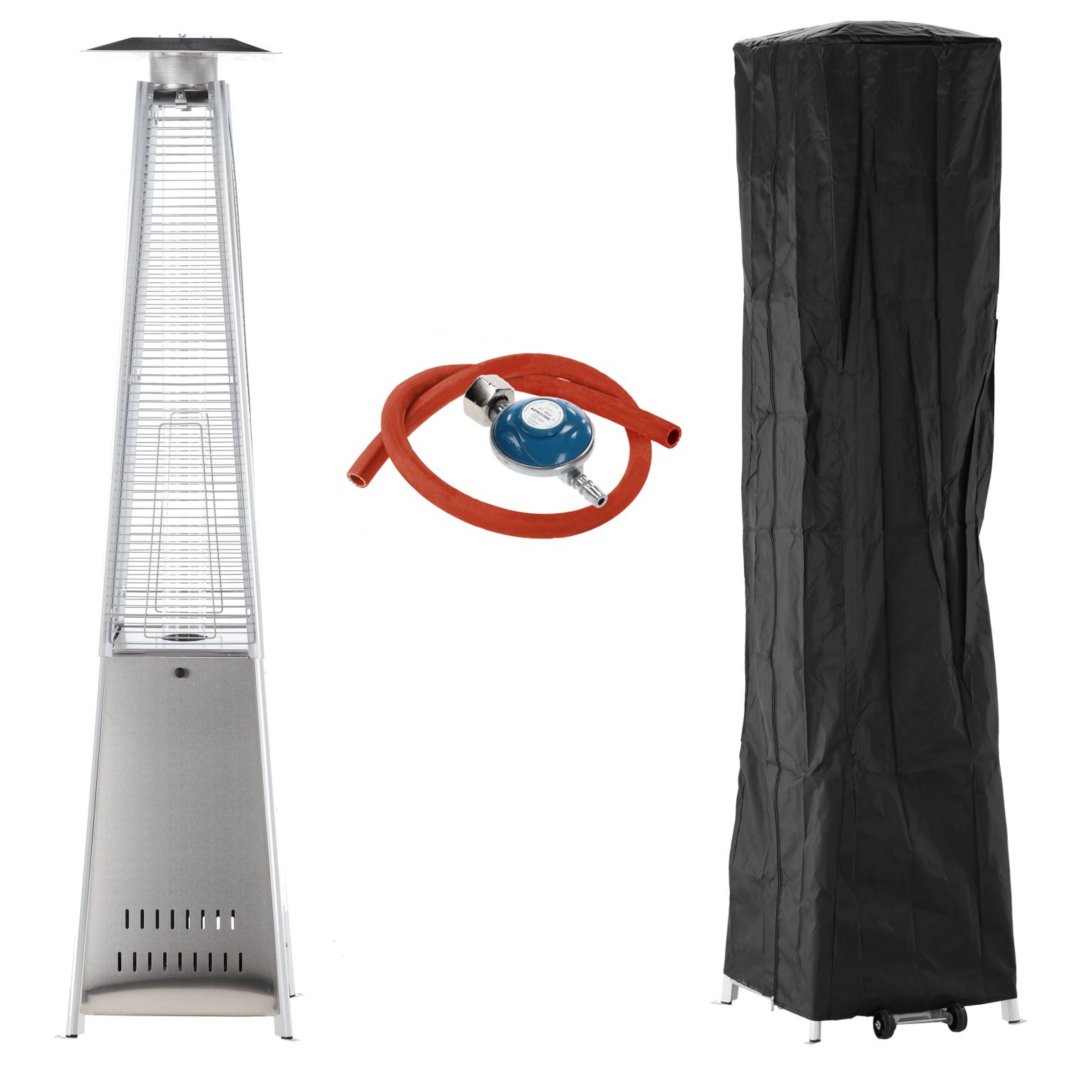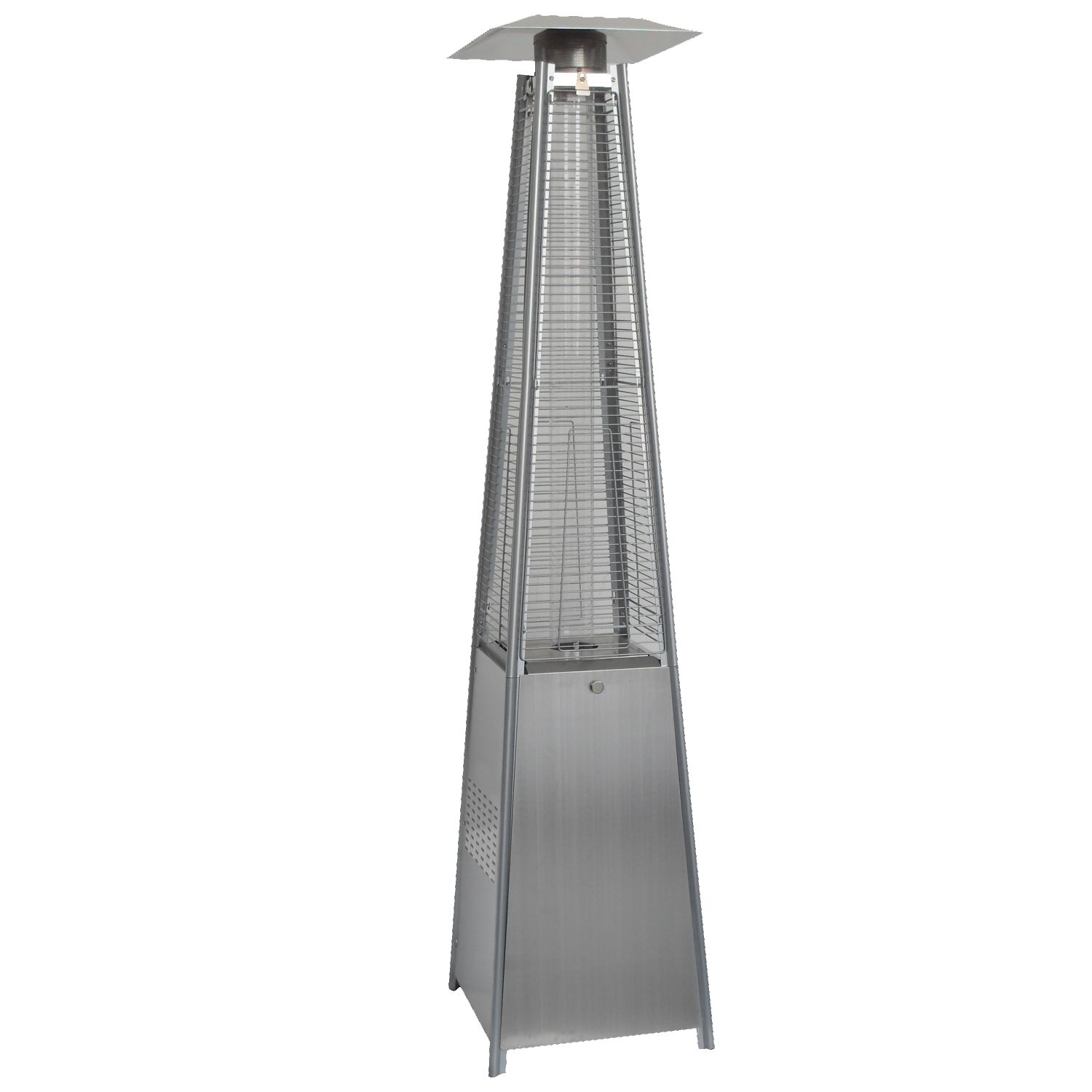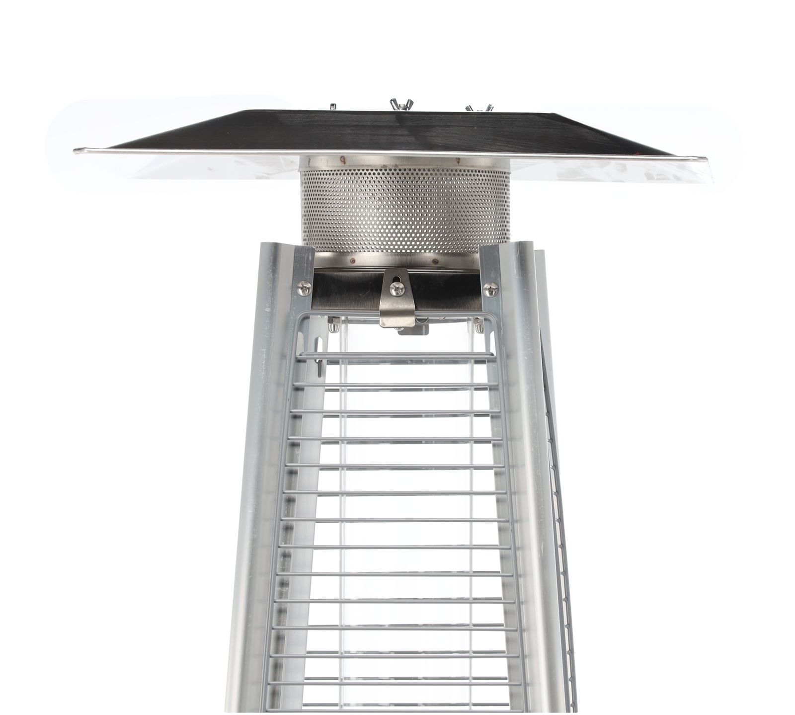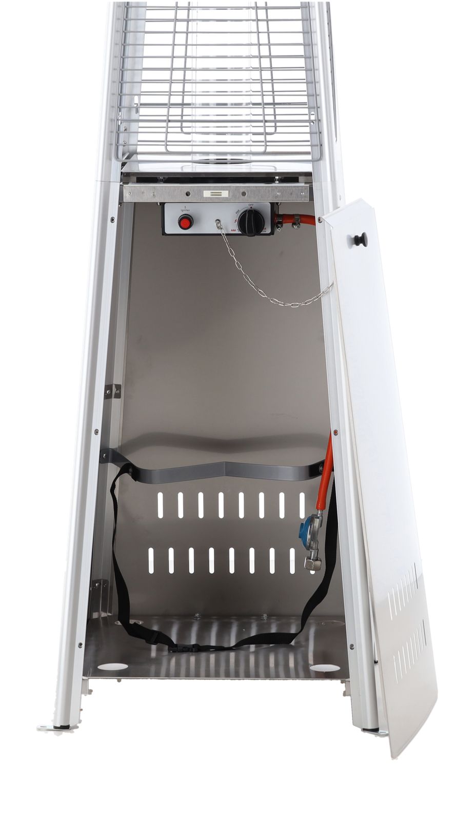 Konstrukcja o wysokości 227 cm jest stabilna i solidna. Ciężka podstawa dodatkowo chroni urządzenie przed przewróceniem. Siatka ochronna zabezpiecza płomień i sprawia, że ogrzewacz jest bezpieczny także w miejscach publicznych.