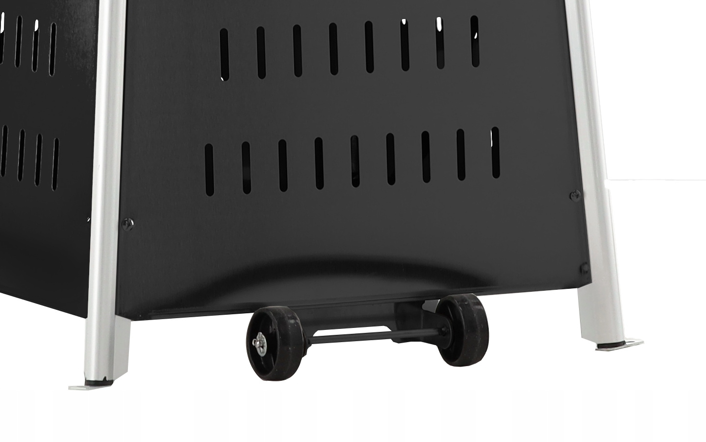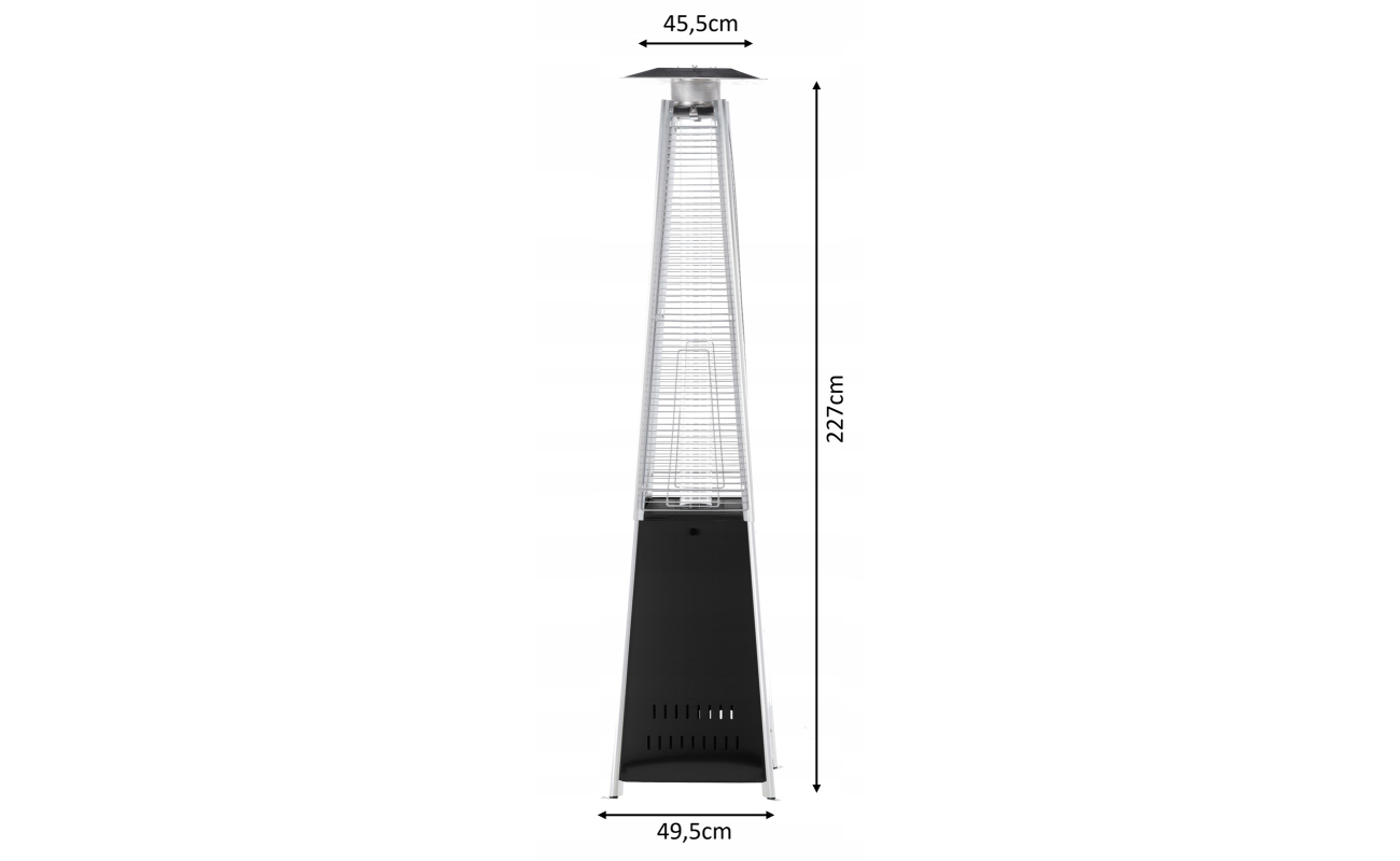 Solidna konstrukcja o wysokości 227 cm i wadze 28 kg sprawia, że ogrzewacz stoi stabilnie nawet w trudniejszych warunkach pogodowych.