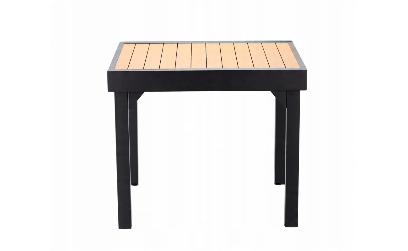 Blat wykonano z polywoodu, czyli nowoczesnego materiału imitującego drewno. Łączy on naturalny wygląd z wyjątkową odpornością na czynniki zewnętrzne. Nie chłonie wody, nie odbarwia się i nie wymaga konserwacji. Dzięki temu zachowuje swój kolor i strukturę mimo intensywnego użytkowania na słońcu i w deszczu.