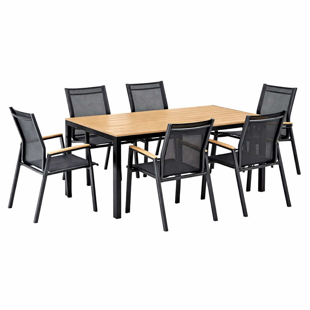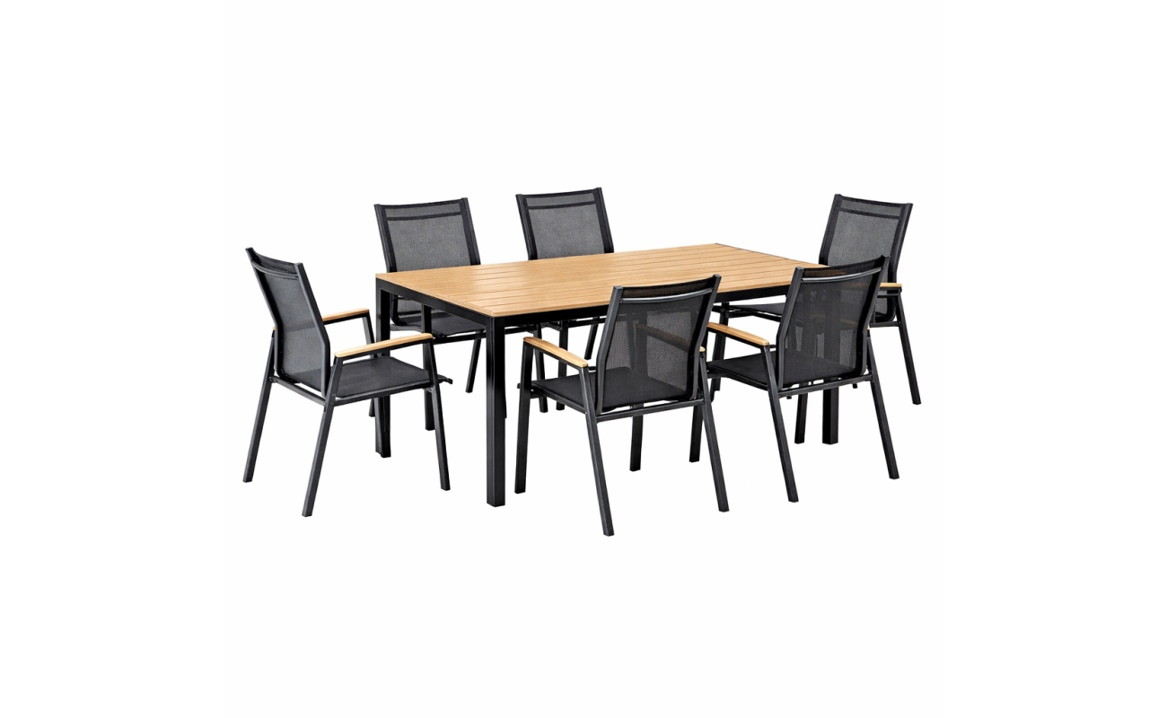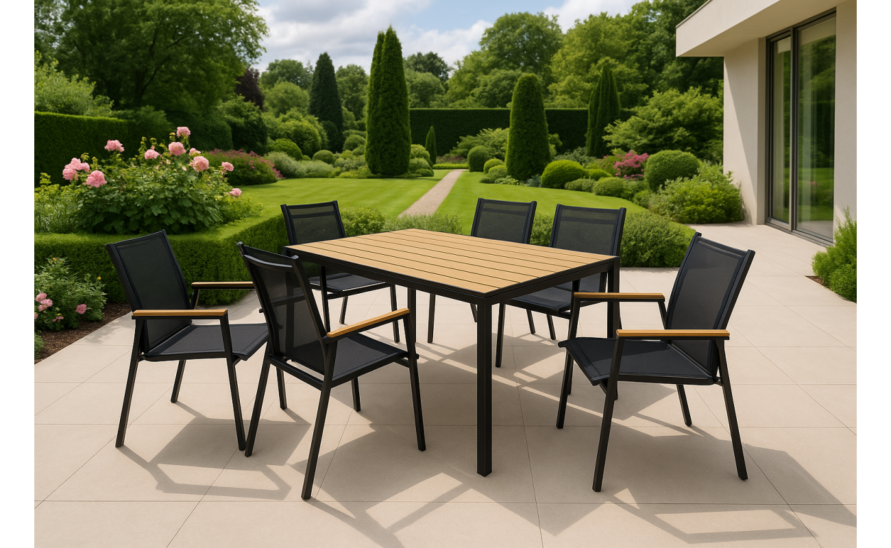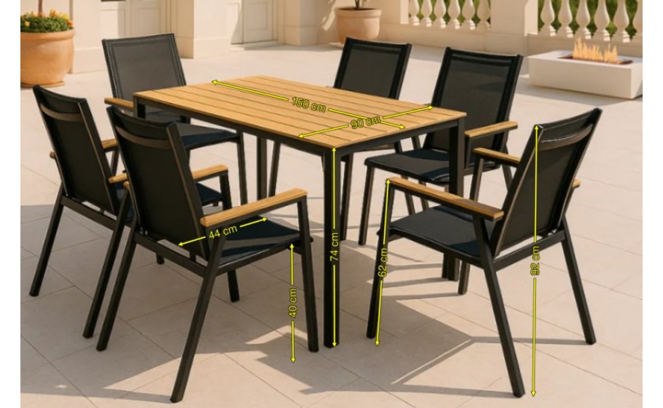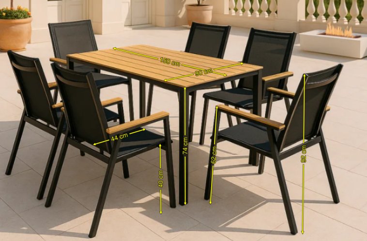 W zestawie znajduje się sześć wygodnych krzeseł z siedziskiem i oparciem z czarnej tekstyliny. Tkanina jest przewiewna i szybko schnie, dlatego idealnie nadaje się na lato. Co więcej, krzesła można sztaplować, co ułatwia ich przechowywanie poza sezonem.