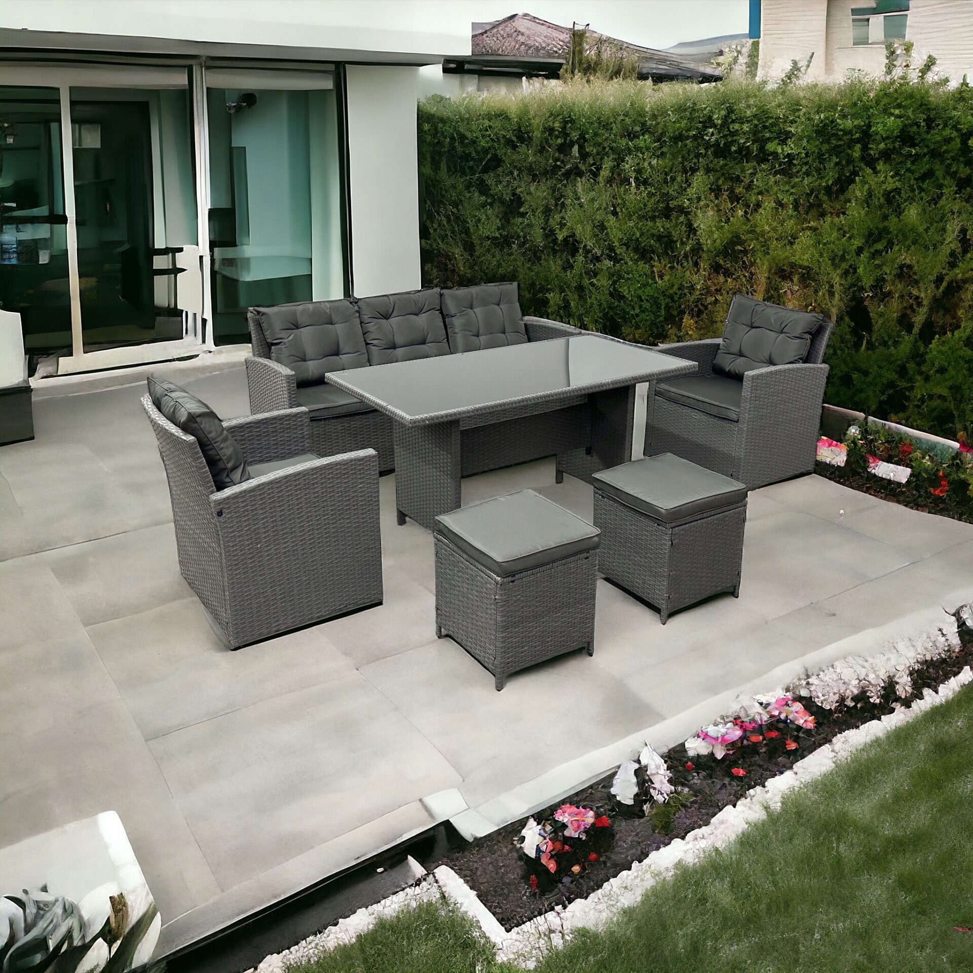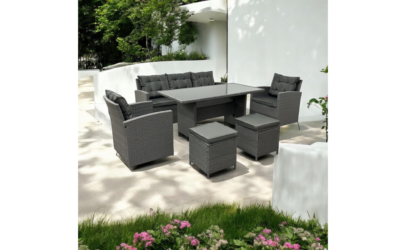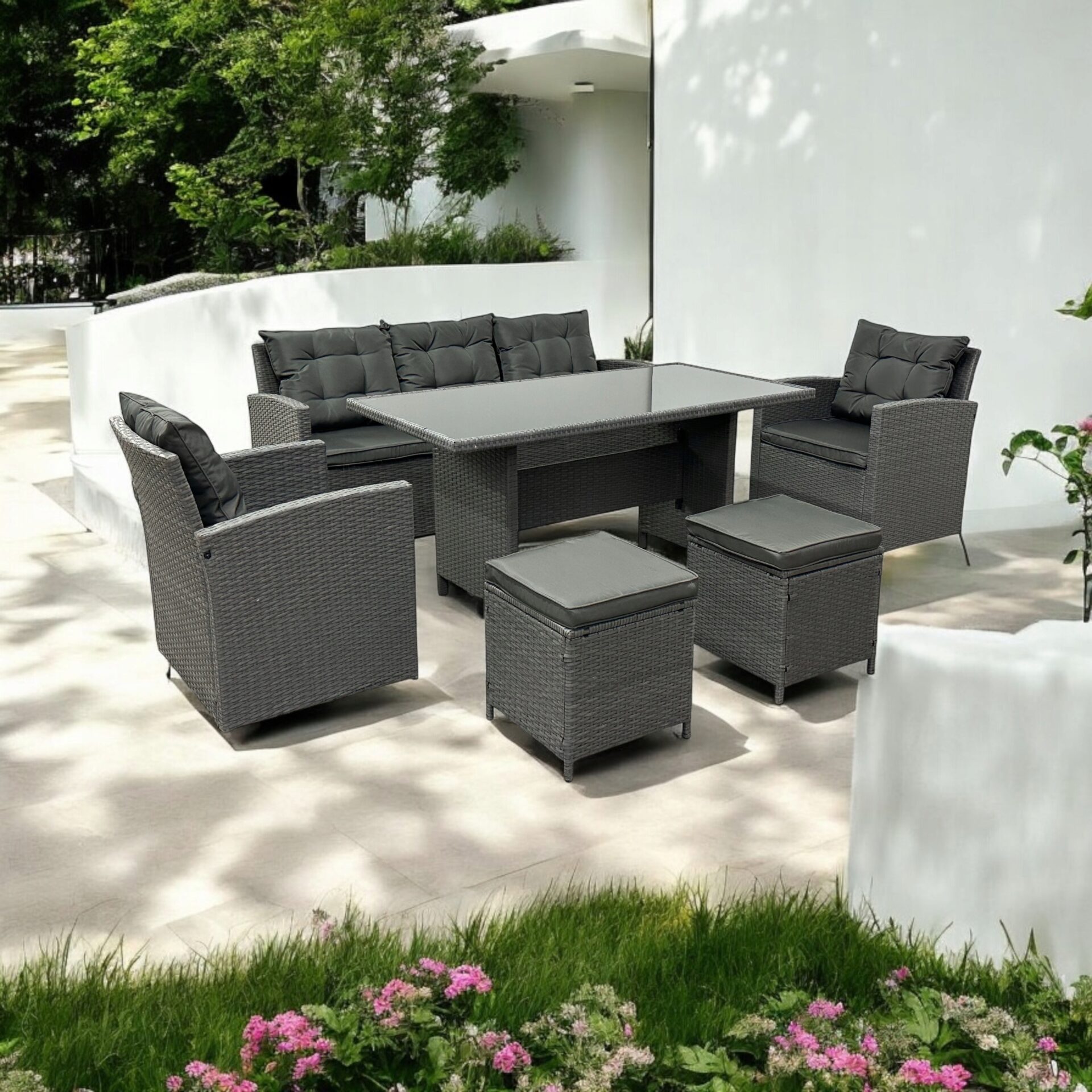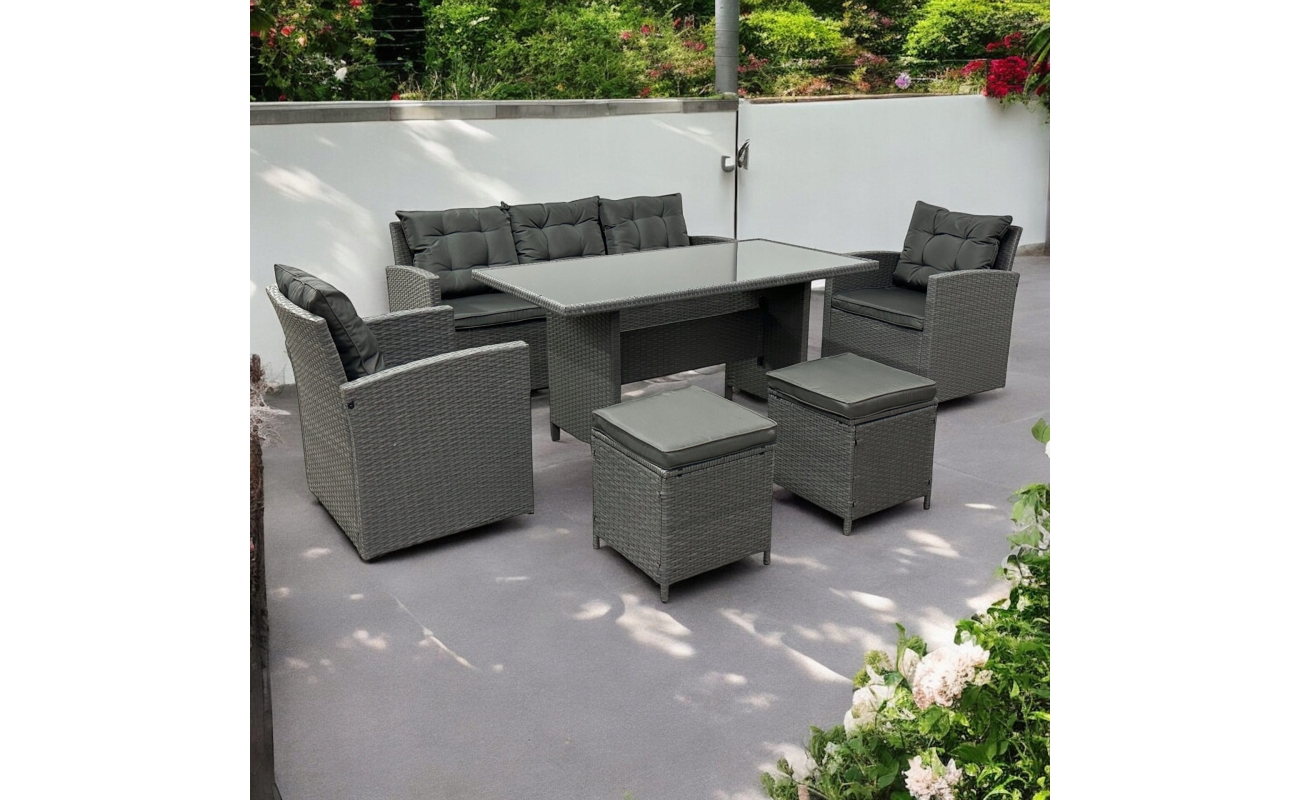 Zestaw ogrodowy technorattanowy szary Marbella to połączenie nowoczesnego wyglądu, komfortu i trwałości. Również jego neutralna kolorystyka sprawia, że łatwo wkomponować go w różne aranżacje. Dlatego jest to propozycja dla każdego, kto chce cieszyć się wygodą i estetyką bez zbędnych kompromisów.