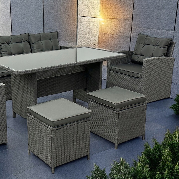 Do zestawu dołączone są grube, miękkie poduszki w zbliżonym odcieniu szarości, które zapewniają wygodę i estetyczny wygląd. Ponadto ich zdejmowane poszewki wyposażono w zamki błyskawiczne, co umożliwia szybkie pranie i łatwe utrzymanie czystości. Dzięki temu pielęgnacja kompletu nie sprawia żadnych trudności.