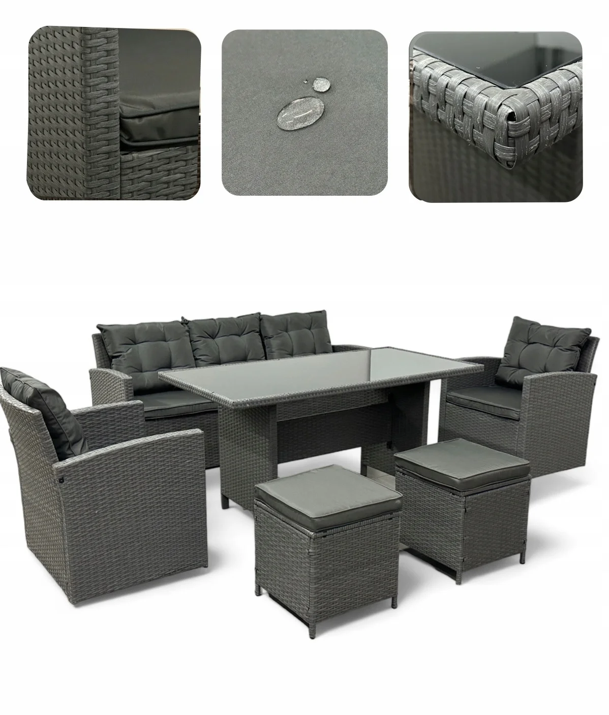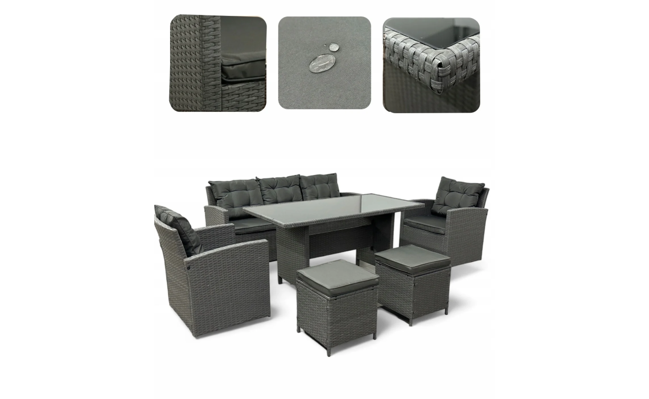 Technorattan to tworzywo odporne na promieniowanie UV, deszcz, wilgoć i zmienne temperatury. W rezultacie zestaw ogrodowy technorattanowy szary Marbella zachowuje estetyczny wygląd i właściwości użytkowe przez długi czas. Nie blaknie, nie pęka i nie odkształca się. Dlatego jest to rozwiązanie idealne dla osób, które cenią trwałość i wygodę.