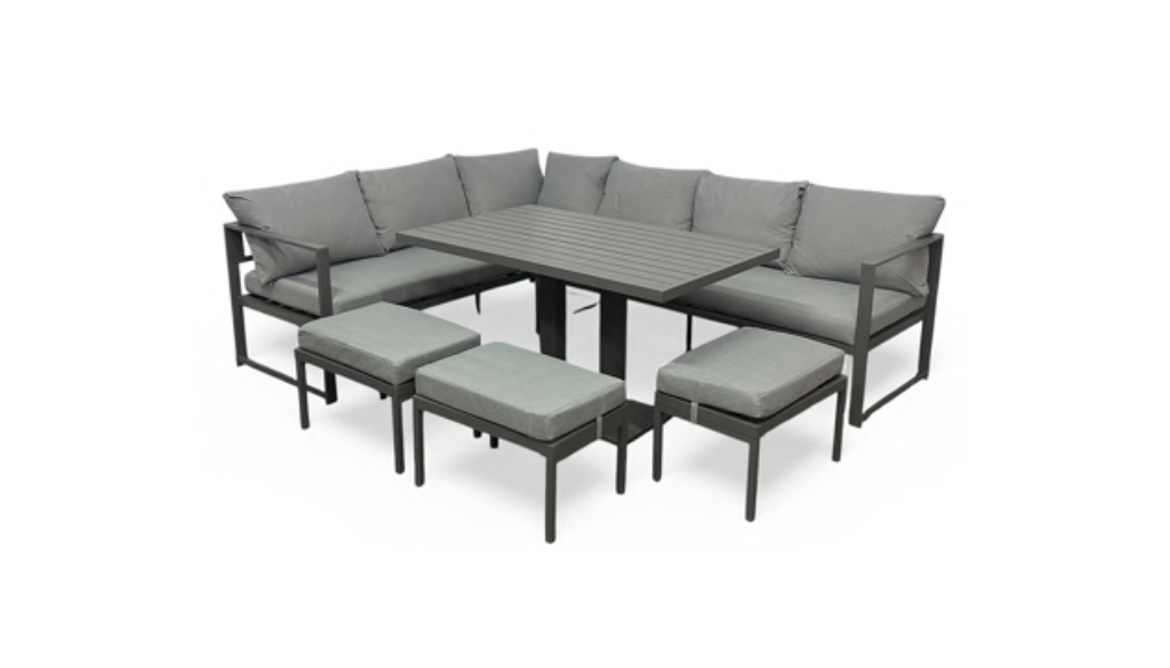 Zarówno stelaż narożnika, jak i konstrukcja stołu oraz puf zostały wykonane ze stali galwanizowanej malowanej proszkowo, co zapewnia trwałość, odporność na korozję i nowoczesny wygląd.